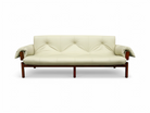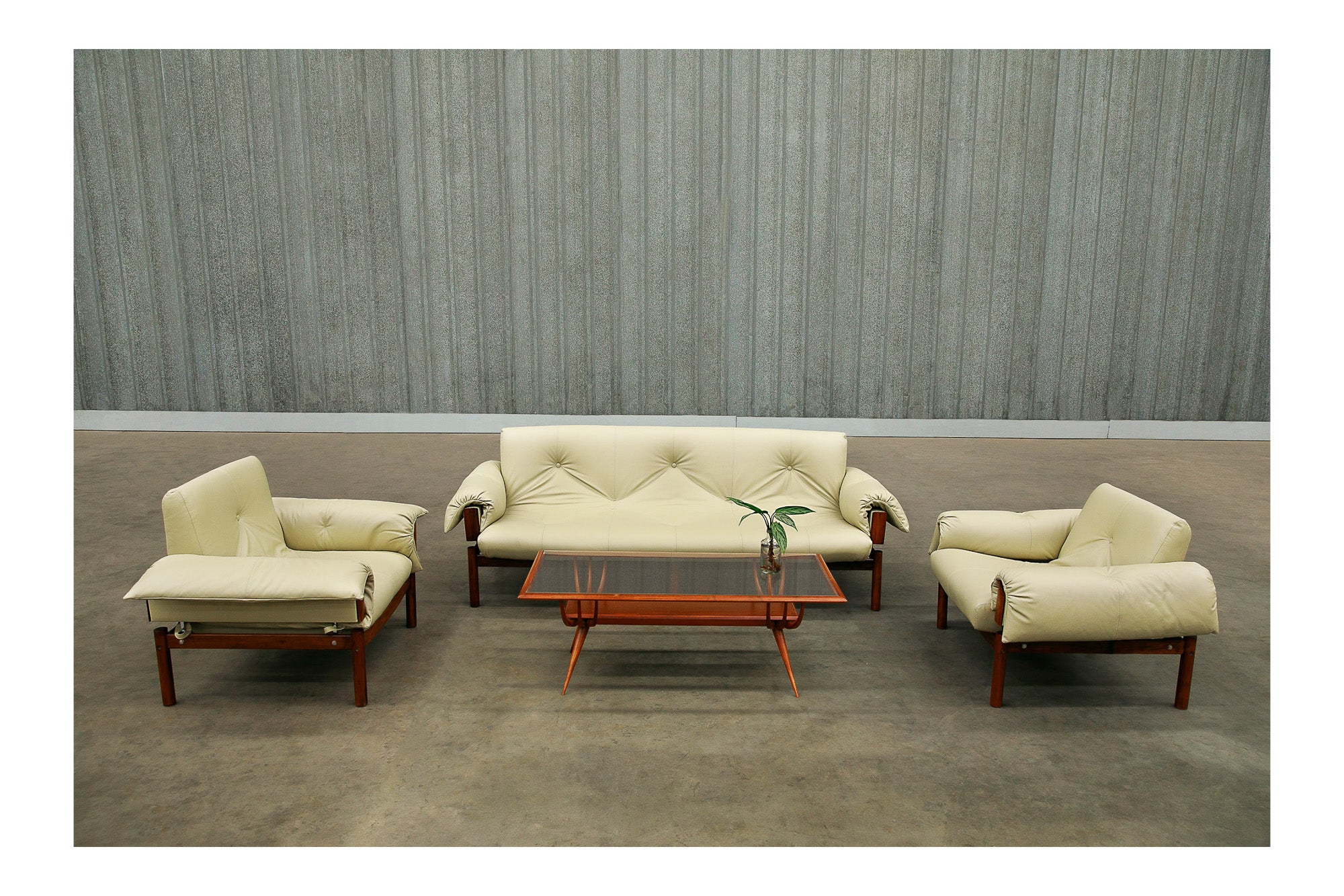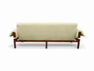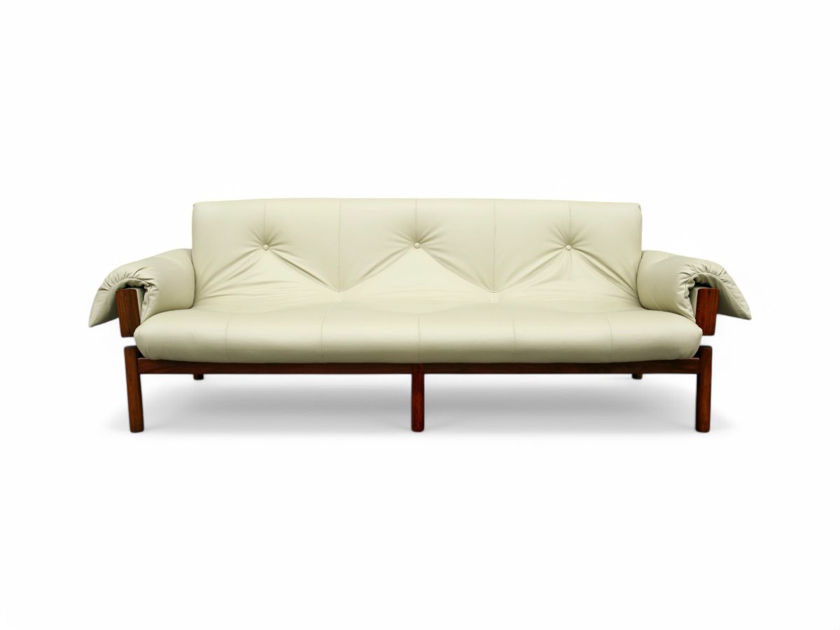 The “MP-13” sofa features a striking Brazilian rosewood frame paired with newly reupholstered beige leather cushions. The rosewood showcases a rich, intricate grain that has been expertly refinished. This sofa is in excellent condition and is the perfect choice for those seeking both comfort and elegant simplicity in their furniture.