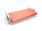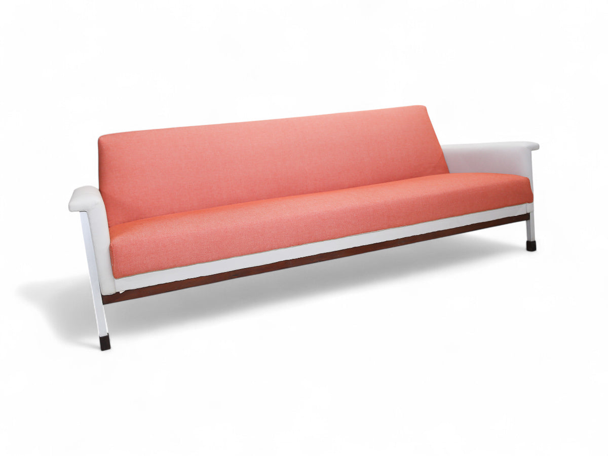 This sofa features an iron frame that provides structural support. The seat and backrest have been reupholstered with a distinctive pink and white fabric, giving the sofa a unique appearance. Additionally, the backrest can be fully reclined, transforming the sofa into a flat position suitable for use as a bed. Following refinishing, the sofa-bed is in excellent condition, ensuring both functionality and aesthetic appeal.