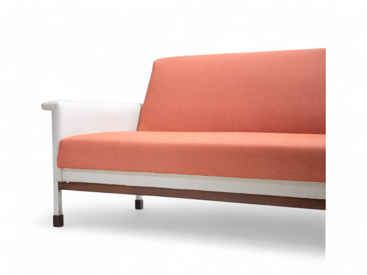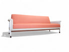 This sofa features an iron frame that provides structural support. The seat and backrest have been reupholstered with a distinctive pink and white fabric, giving the sofa a unique appearance. Additionally, the backrest can be fully reclined, transforming the sofa into a flat position suitable for use as a bed. Following refinishing, the sofa-bed is in excellent condition, ensuring both functionality and aesthetic appeal.