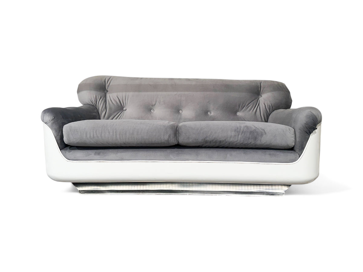 This "VIP" loveseat was originally designed to meet the demands of Brazil's expanding office furniture market in the 1970s. It comfortably accommodates two people and is constructed with a fiberglass frame, complemented by new and sleek gray ultra-suede upholstery. Renowned for its comfort and aesthetic appeal, this sofa is not only well-designed but also adds a touch of elegance to any home interior. It stands as a perfect choice for those seeking both style and comfort in their living spaces.