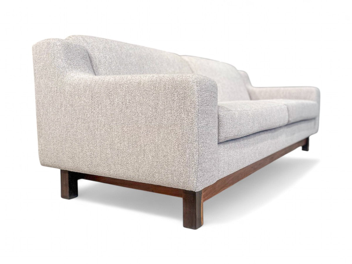 This sofa is crafted from Brazilian rosewood (jacaranda) and upholstered in a grey soft boucle. The seats have been reupholstered by a team with over 40 years of experience, previously working with Sergio Rodrigues. The wood has been refinished to highlight its colorful veins. Despite showing signs of age that add character, the sofa remains in excellent condition.
