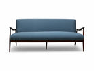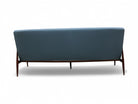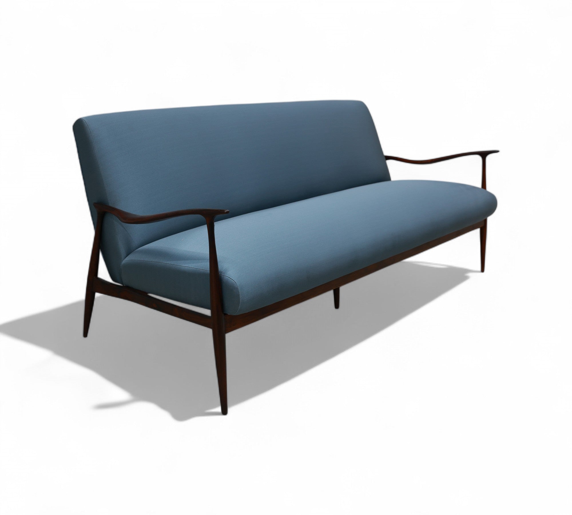 This three-seater sofa, designed by Giuseppe Scapinelli in the 1950s, showcases a solid Brazilian rosewood (jacaranda) frame, renowned for its rich, deep hue. The armrests are elegantly sculptural, adding a sophisticated touch to the design. The original wood has been meticulously refinished by our expert artisans to highlight its natural beauty. The upholstery in a striking blue shade is new, complementing the luxurious aesthetic of the sofa.