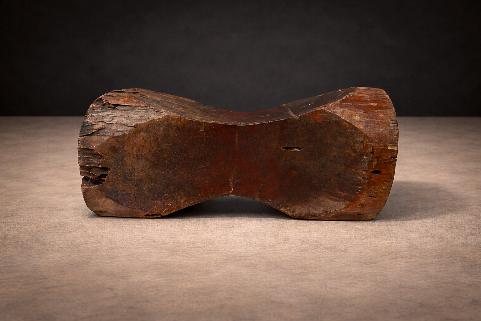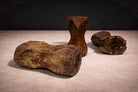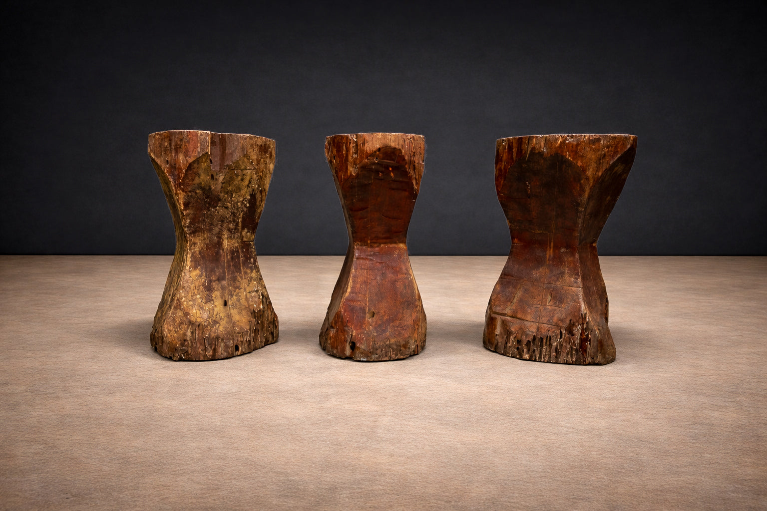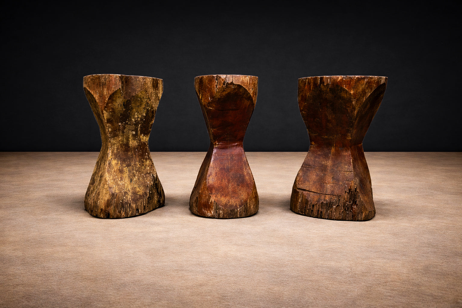 Pequi’s tonal range—warm ambers, deep browns, and organic surface fissures—animates each piece uniquely. Rather than concealing imperfections, the carving process integrates knots, voids, and grain shifts into the overall composition, reinforcing the work’s structural honesty. The stools present in excellent condition, with surfaces that preserve both texture and patina.
