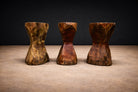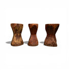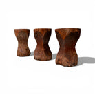 Each stool is carved from a single block of pequi hardwood, retaining the density, irregularity, and expressive surface of the material. The silhouettes are defined by a subtle hourglass profile: flat planes at the top and base anchor the composition, while the central section is carved inward, creating a measured concavity that lightens the visual mass. Tool marks and natural variations remain visible, underscoring the dialogue between raw material and controlled intervention.
