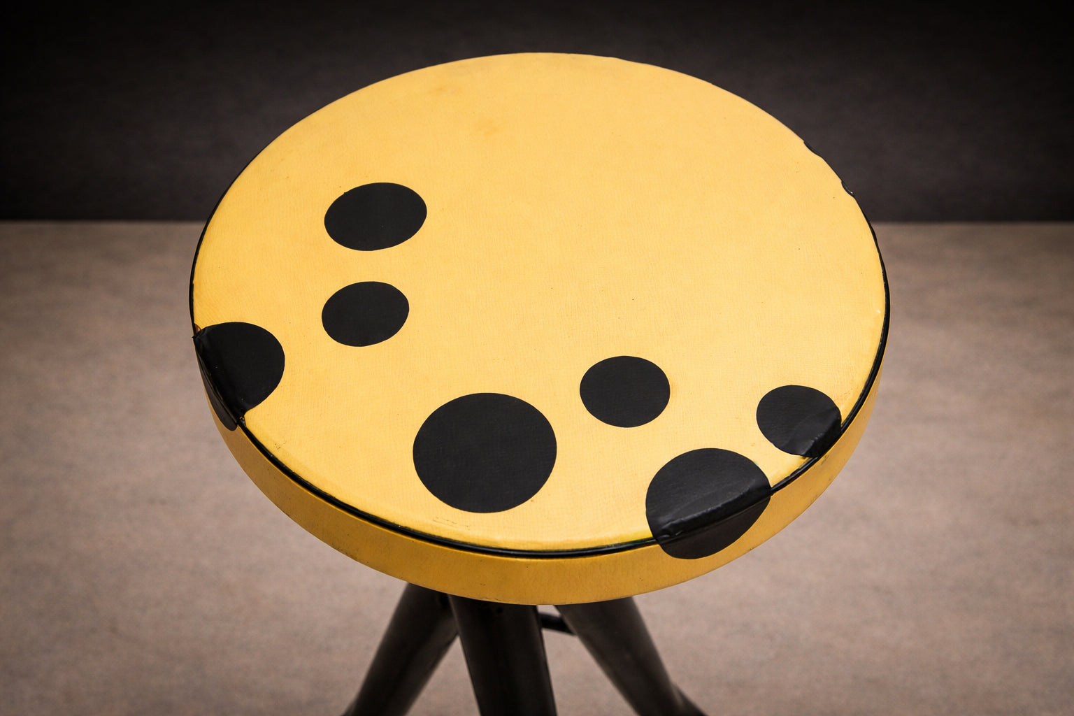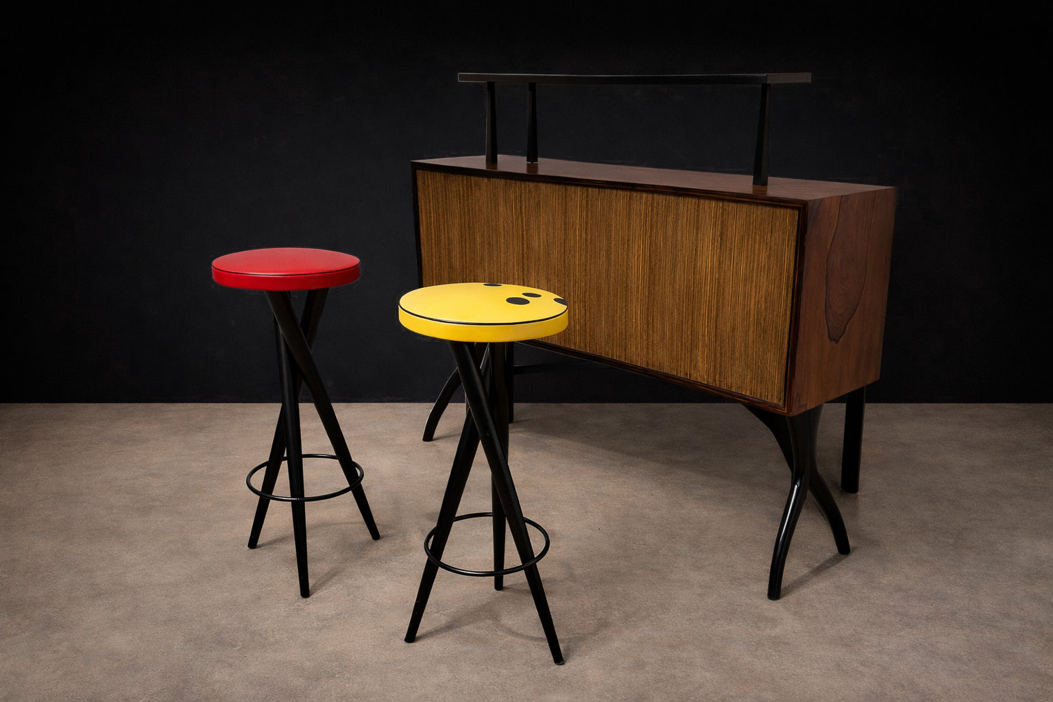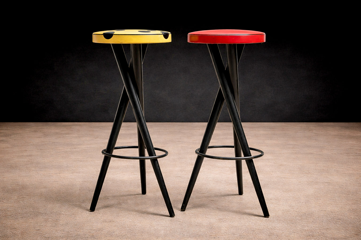 The design is defined by slender, intersecting legs that converge into a stable, tripod-like stance, reinforced by a circular footrest that anchors the composition. This structural logic introduces both lightness and tension, allowing the stools to read as architectural forms rather than purely utilitarian seating. The contrasting seat treatments—one in red leatherette, the other in yellow leatherette with black polka dots—introduce asymmetry while maintaining formal cohesion.