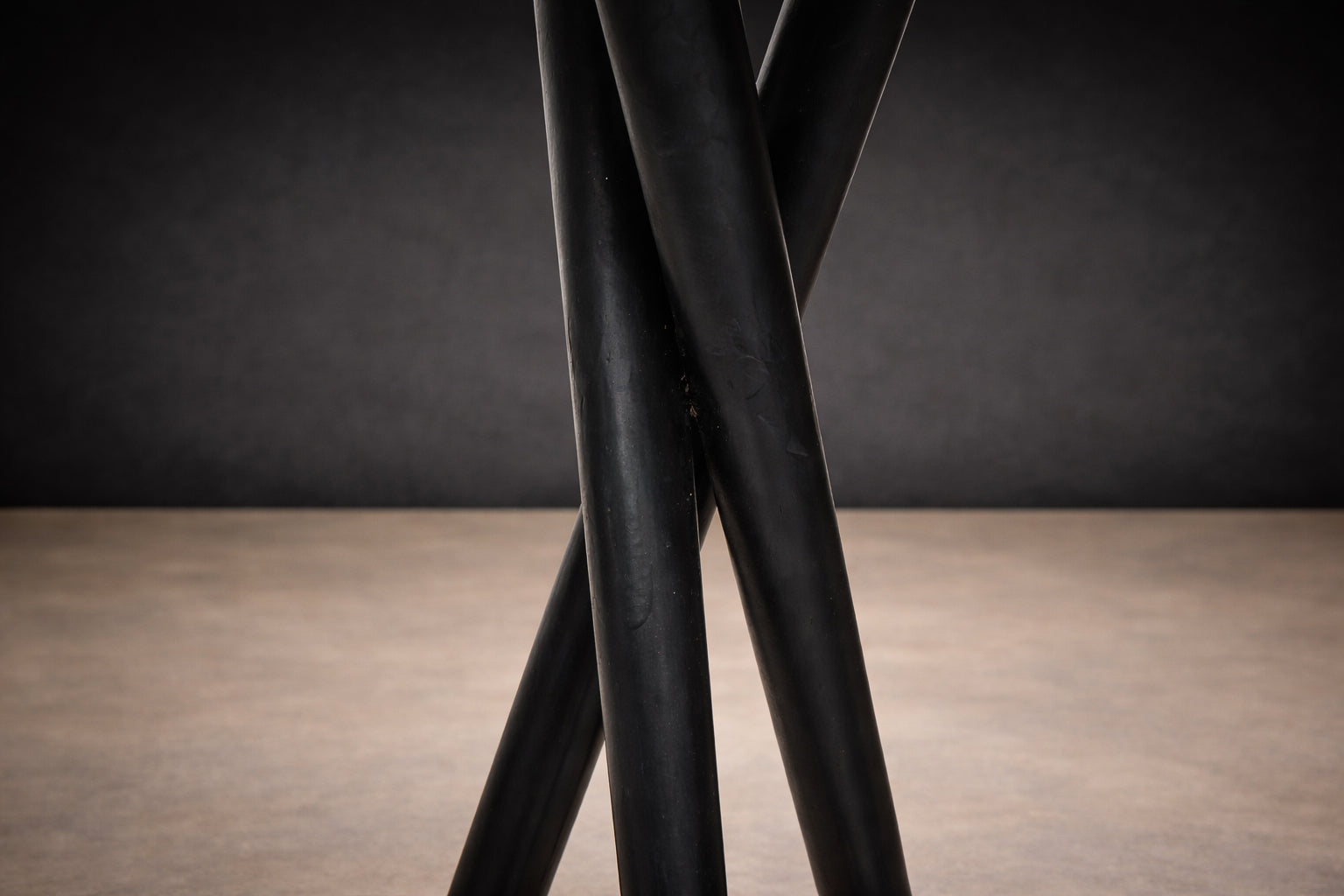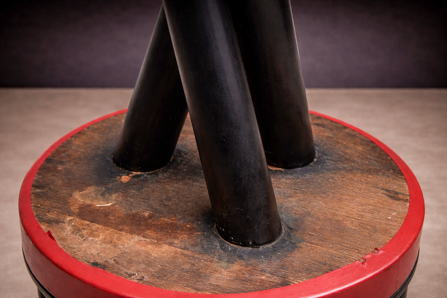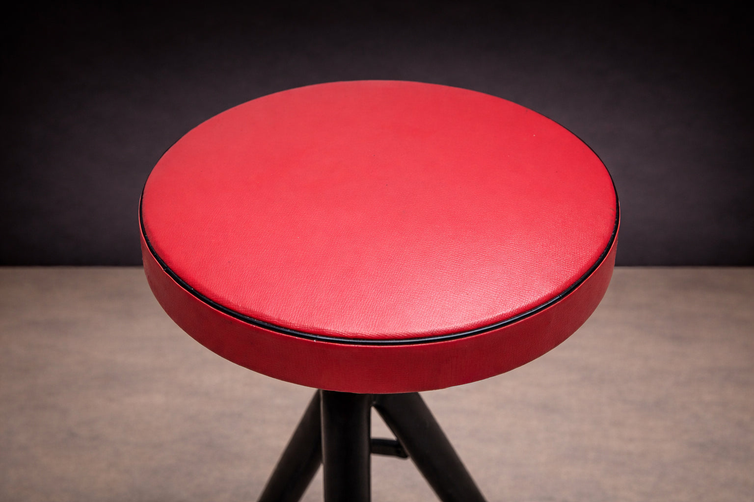 The design is defined by slender, intersecting legs that converge into a stable, tripod-like stance, reinforced by a circular footrest that anchors the composition. This structural logic introduces both lightness and tension, allowing the stools to read as architectural forms rather than purely utilitarian seating. The contrasting seat treatments—one in red leatherette, the other in yellow leatherette with black polka dots—introduce asymmetry while maintaining formal cohesion.