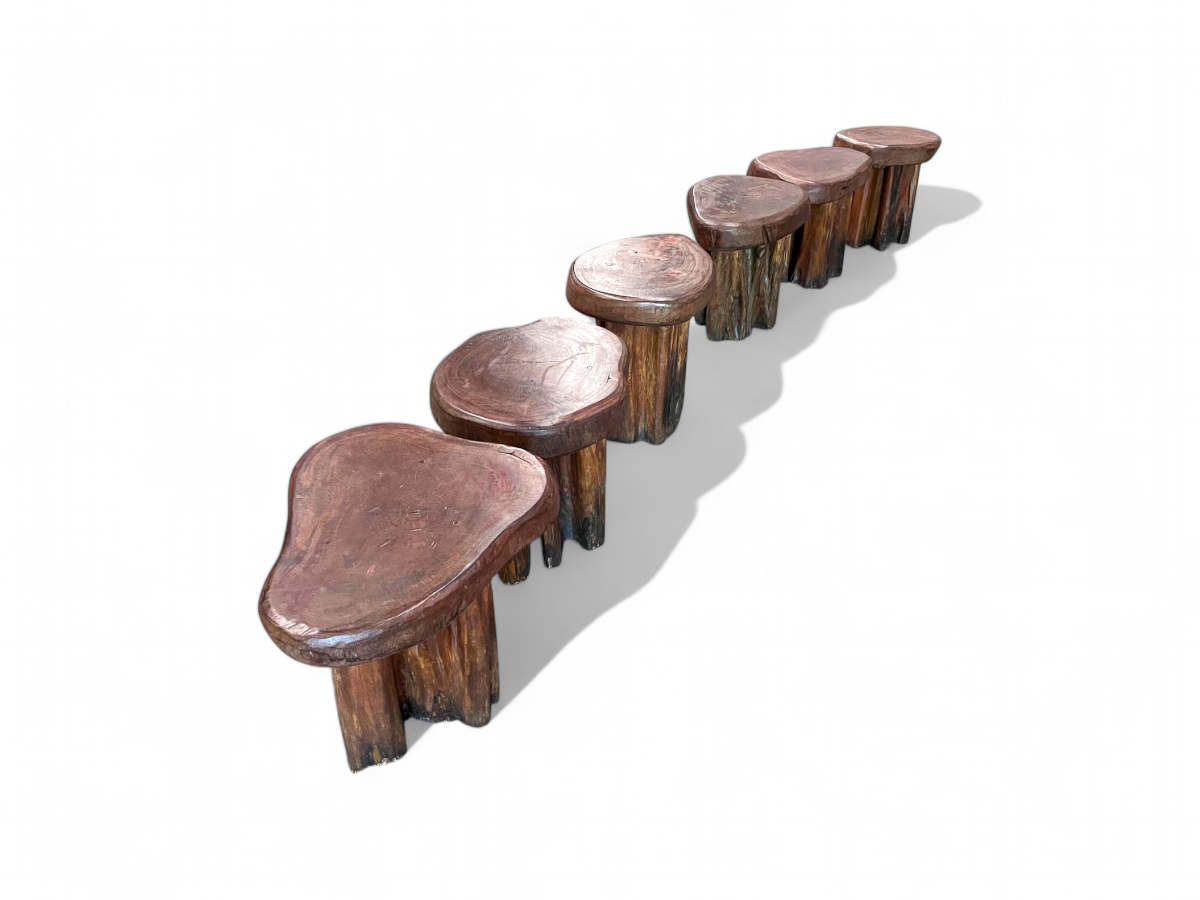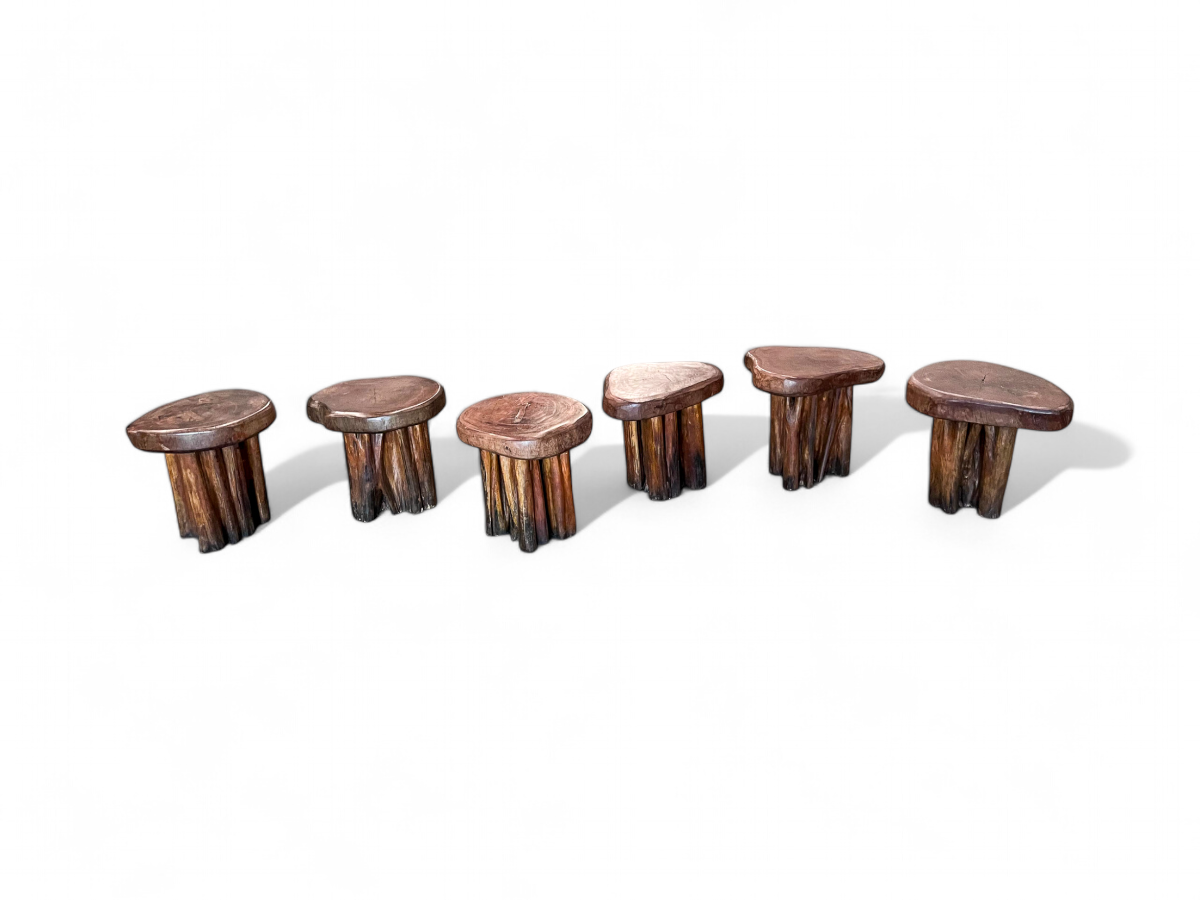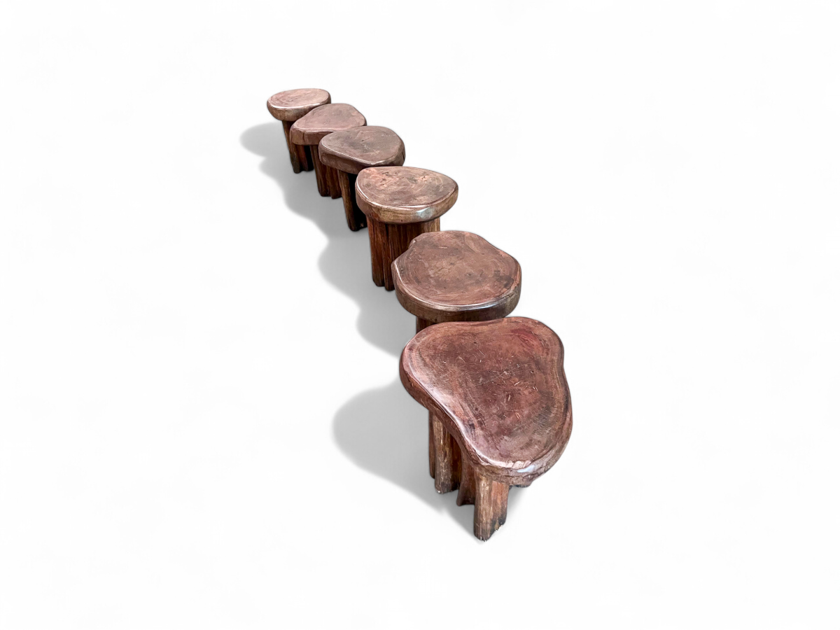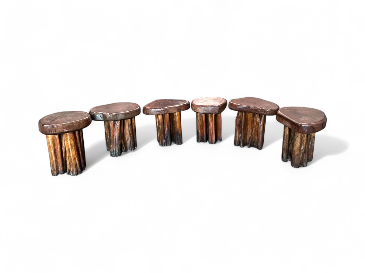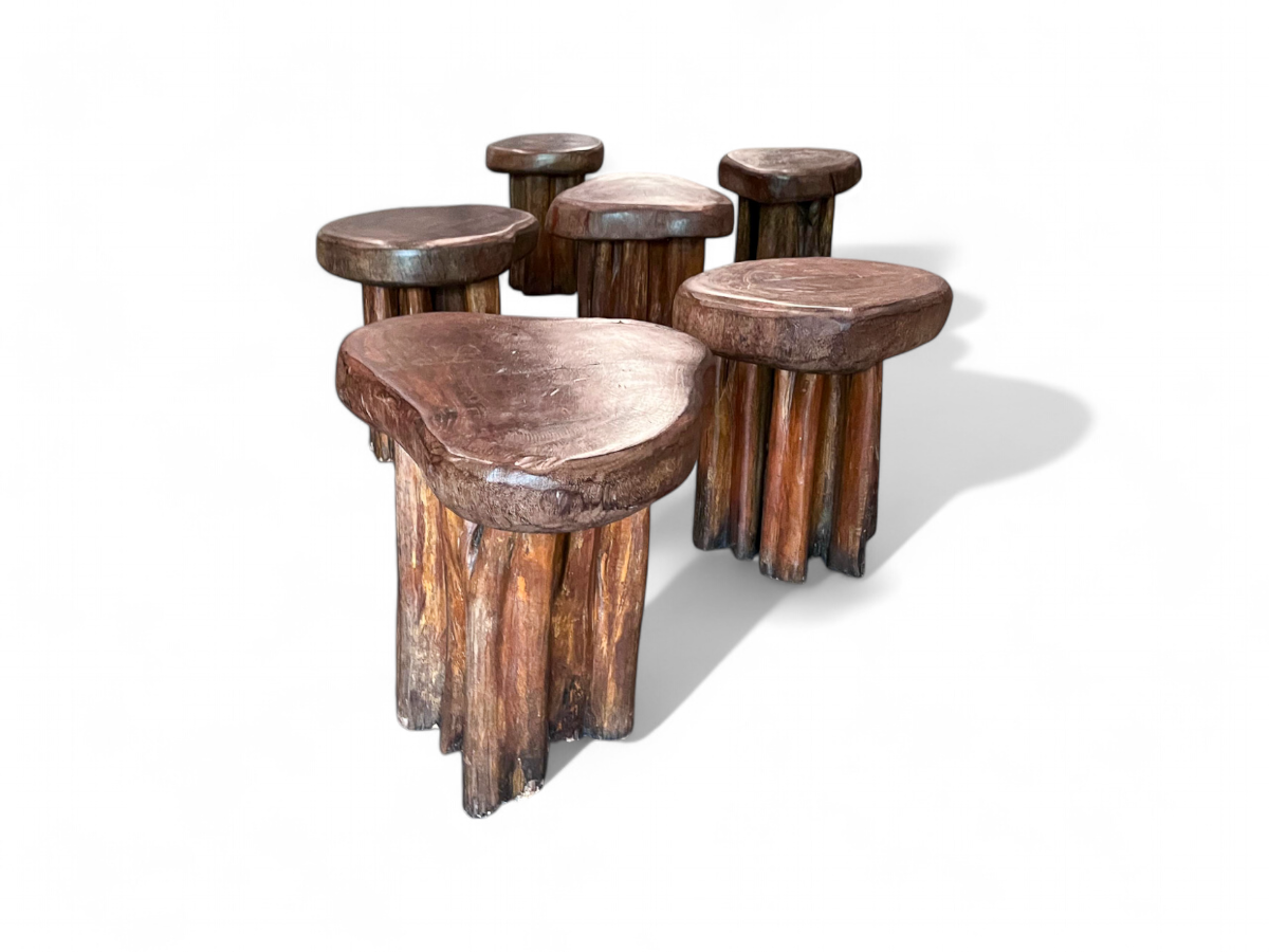 Author Unknown - A vintage set of six sculptural stools, meticulously handcrafted from tree trunks and featuring organic shapes. This furniture style, known as "Denuncia," originated in Brazil during the 1970s to highlight the issue of deforestation in the Atlantic Forest (Mata Atlântica). Importantly, the wood used for these stools comes from repurposed materials that would have otherwise been discarded. The stools have been polished, cleaned, and are in excellent condition. Additionally, there is a matching table available as lot 764 as is shown in the last two images.