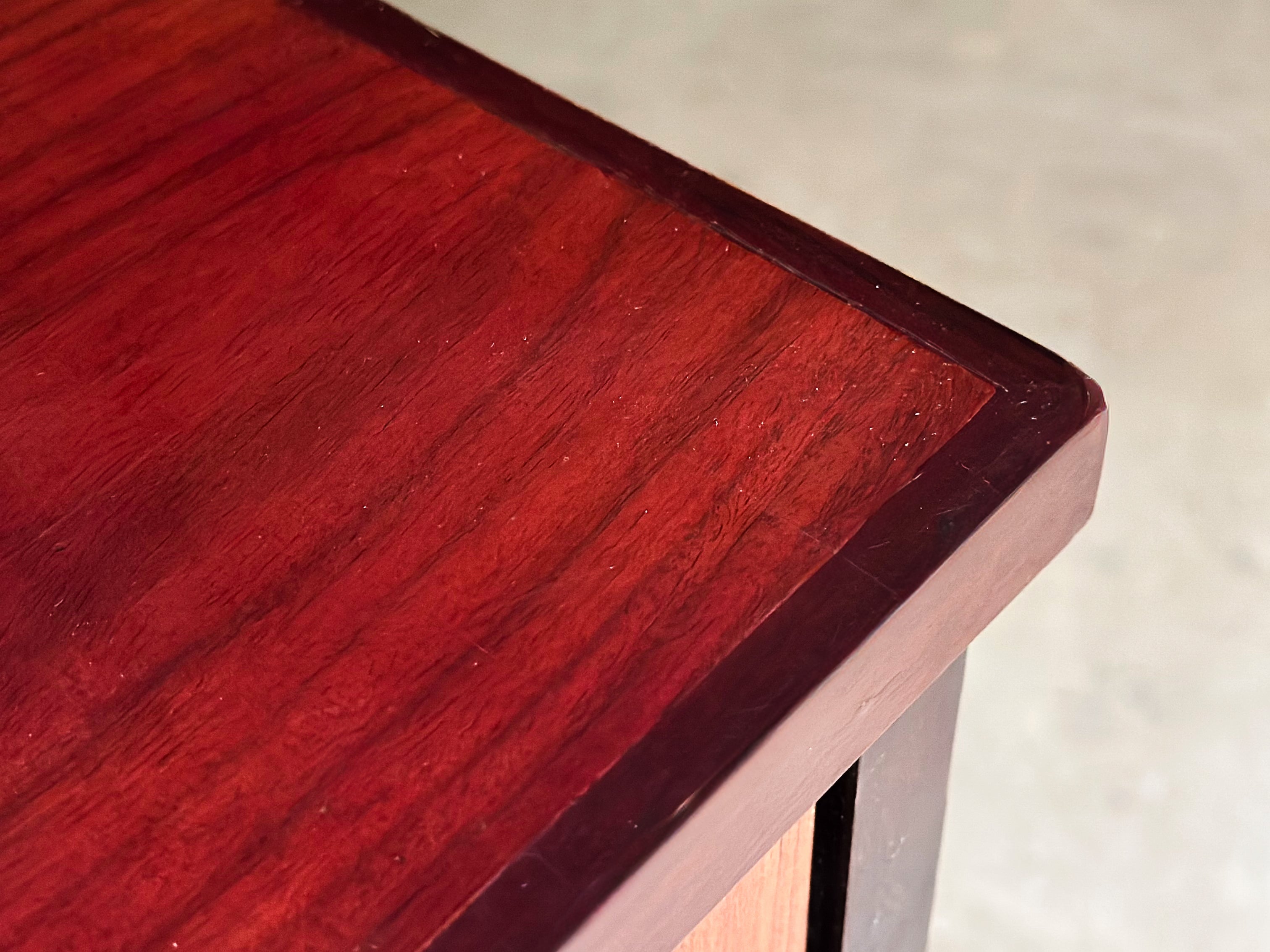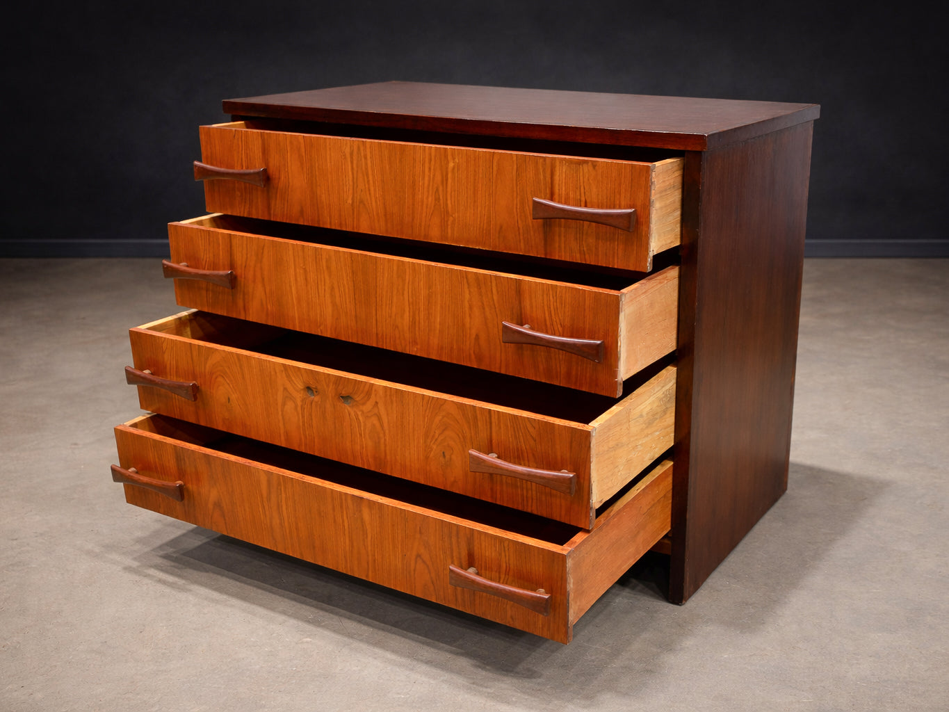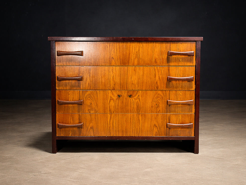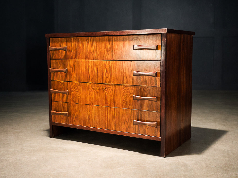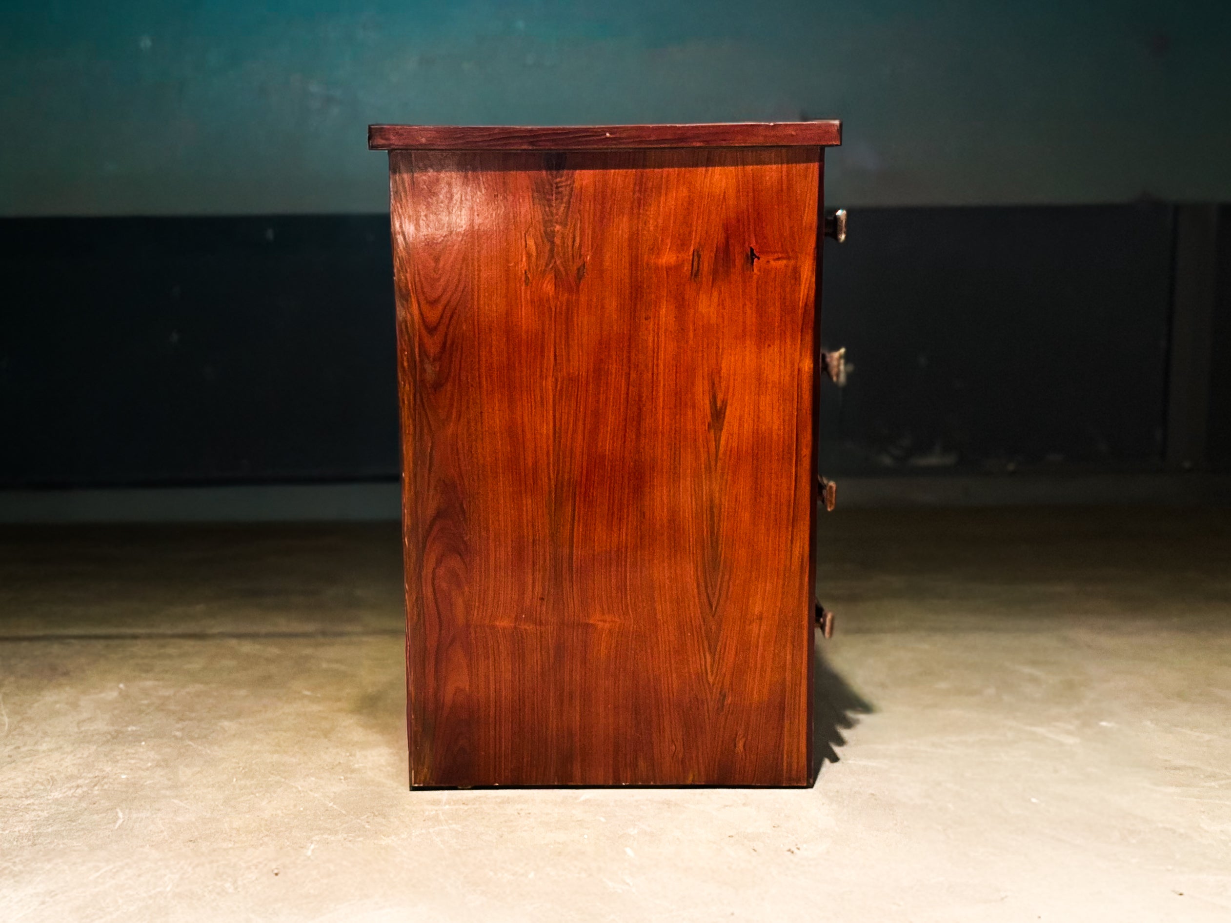 The four-drawer composition is disciplined and architectural, softened by sculpted wooden pulls integrated directly into the façade. Carefully refinished, the caviúna reveals its deep chromatic range and organic grain, long prized in Brazilian modern production. Unattributed yet unmistakably of its time, this piece embodies a design culture built on intelligence rather than authorship.