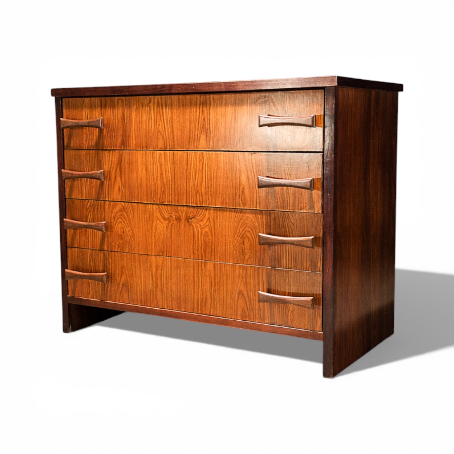 Crafted in caviúna wood during the 1950s, this chest of drawers reflects the postwar moment when Brazilian furniture design matured into a confident modern language. As architects and designers in São Paulo embraced rational planning and modernist ideals—parallel to the rise of Brasília—cabinetmakers translated these principles into domestic furniture defined by proportion, function, and noble materials.
