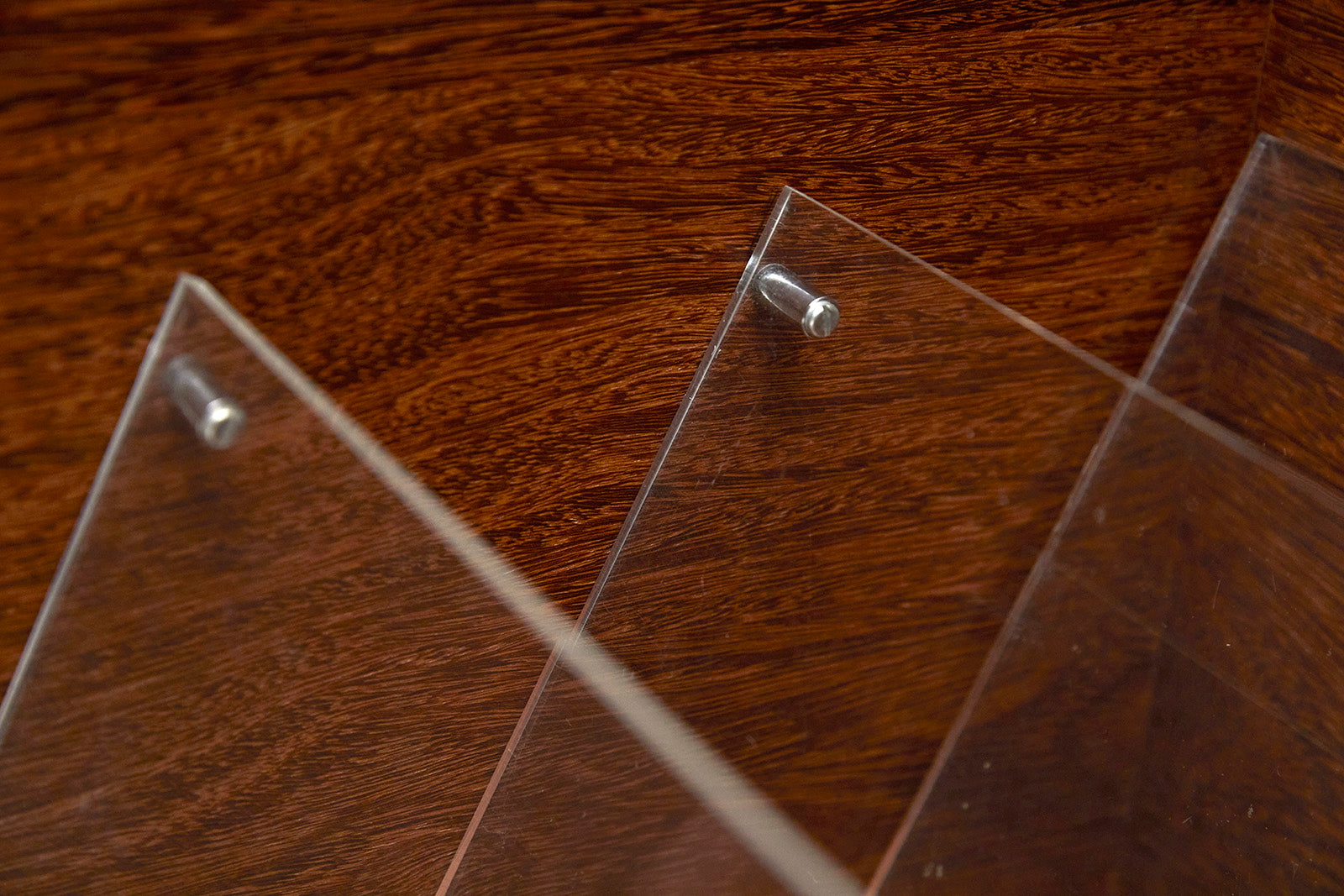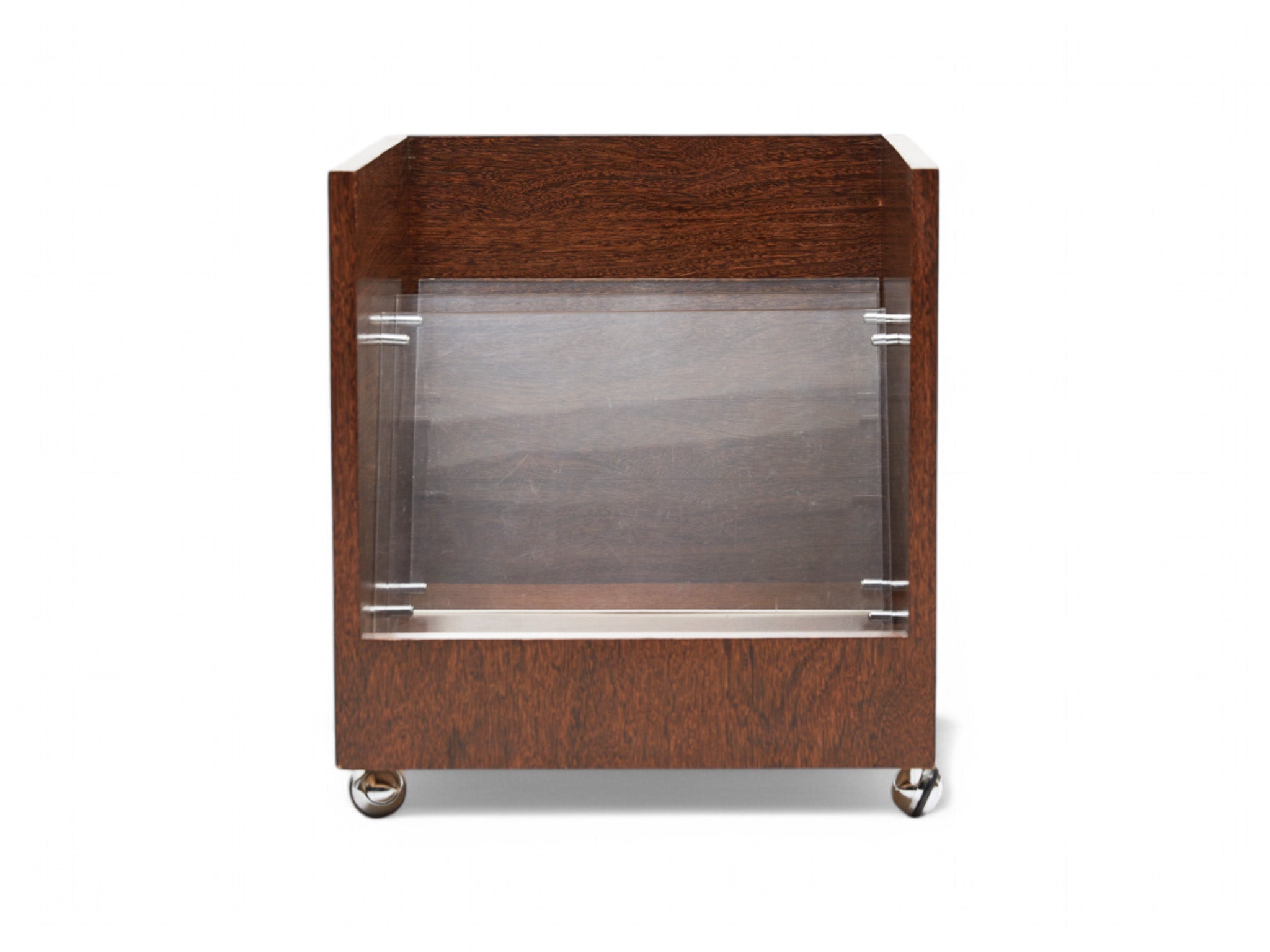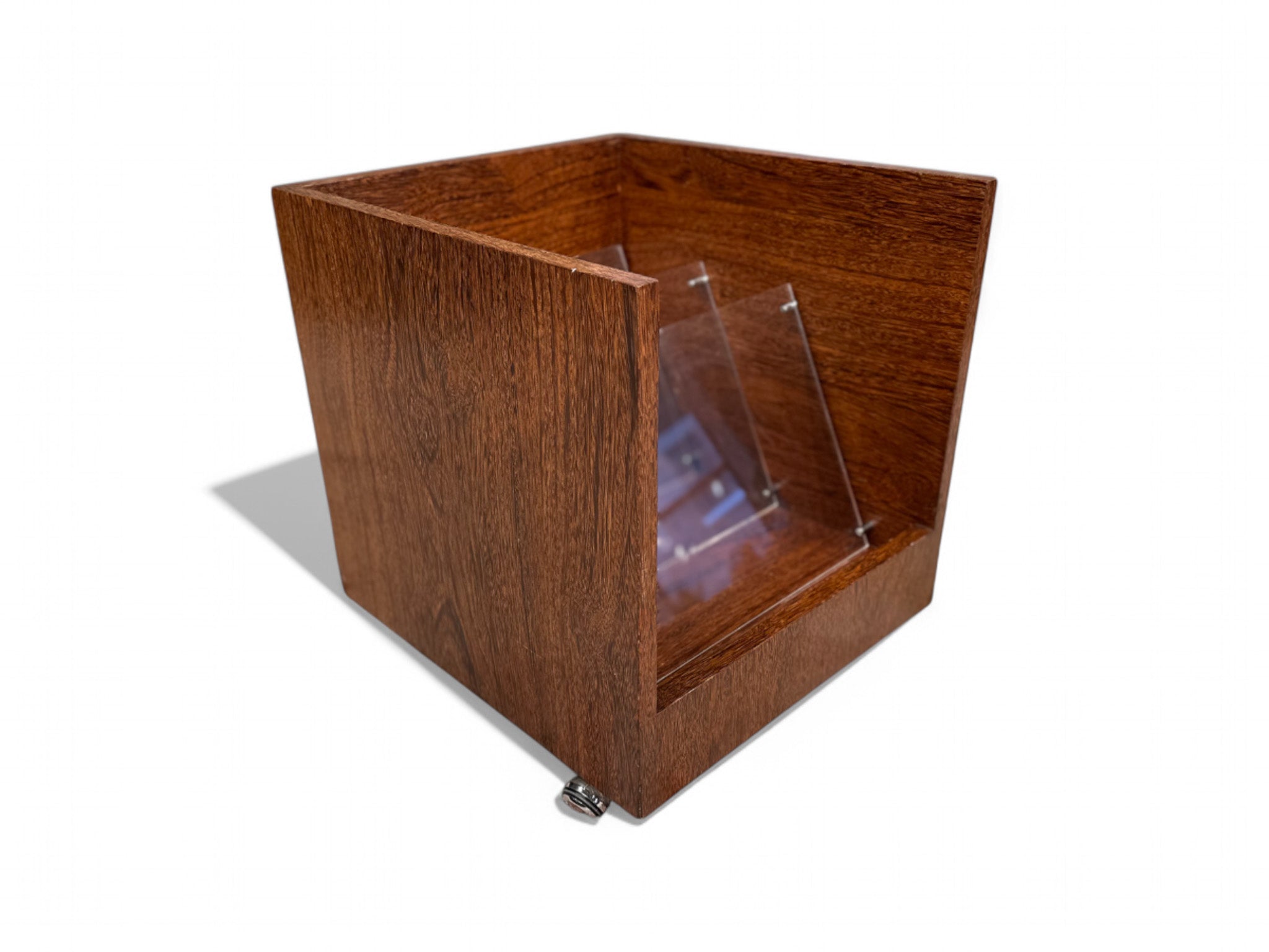 This vintage magazine rack is made with sucupira hardwood, and consists of four chrome wheels and three acrylic dividers. The wood has been refinished, highlighting its stunning grain and beautiful tone. Besides the marks of time, it is in excellent condition.
