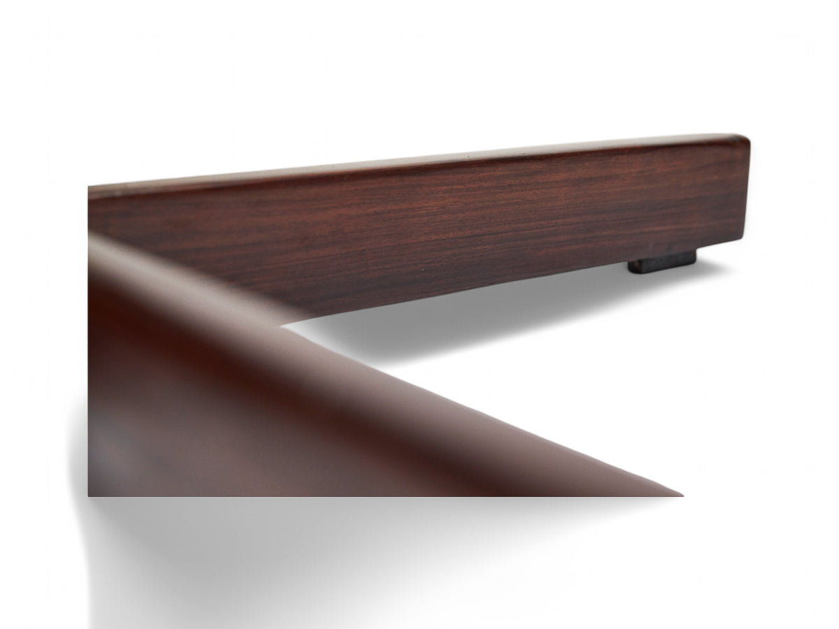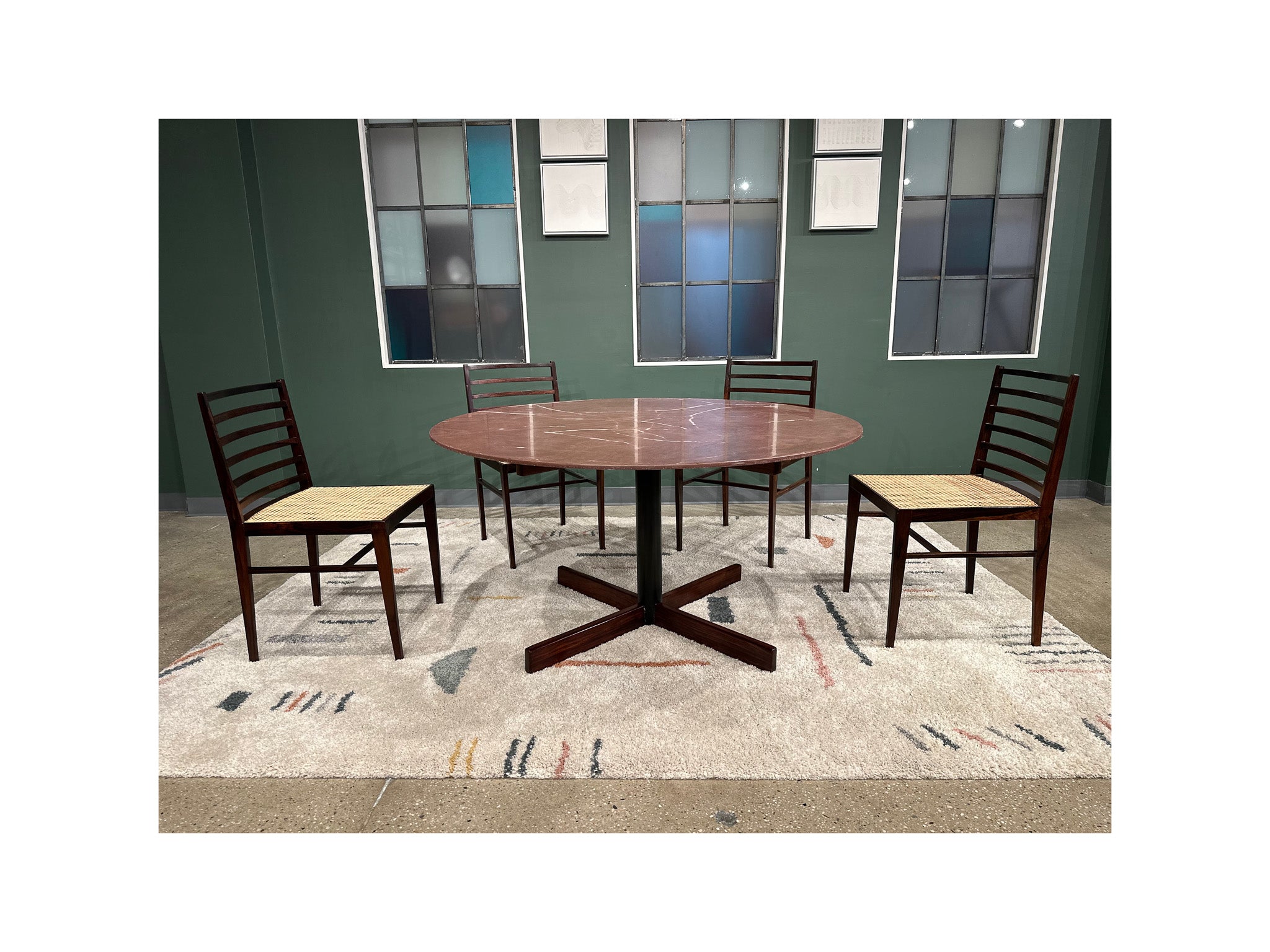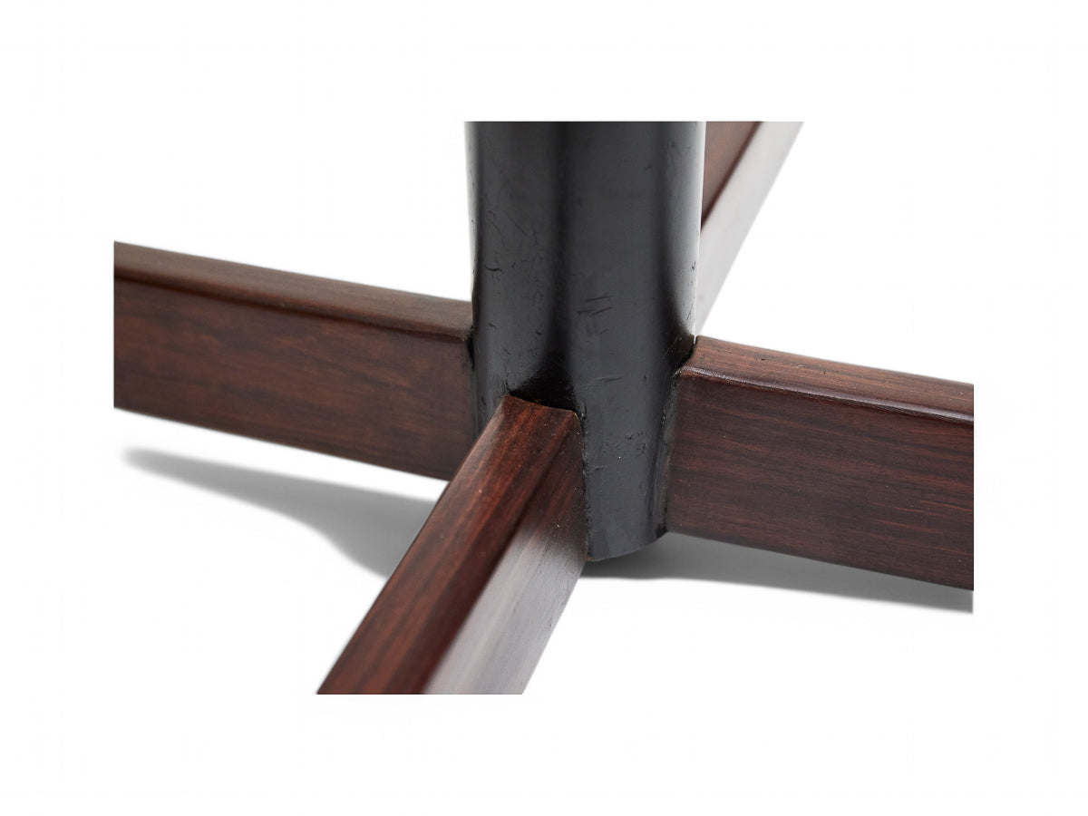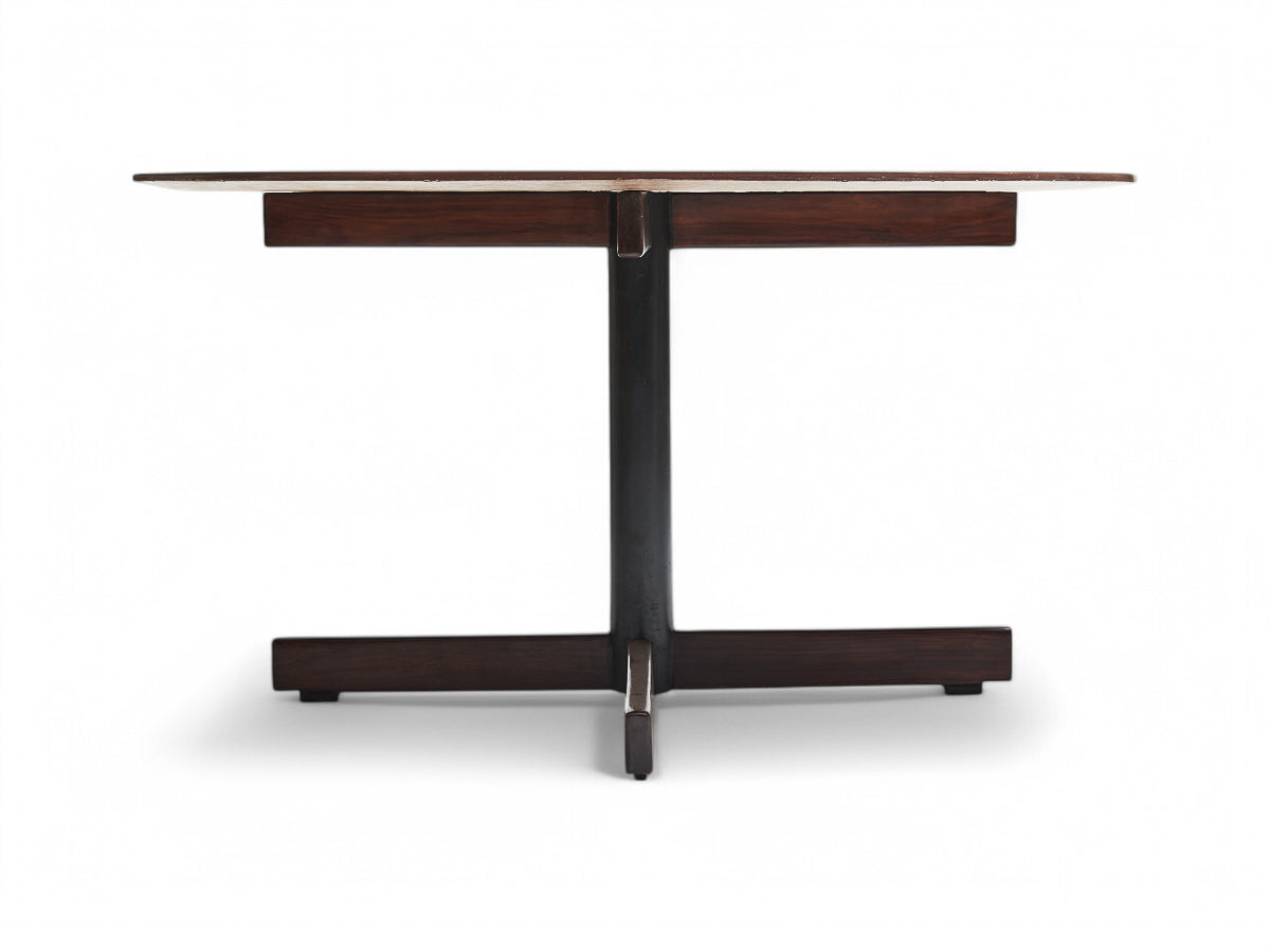 This round dining table consists of a granite top, an “X” shape base made with steel, and Brazilian rosewood, also known as jacaranda. The refinished rosewood has smooth yellow veins, and the granite has a purple tone with white veins, giving it an organic look. The table comfortably seats six people, and the manufacturing seal is underneath the granite top. Besides some marks of age, the table is in excellent condition.