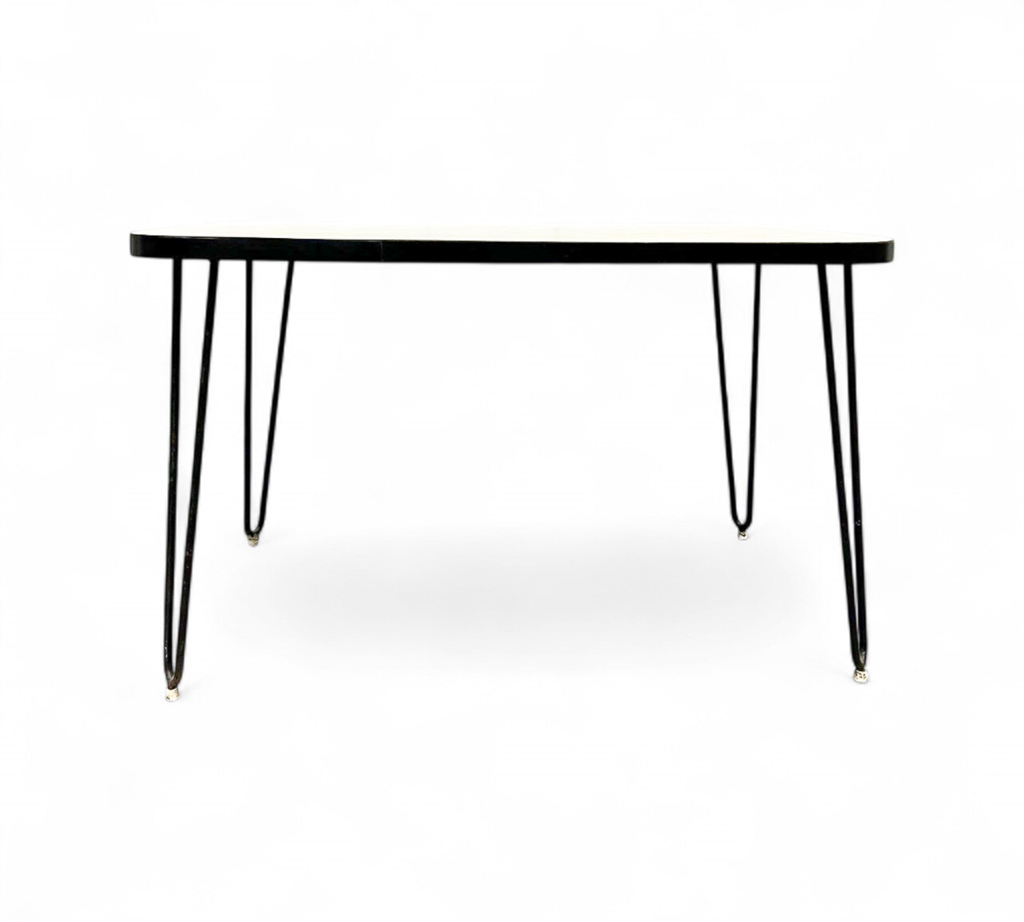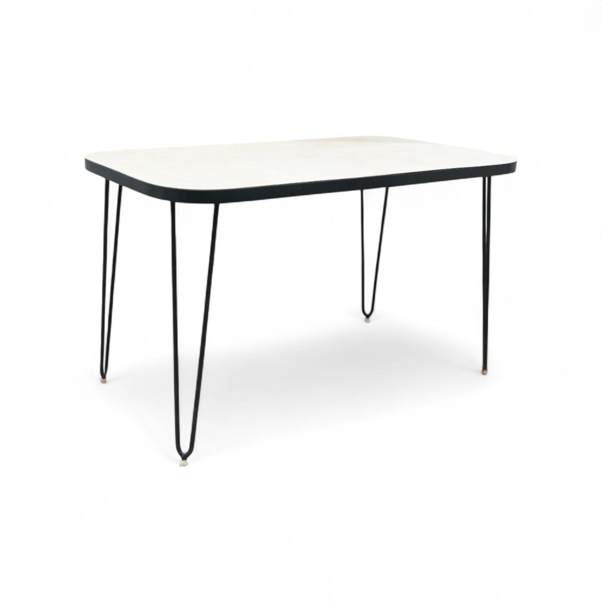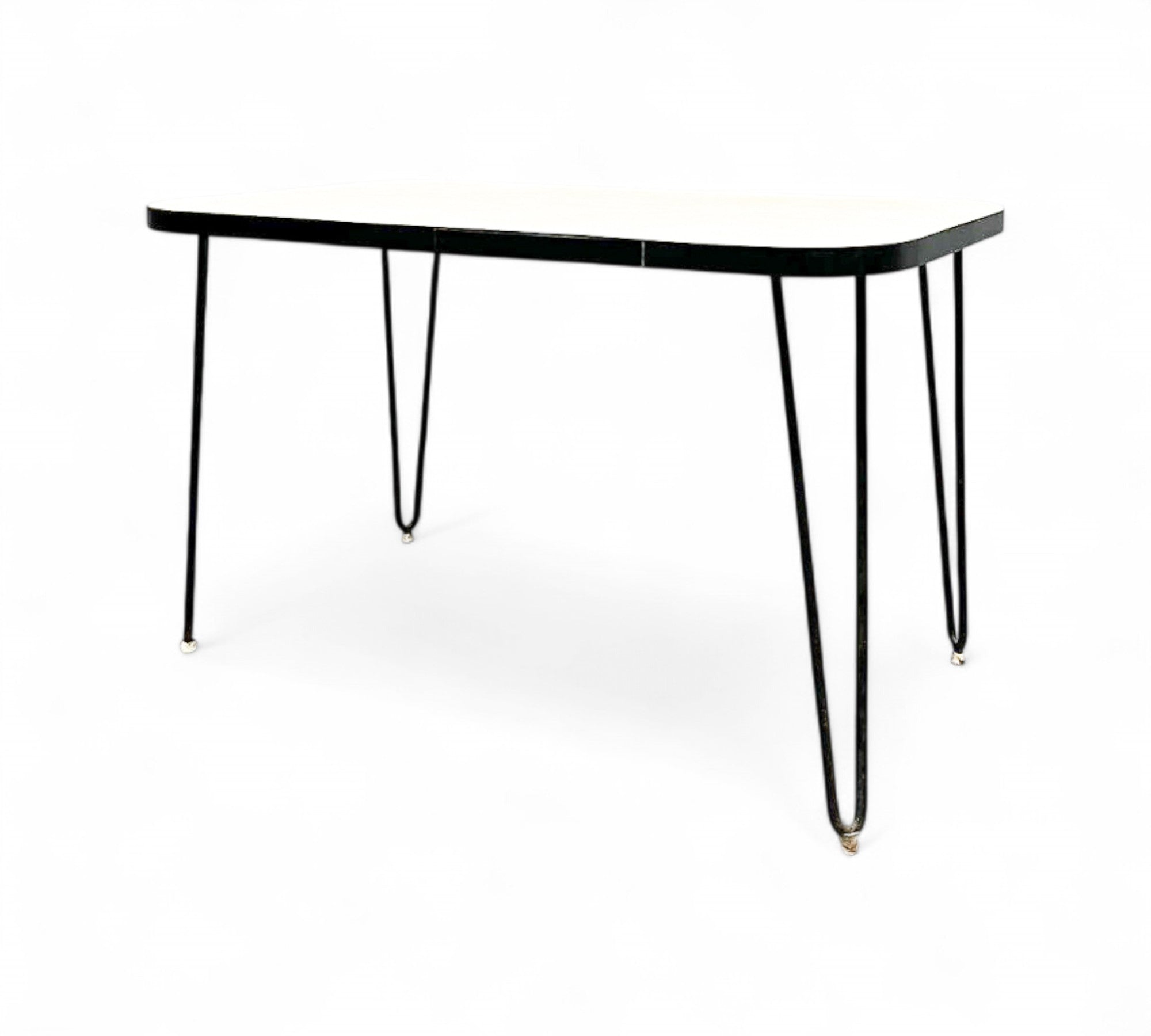This charming table features a sturdy hardwood top adorned with its original white Formica finish. It rests upon solid iron legs that have been painted black for a sleek appearance. The hardwood top has been expertly refinished, ensuring the product's durability and enhanced aesthetic appeal.
