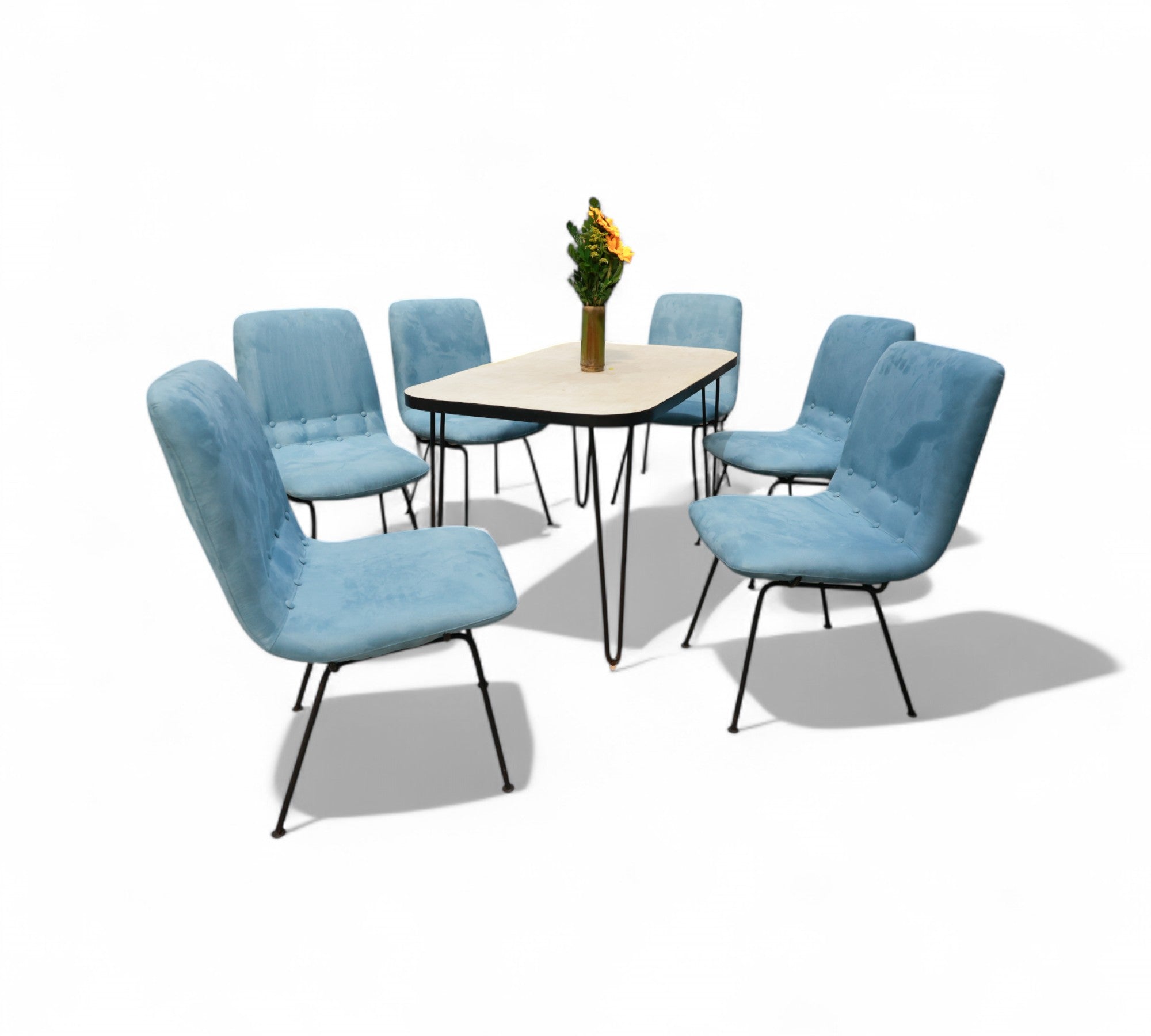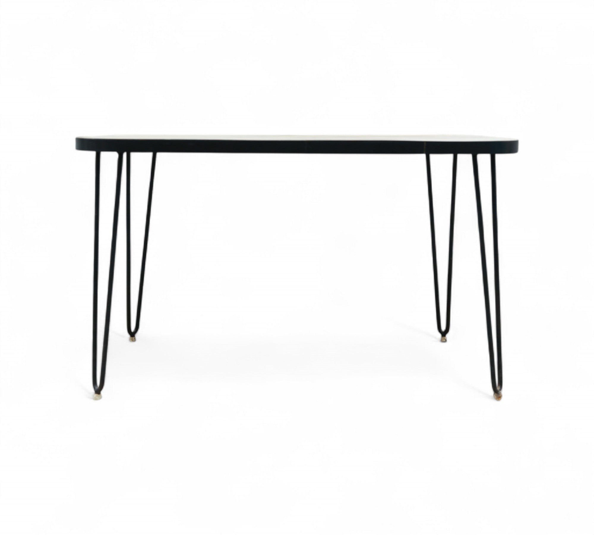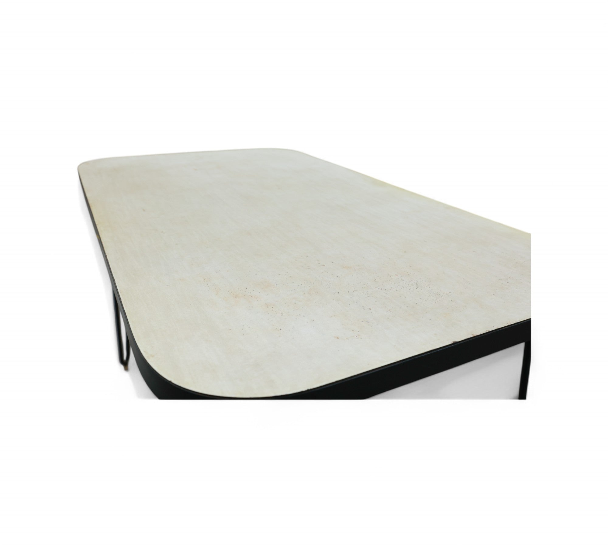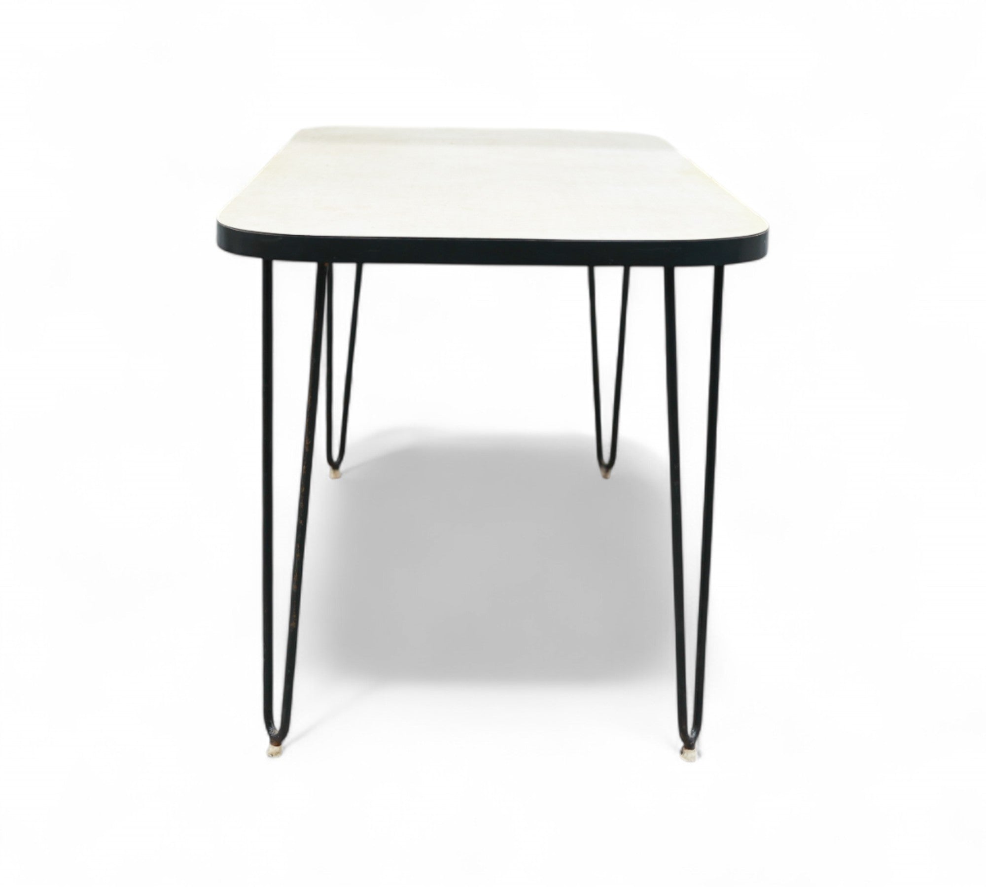 This charming table features a sturdy hardwood top adorned with its original white Formica finish. It rests upon solid iron legs that have been painted black for a sleek appearance. The hardwood top has been expertly refinished, ensuring the product's durability and enhanced aesthetic appeal.