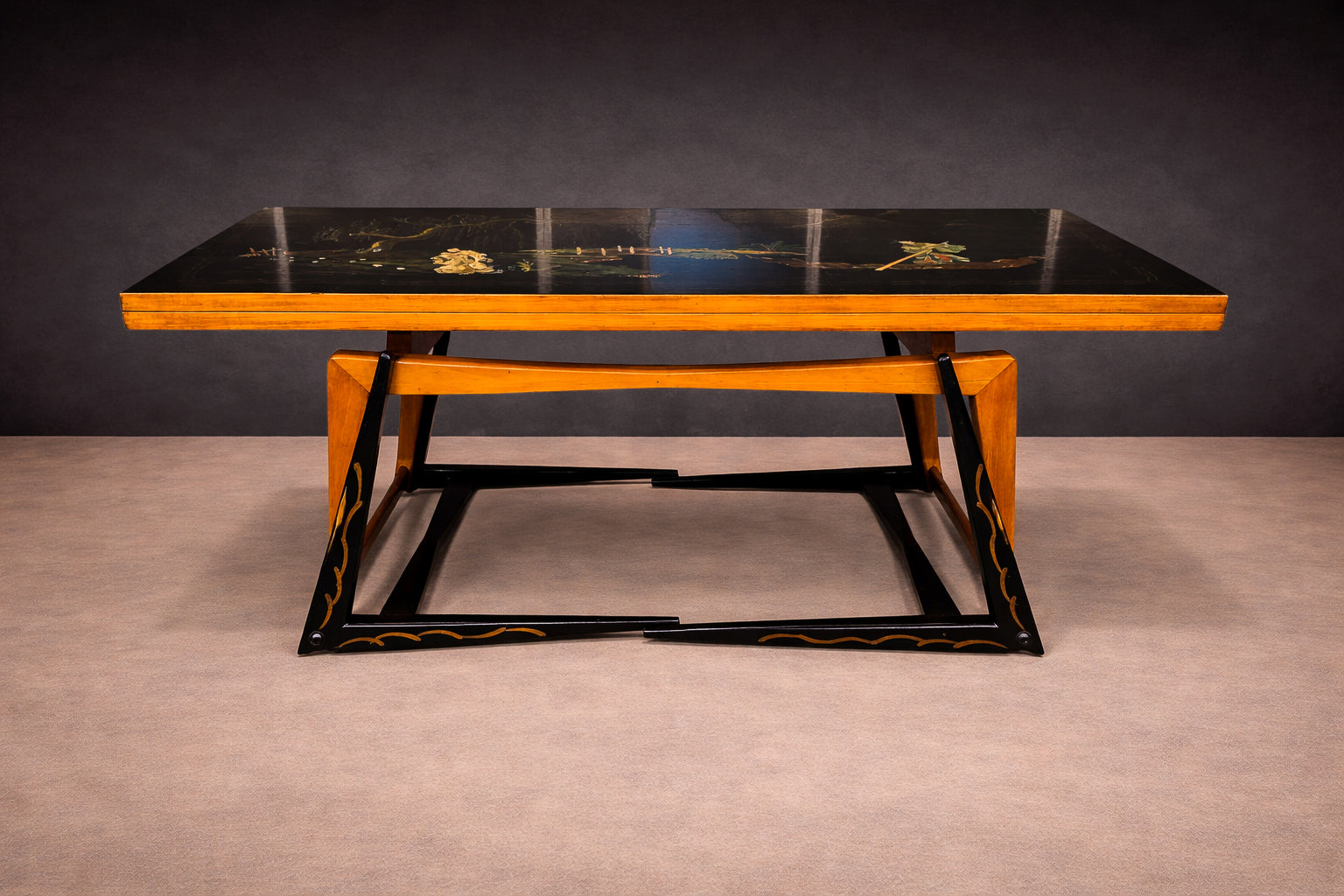 The design is defined by a rectilinear structure whose balanced proportions allow it to function as a table, sideboard, or coffee table without visual compromise. Structural clarity governs the composition, ensuring that transformation and stability coexist within a single, resolved form.