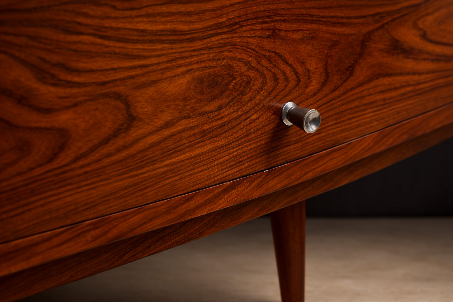 The rosewood veneer displays striking natural grain movement with warm amber and chocolate tones typical of high-quality Brazilian hardwoods used in mid-century production. The wood has been carefully refinished to highlight its depth and character while preserving the clean modernist lines of the piece.