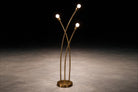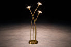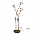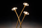 Three slender stems arc upward with a graceful, asymmetrical rhythm, each terminating in a faceted glass shade that softly diffuses light. When illuminated, the shades create a warm ambient glow, enhancing the golden tone of the brass and emphasizing the lamp’s sculptural silhouette. The composition recalls the quiet elegance of bamboo — a motif frequently associated with lightness, balance, and vertical movement.