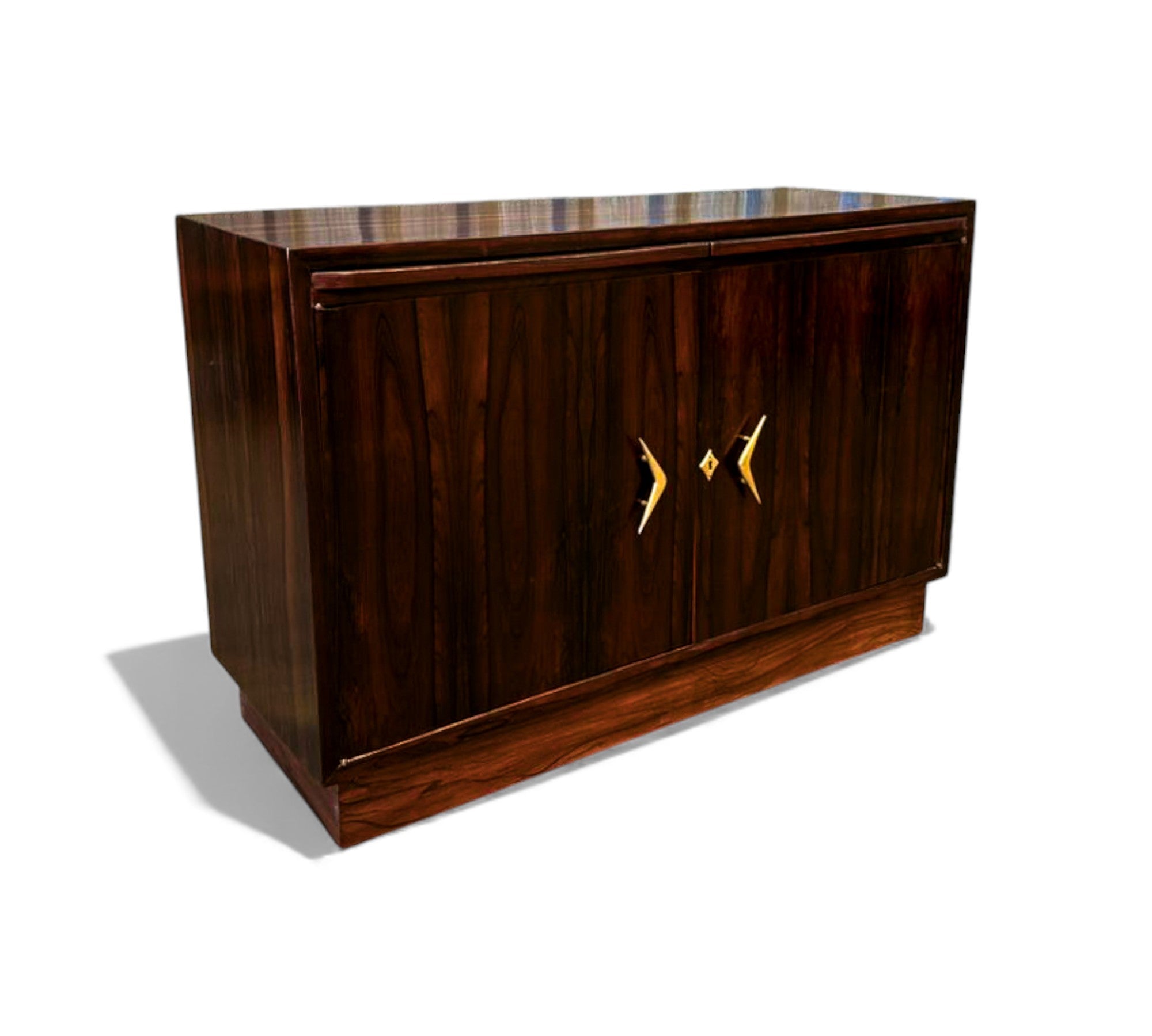 This rectangular bookshelf is crafted from Brazilian rosewood, meticulously refinished to restore it to excellent condition. It includes a flat base and two doors, adorned with "V" shaped handles and a keyhole for locking. Additionally, a small tray ordained in Rosewood slides out from the top, providing a convenient working area. Features Markers sticker on the back, Sticker has peeled over time but can be seen