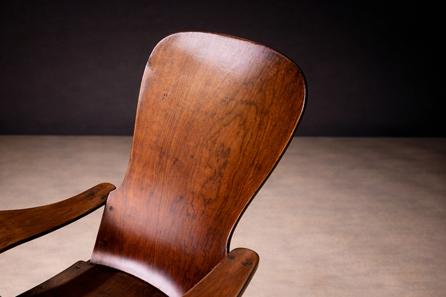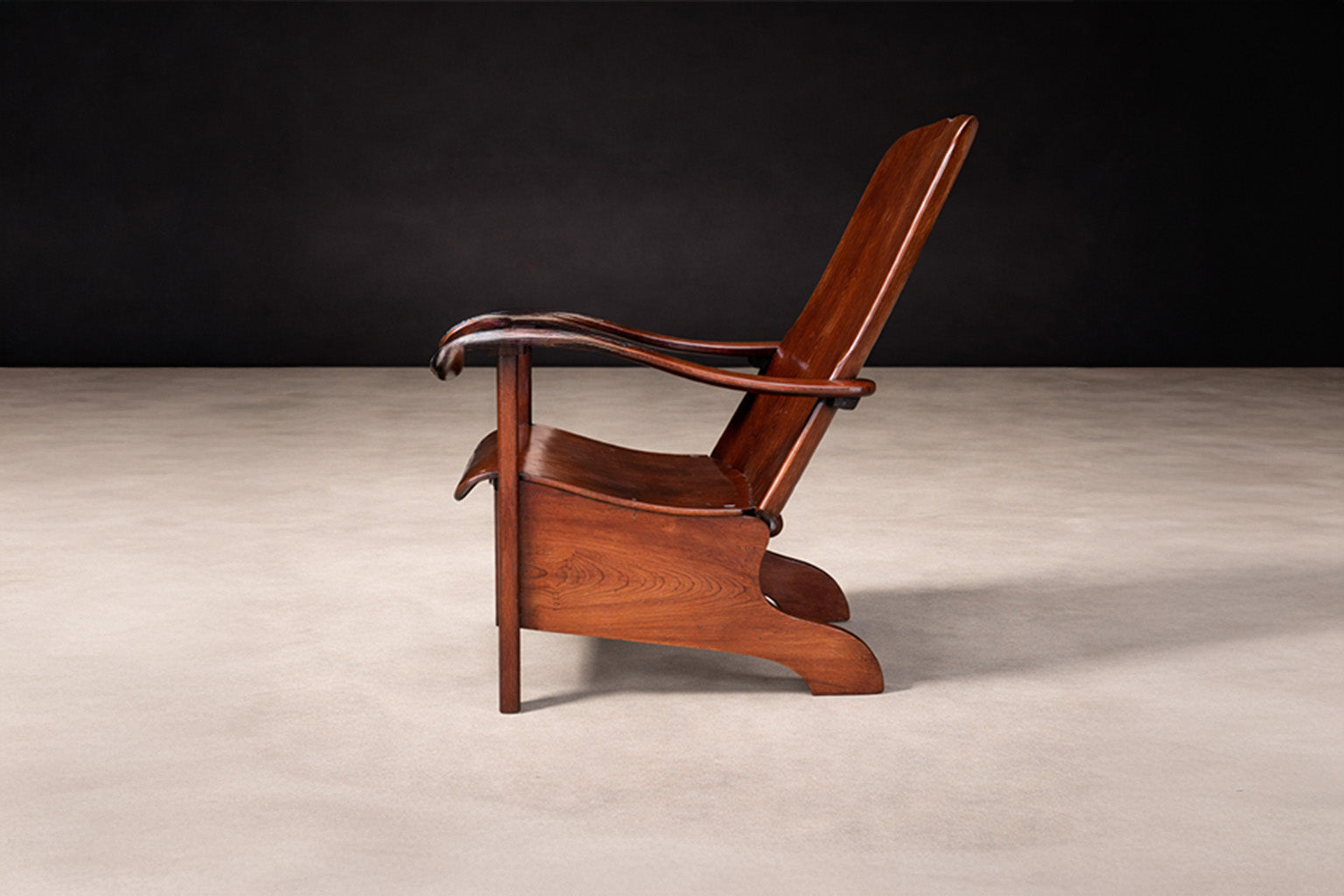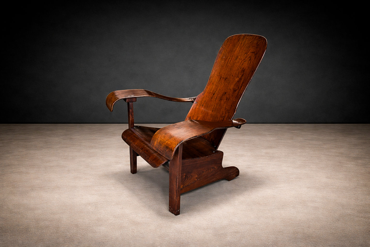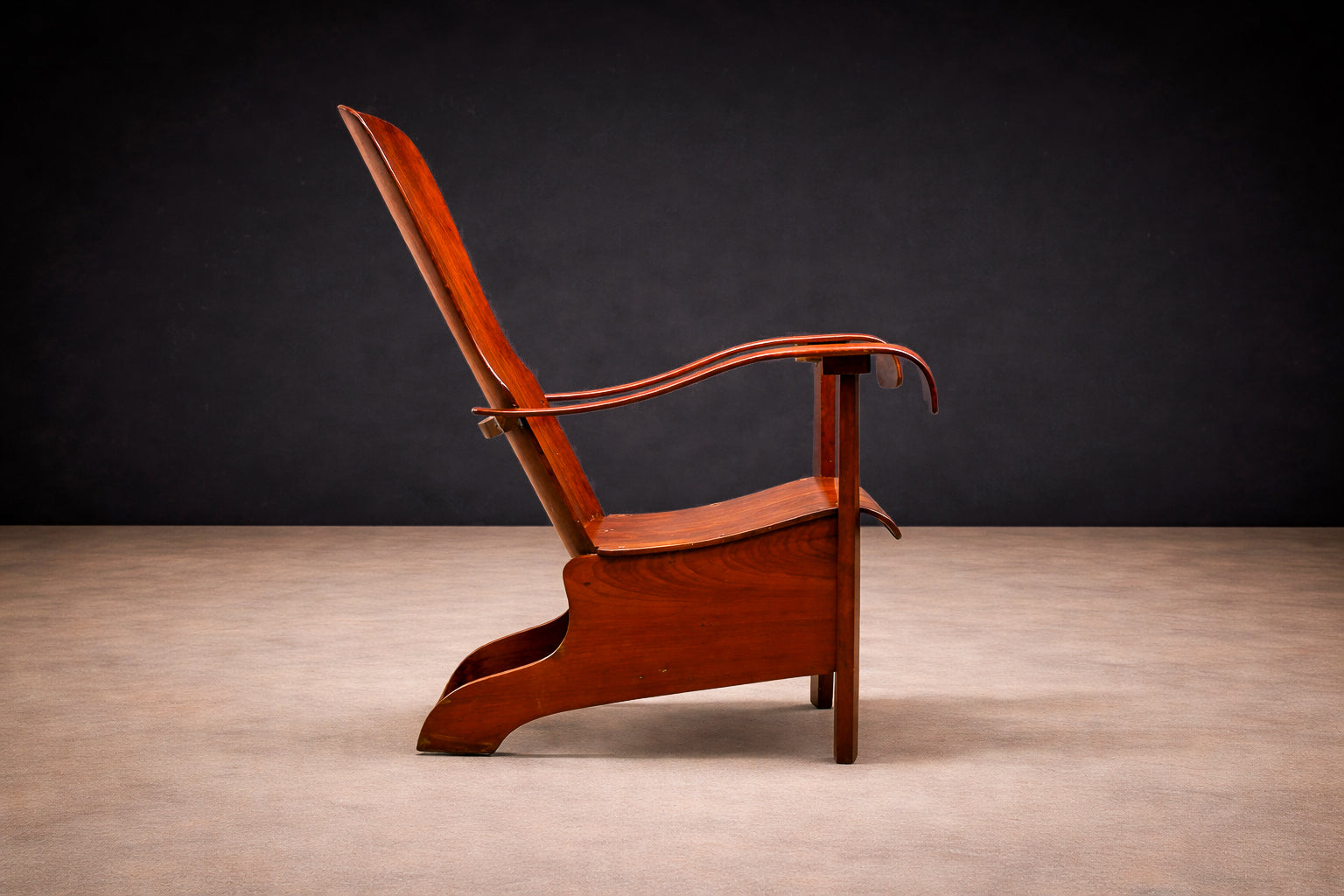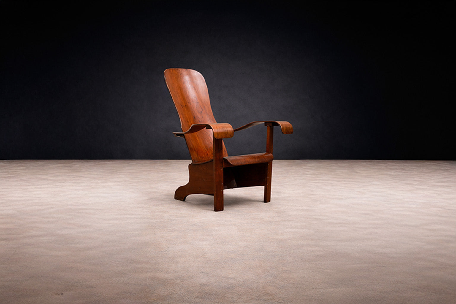 Constructed entirely of bentwood, the chair demonstrates a sophisticated understanding of steam-bent timber as both structural framework and formal language. The visible joinery and continuous planes emphasize material honesty, allowing the natural grain to articulate the surface without superfluous ornament.