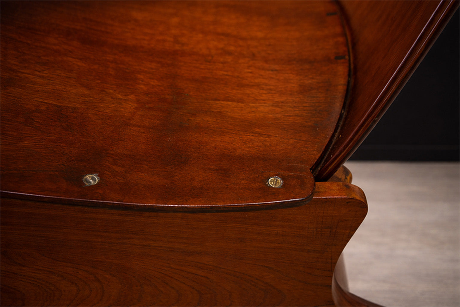 Remnants of the original manufacturer’s seal remain beneath the seat, reinforcing its authenticity and historical continuity. The surface has been professionally refinished, revealing the depth and warmth of the wood. Minor, age-appropriate wear—most evident along the legs—is consistent with careful use.