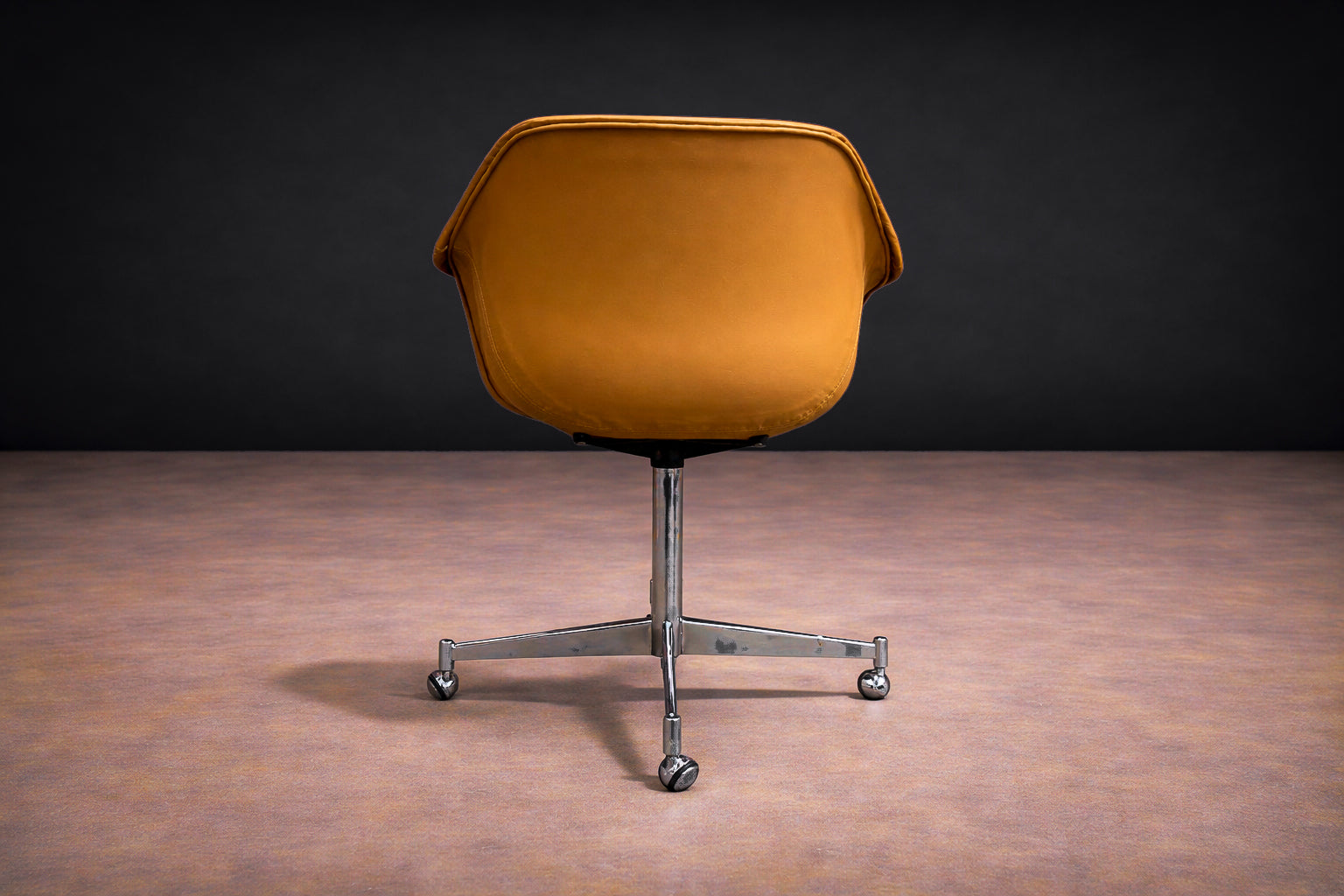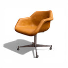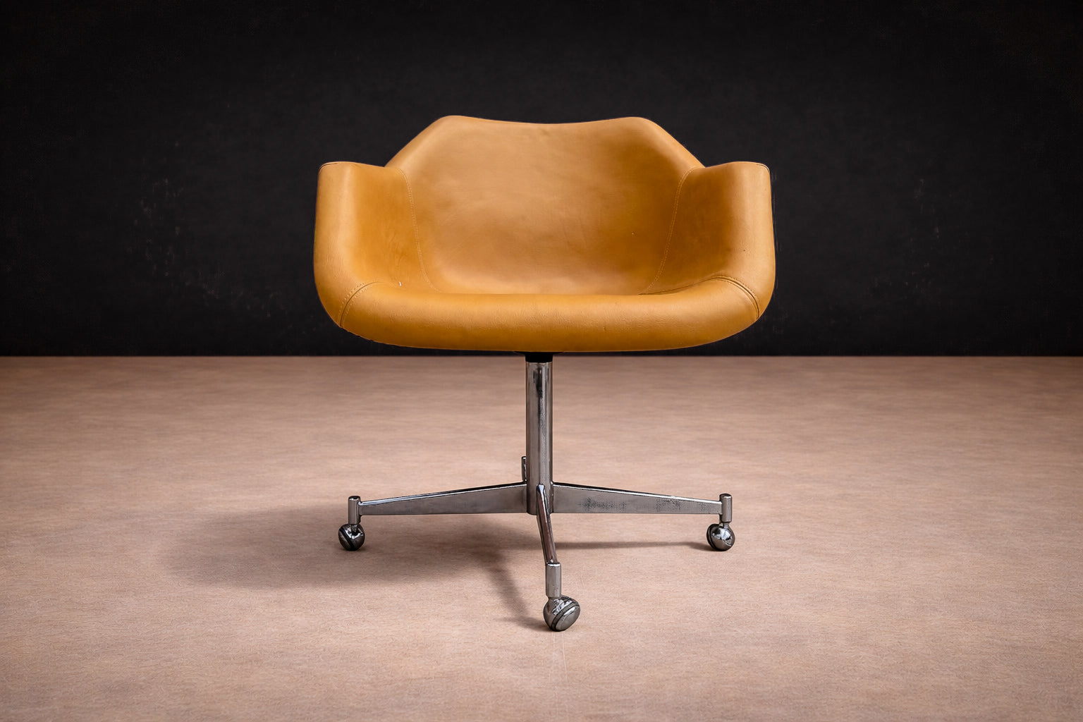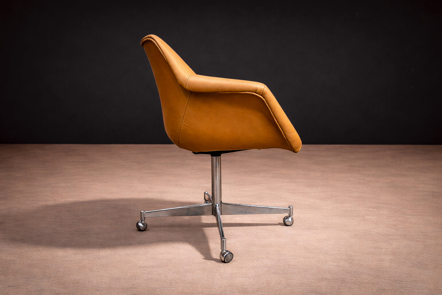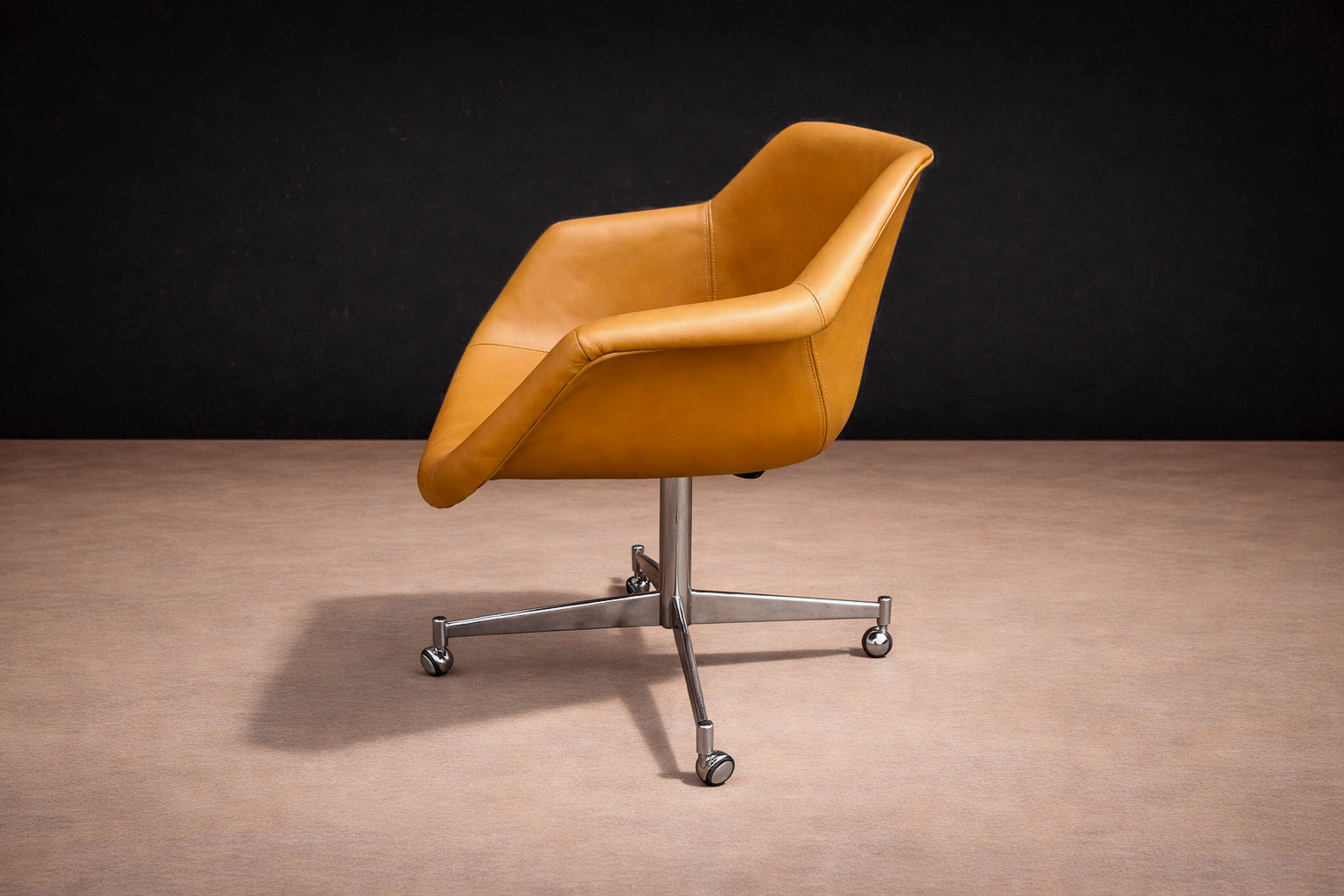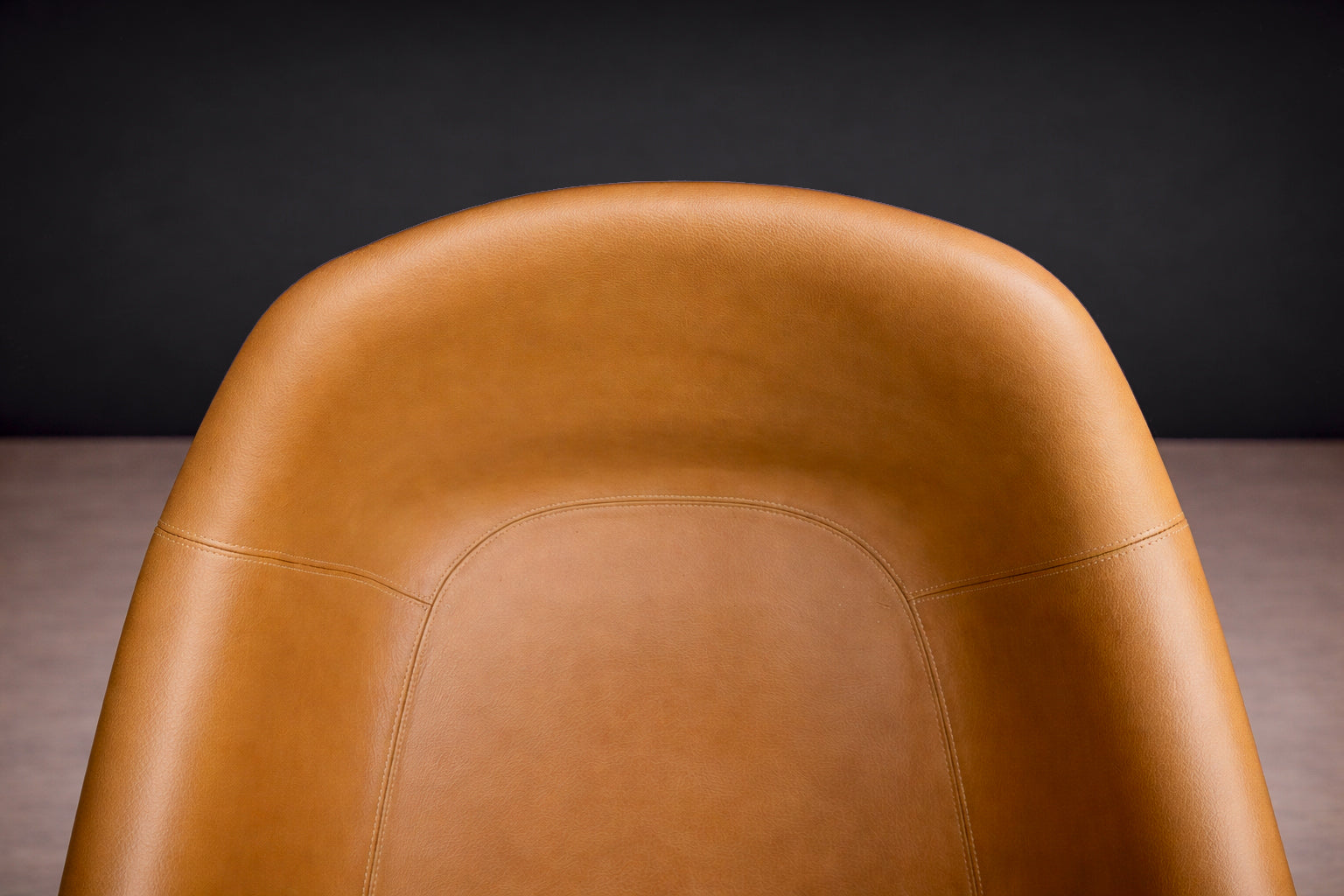 The caramel-toned leather presents a warm, saturated hue that emphasizes the chair’s sculptural contour. Subtle stitching traces the curvature of the form, reinforcing its geometry while maintaining visual restraint. The seat’s generous breadth and slight recline provide a relaxed yet upright posture suited to office or executive use—comfort absorbed seamlessly into the formal language of the piece.