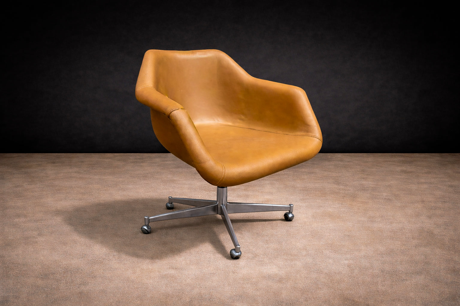 This office armchair reflects the refined modernism that defined Zalszupin’s production during the 1960s. The design is articulated through a single, continuous leather shell, gently folded to form seat, back, and arm supports in one fluid gesture. Its low, enveloping profile is defined by soft radii and disciplined seam lines, allowing structure and upholstery to operate as a unified whole.