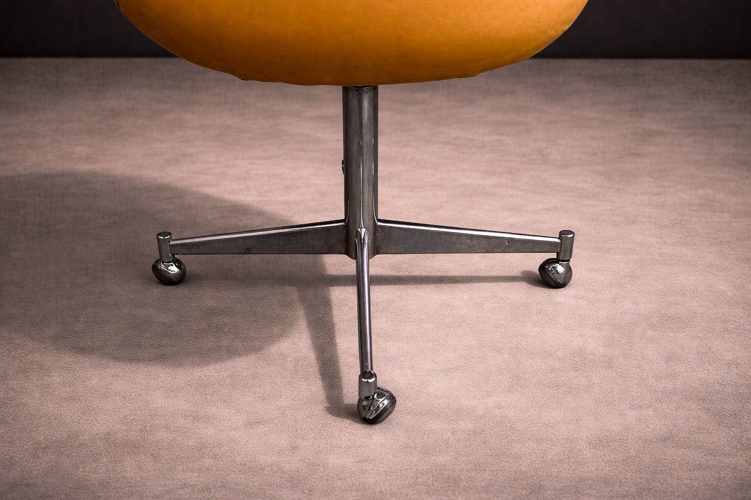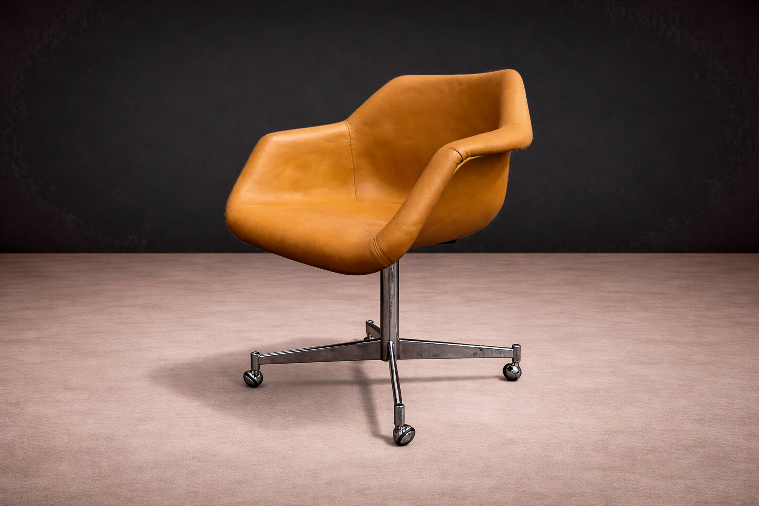 The shell is mounted on a metal swivel base with four splayed arms terminating in casters. The base introduces an industrial counterpoint to the supple leather volume above, a material dialogue characteristic of Brazilian modernism at mid-century. The proportions remain balanced: the grounded horizontality of the seat set against the crisp linearity of the support.