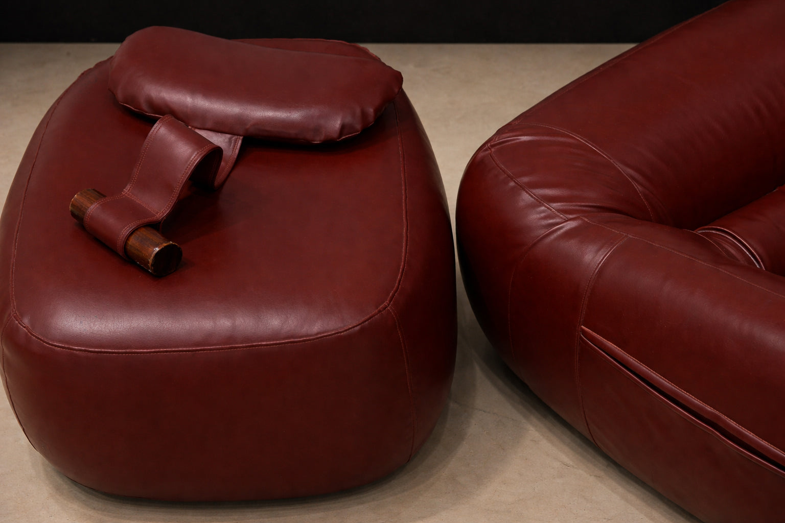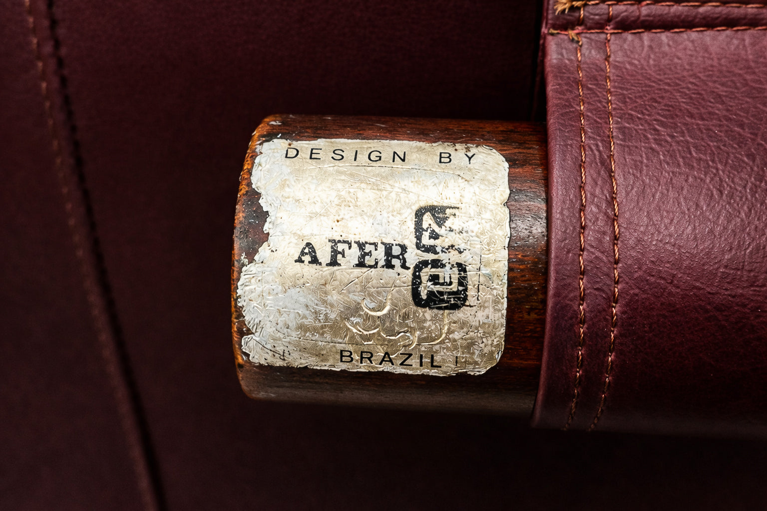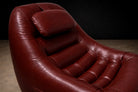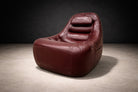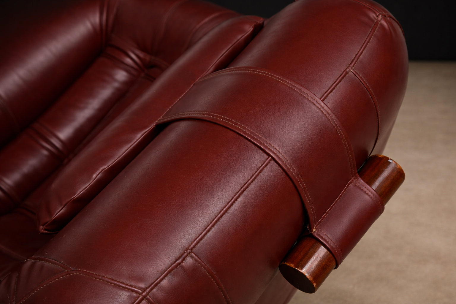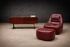 Upholstered in its original burgundy faux leather, recently reconditioned, the surface presents with rich tonal saturation and strong vintage character. The preservation of the original material is particularly noteworthy, as Lafer’s early synthetic upholstery was integral to his industrial philosophy — durable, accessible, and suited to serial production. The original manufacturer’s label remains intact, affirming authenticity and production lineage.