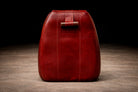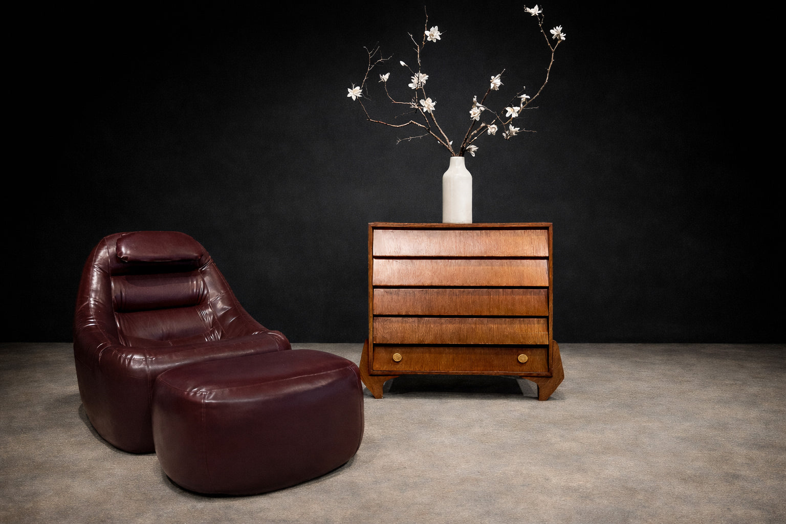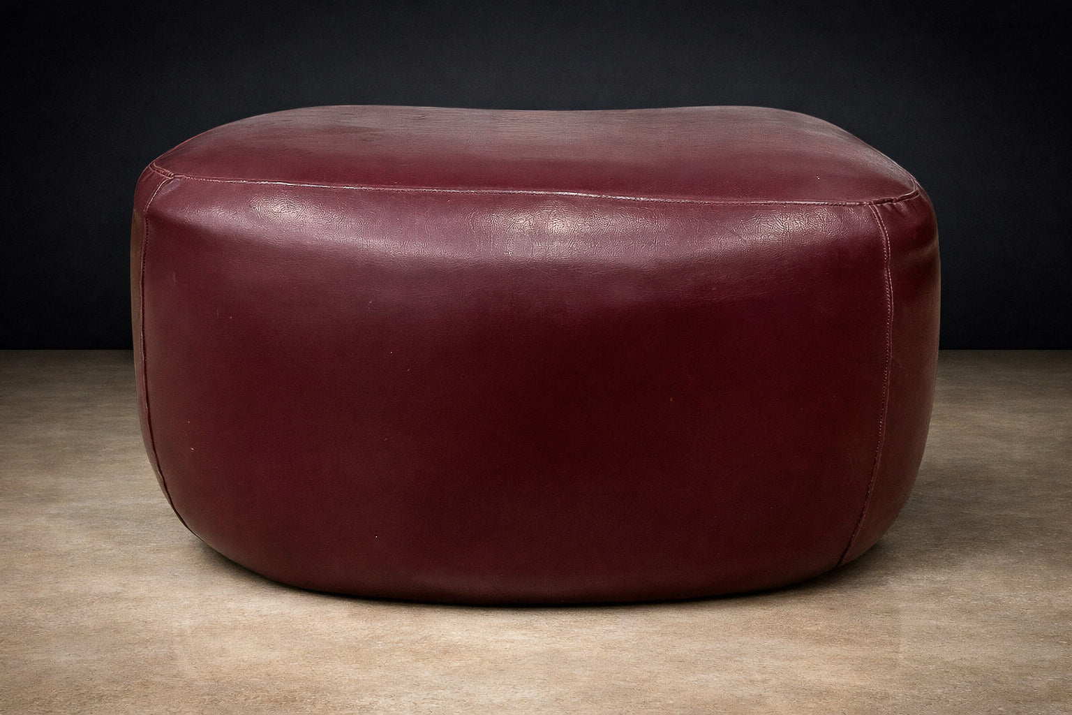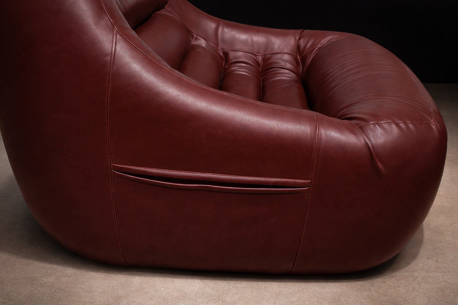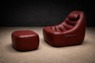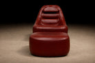 Upholstered in its original burgundy faux leather, recently reconditioned, the surface presents with rich tonal saturation and strong vintage character. The preservation of the original material is particularly noteworthy, as Lafer’s early synthetic upholstery was integral to his industrial philosophy — durable, accessible, and suited to serial production. The original manufacturer’s label remains intact, affirming authenticity and production lineage.