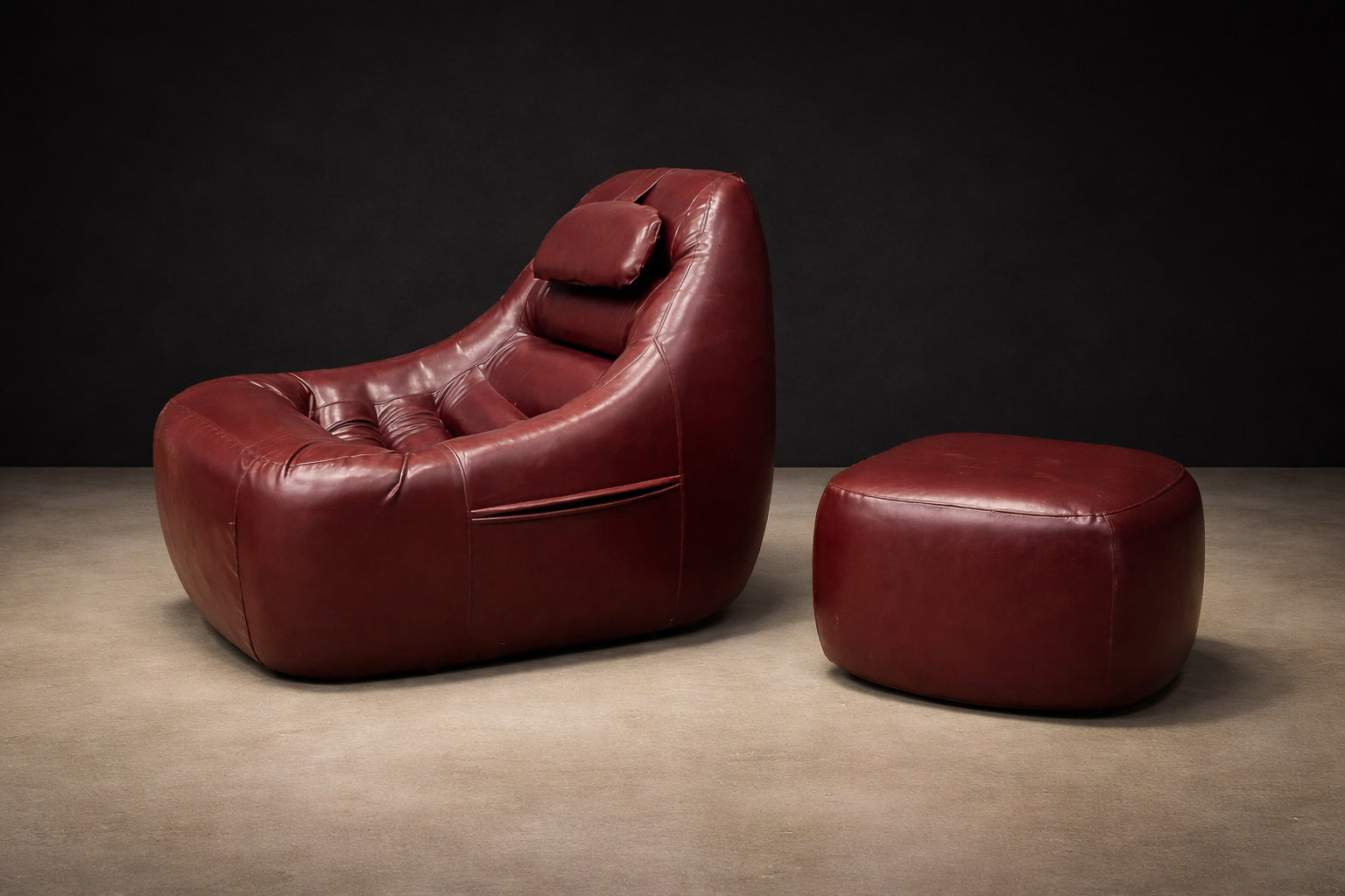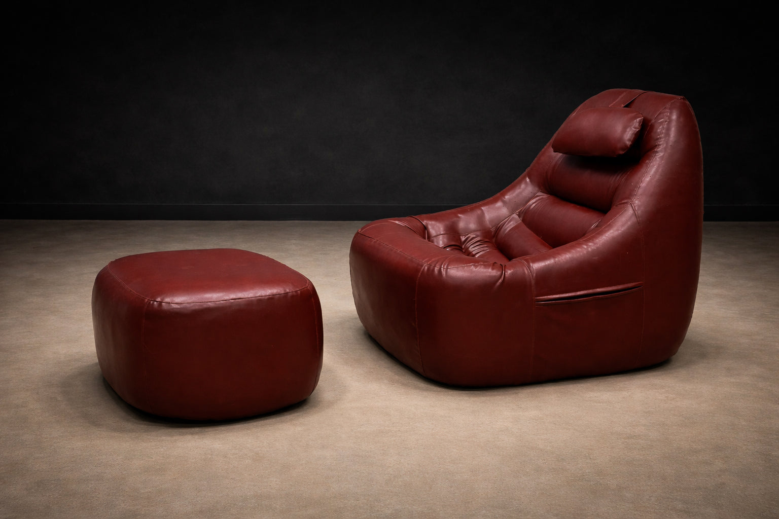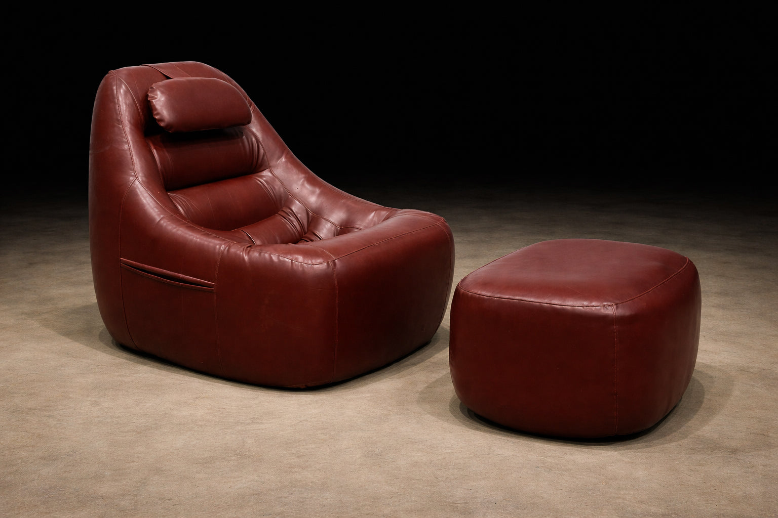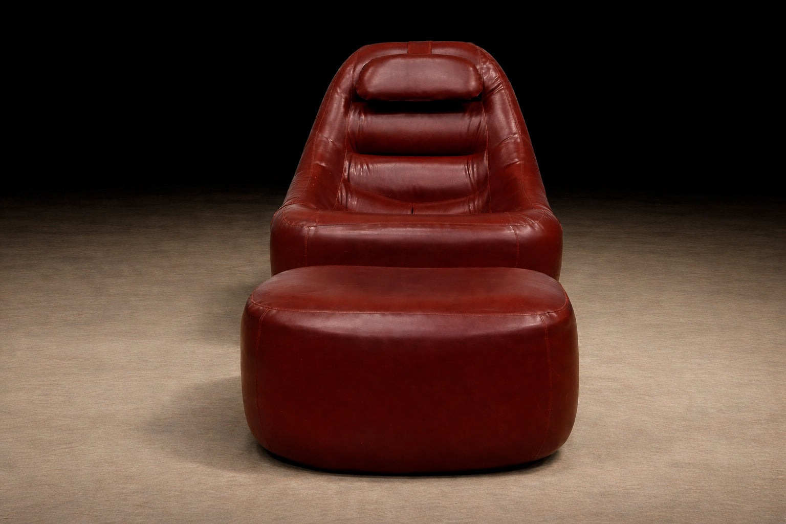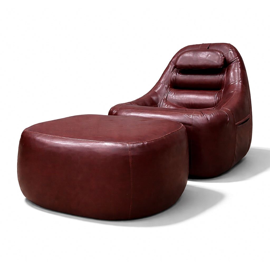 The chair’s volumetric silhouette — low-slung, generously contoured, and visually continuous — is anchored by its integrated headrest and deeply pitched seat. The matching ottoman completes the reclining posture, reinforcing the piece’s immersive, lounge-oriented intent. Practical side pockets, seamlessly incorporated into the design, underscore Lafer’s commitment to functional intelligence within expressive form.