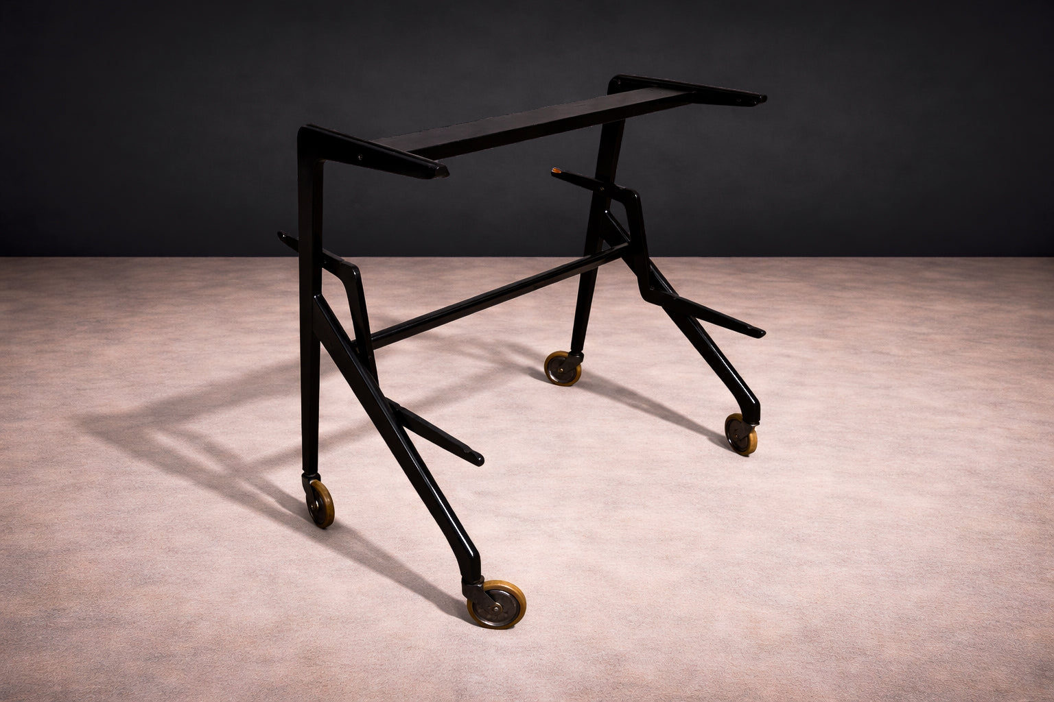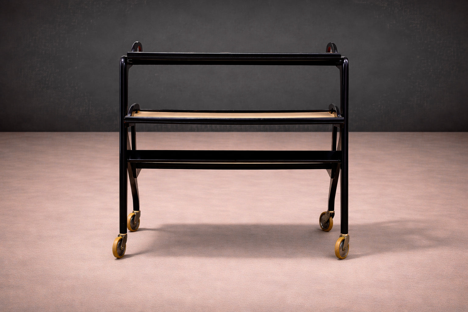 Mounted on four casters, the cart is designed for mobility, its proportions carefully considered to maintain visual lightness despite its layered construction. The diagonal support element beneath the central tray adds structural tension, underscoring the designers’ attention to engineered detail.