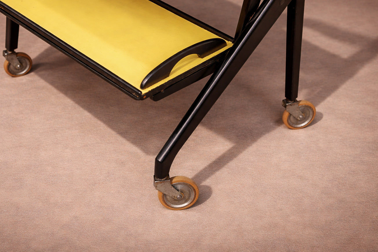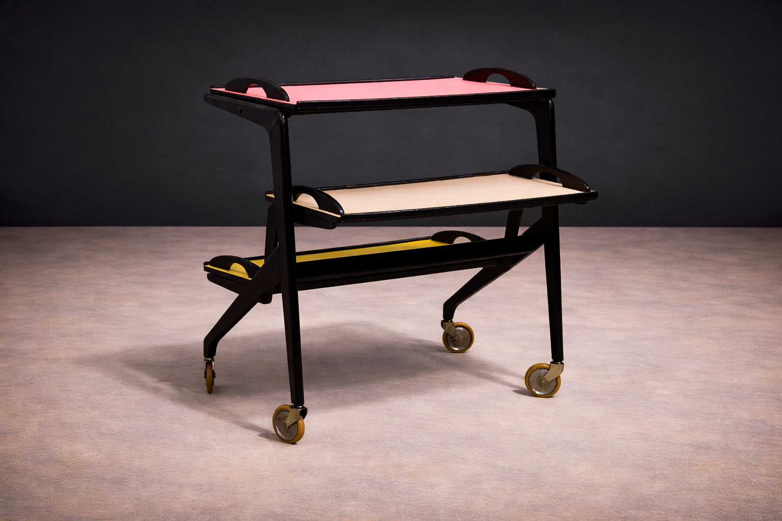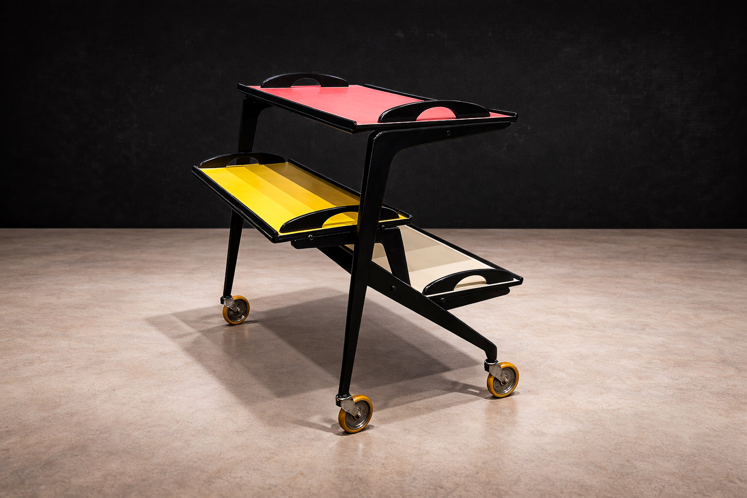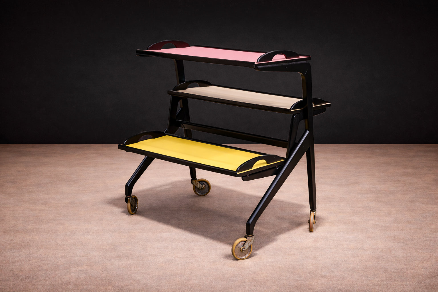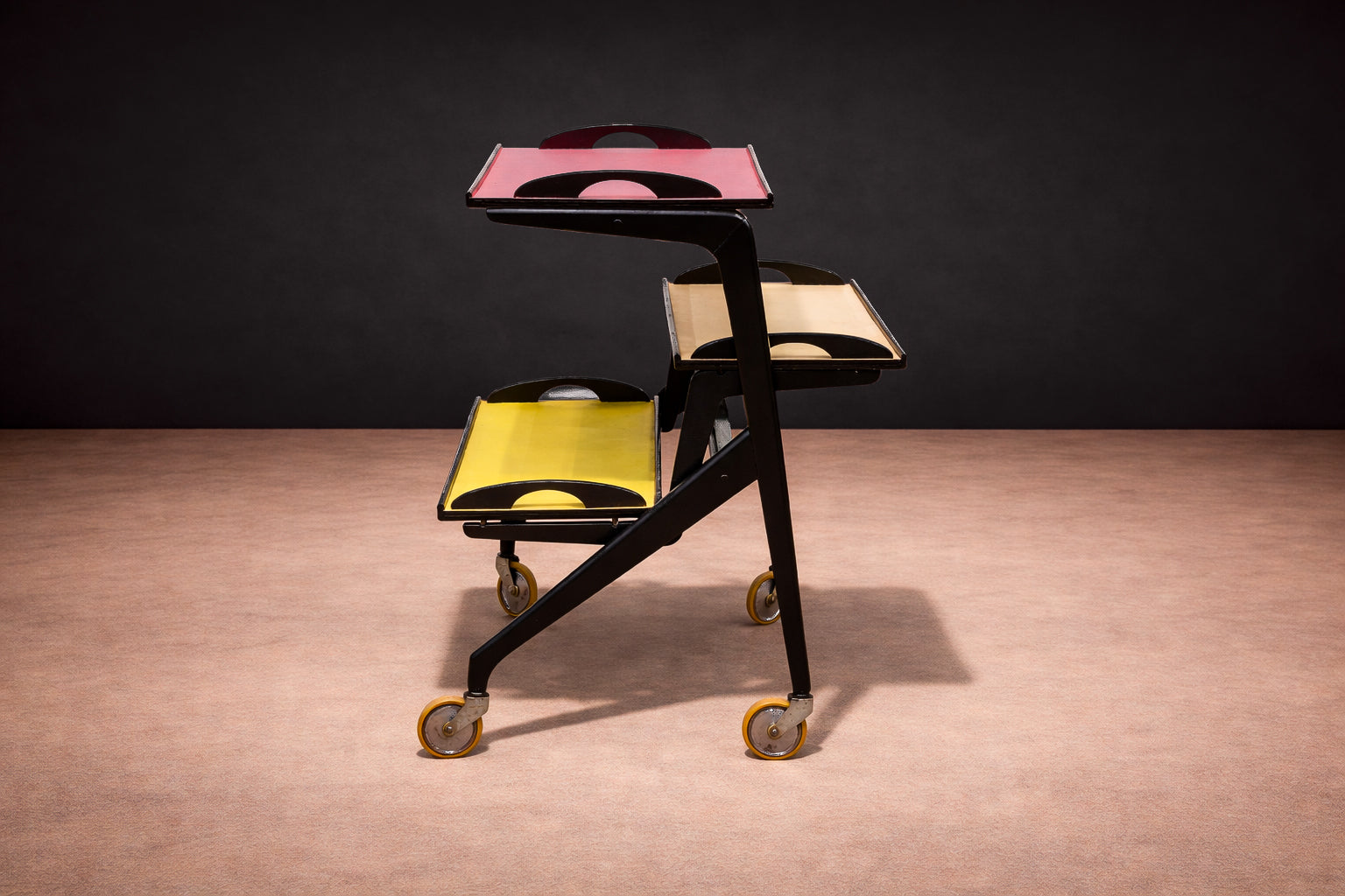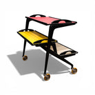 Three graduated trays are inset with vividly colored Formica surfaces—rose, yellow, and ivory—introducing a disciplined yet playful chromatic composition. Each tray is framed by a raised black border with integrated cut-out handles, reinforcing the cart’s graphic clarity while ensuring functional ease. The interplay between dark structure and saturated planes articulates a balance between industrial modernity and domestic informality.