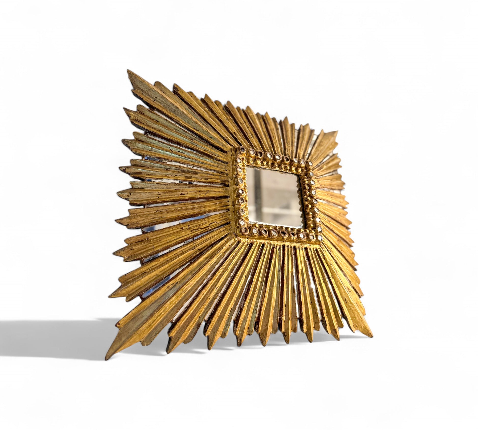This rare Baroque Colonial sunburst mirror belonged to a private residence in Cusco, the Peruvian region in the Andes with the finest artisans of the country. This mirror is made in hardwood, plaster, and gold leaf sheets. While the style is inspired in Baroque colonial sunburst mirrors, the technique was executed by Peruvian artisans in the 1920s. This can be seen in the rich texture and unique gold detailing, resembling ethnic motifs from the Andes. The glass is also original. The mirror is in its original condition and while it has some minor dents and small pieces of plaster missing (as detailed in the pictures), the piece is in great condition and will certainly fit into any interior space.