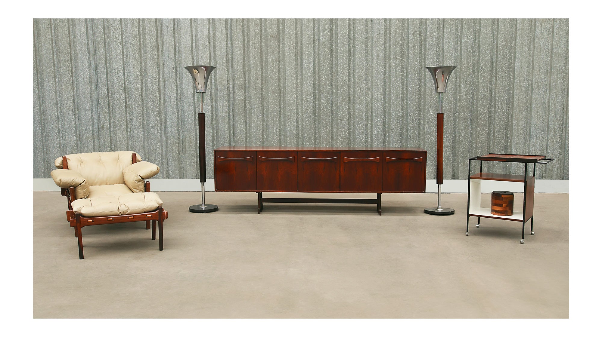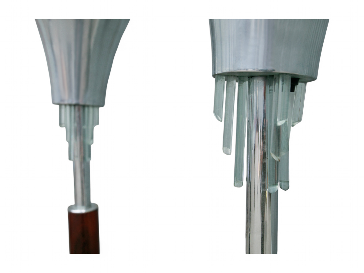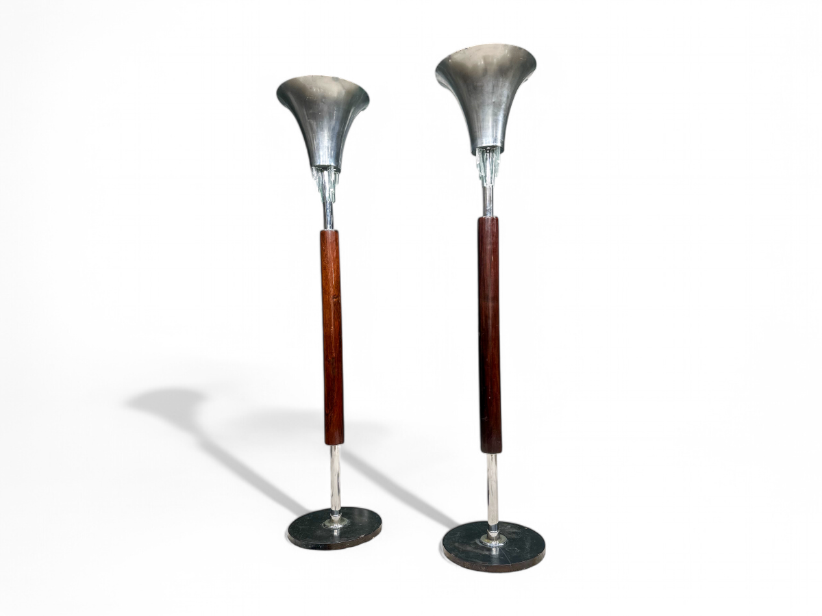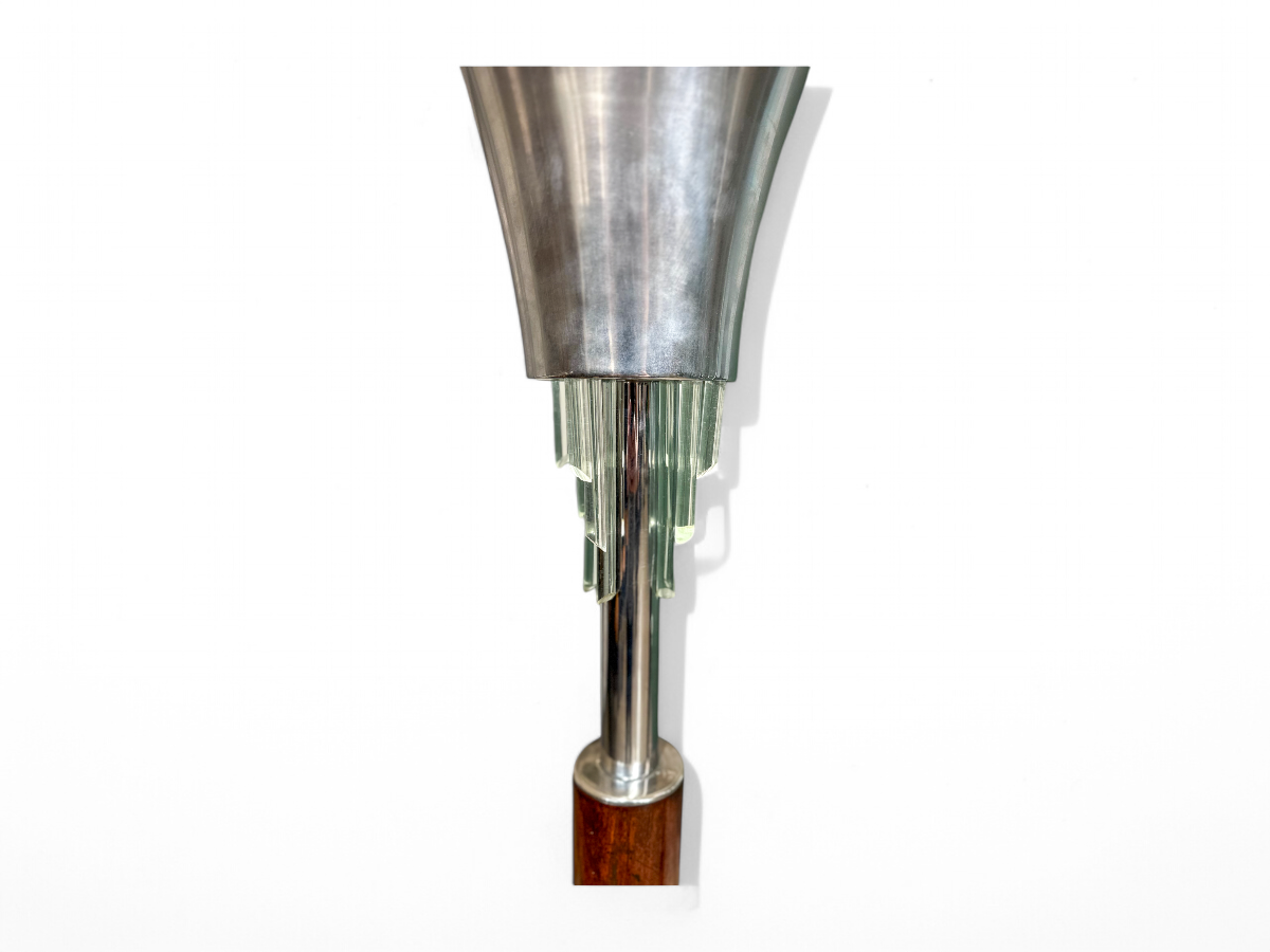 This “Torchierre” floor lamp set is made in Brazilian rosewood, crystal and chrome. It was made in Brazil during the 1950s and is a great example of Brazilian Art Deco style featuring symmetrical, geometric and streamlined lines and the use of a tropical wood (Brazilian Rosewood). Both lamps have been rewired for the US.