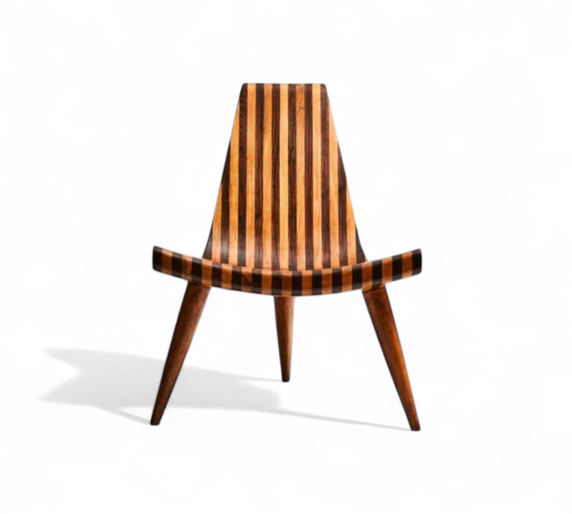 This “Tres Pes” three-legged chair is made with the combination of two high quality Brazilian hardwoods, Brazilian rosewood (Jacaranda) and Ivorywood (Pau Marfim). Each species of wood can be seen in the different colored stripes, which has been expertly refinished. The unique structure of the armchair is seen in the curvature of the seat, which reflects its Brazilian native roots. It can be interpreted as a mix between a hammock and a traditional tribal wood bench. Although the chair has been around for more than seventy years, it is still in excellent condition. This is a true collector’s item that will only appreciate in value with time.
