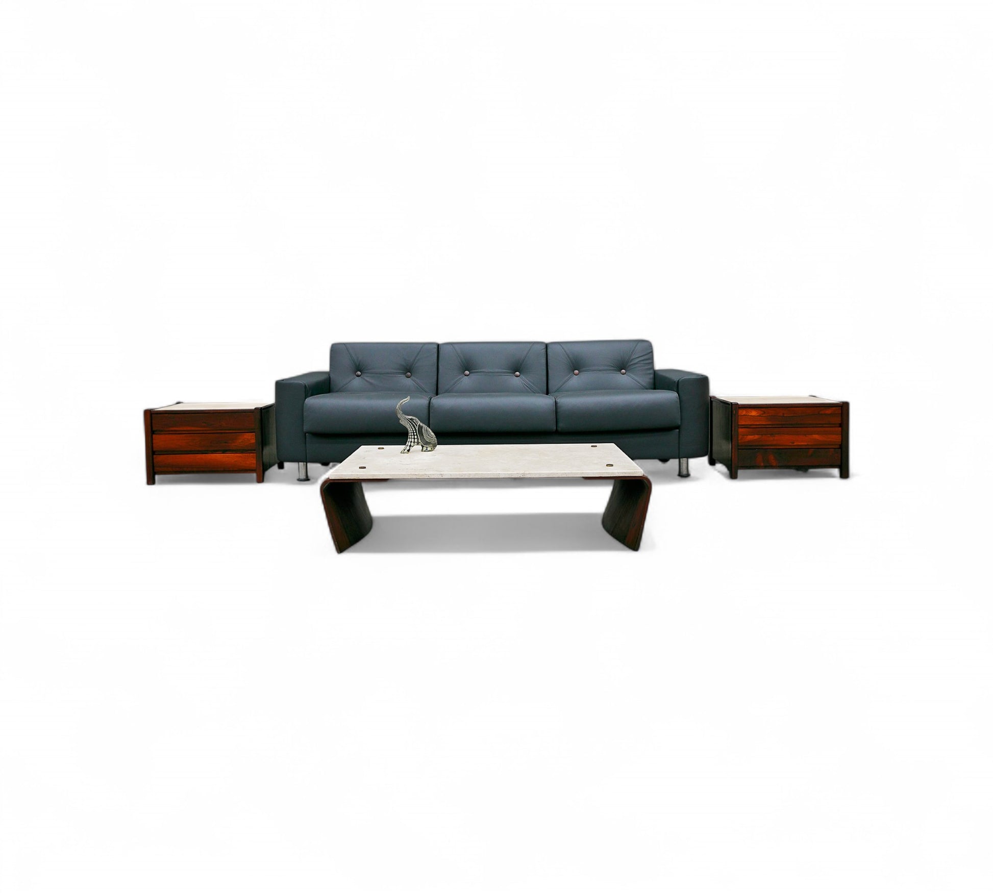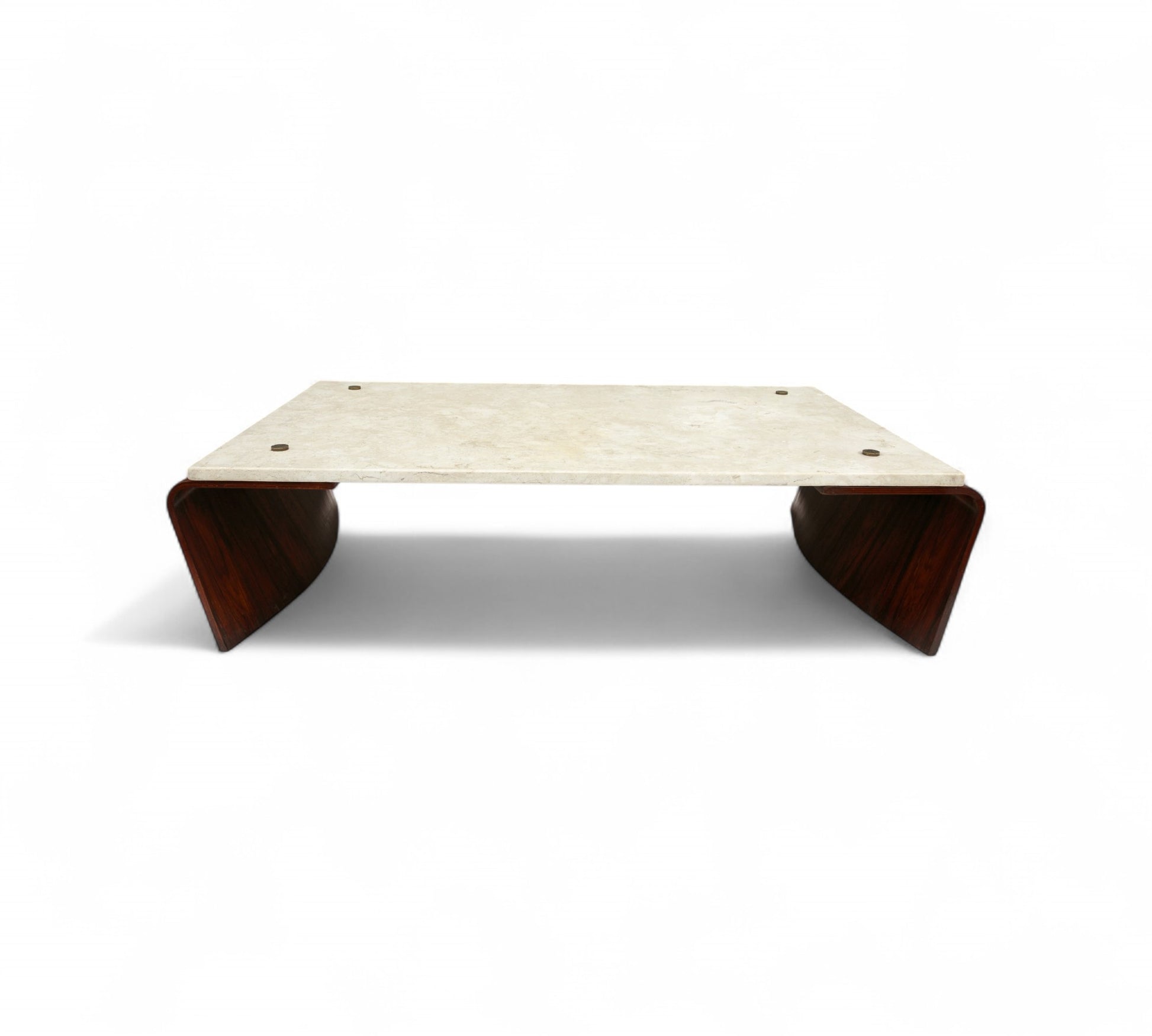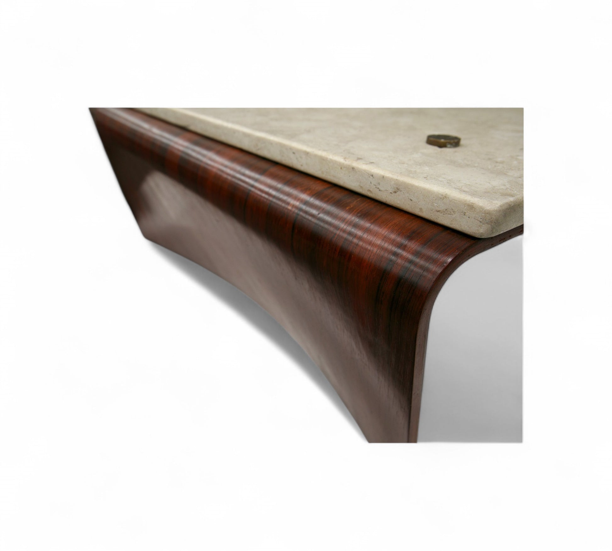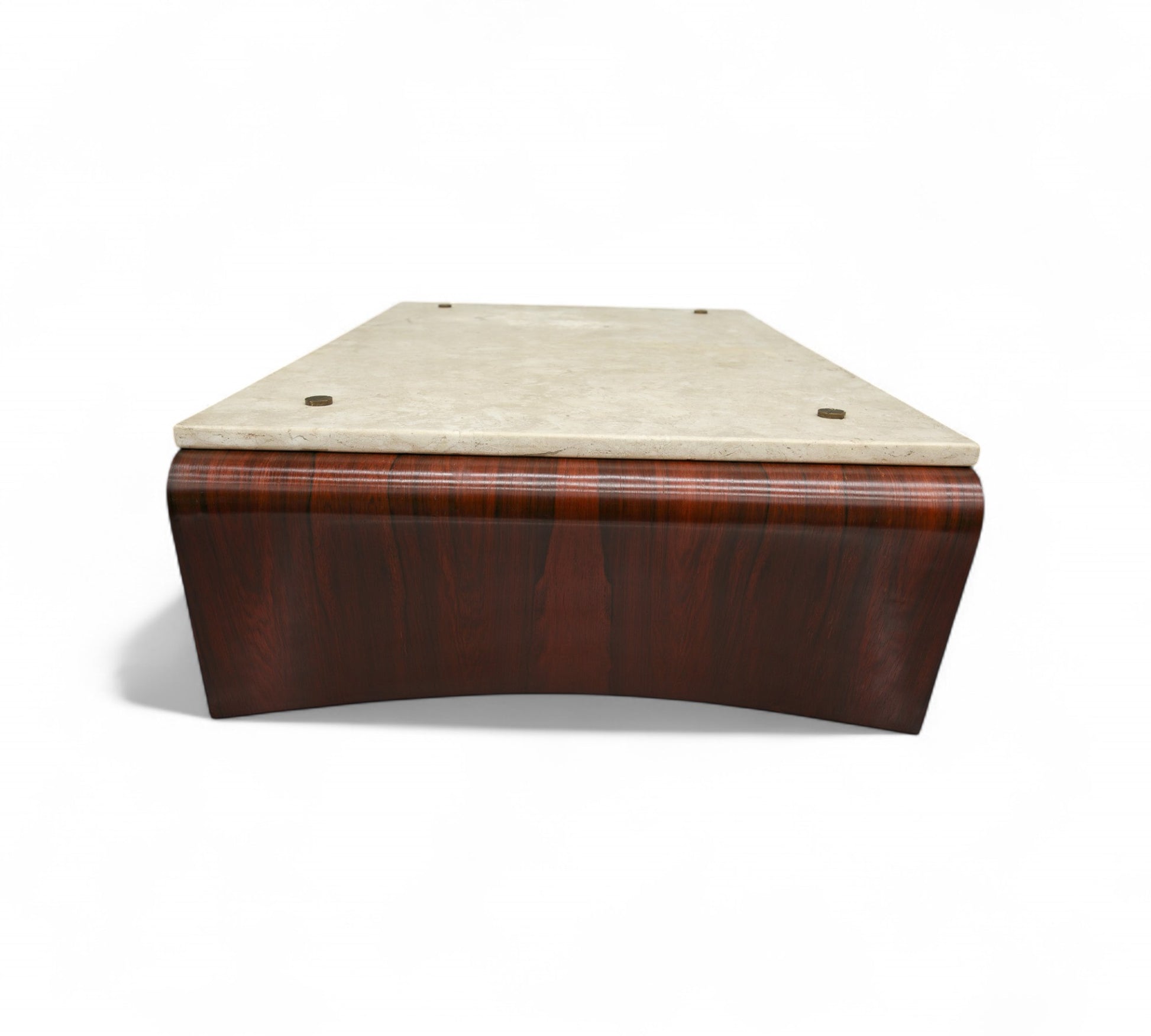 The “Romana” coffee table is a stunning example of minimalist design. Its use of materials - including a curved rosewood base and a travertine slab supported by four brass pins - creates a sense of weightlessness that defies traditional notions of heaviness and lightness. The legs have been expertly refinished and are in excellent condition. This stunning coffee table is a testament to the exceptional craftsmanship of L'Atelier, as evidenced by the stamped numbers on the legs.