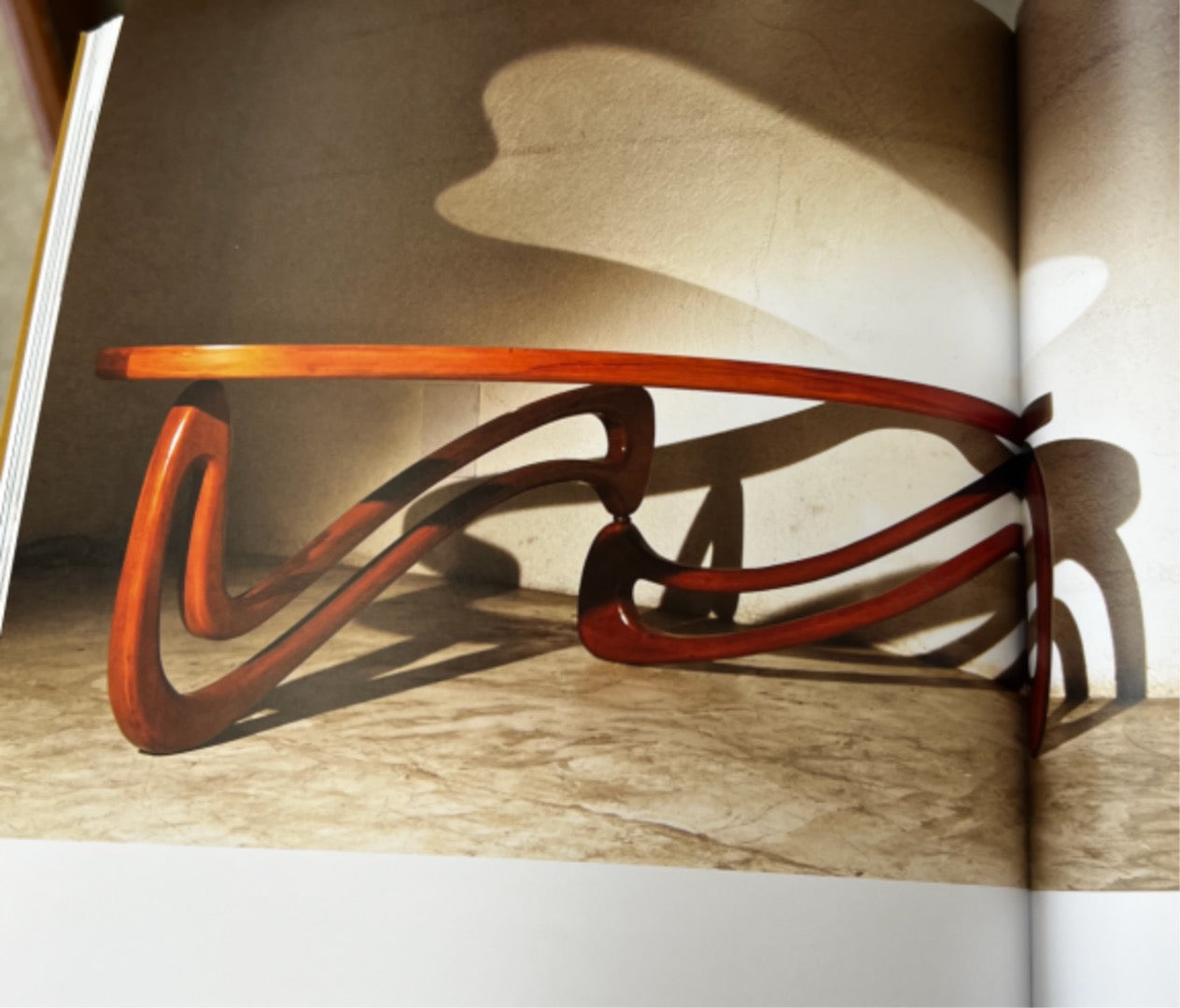 The organic shape of the base of this coffee table, aptly named "Acqua" (Italian for water), allows it to swivel on its axis, dramatically changing its appearance. The coffee table, including the swivel structure and glass, remains unaltered. Due to its delicate design, very few of these tables exist today in their original shape. The wood has been repainted, and while the glass has a couple of dents, the table is otherwise in excellent condition. This iconic design is one of Scapinelli’s most renowned, featured in numerous publications such as "Casa e Jardim" (Brazil House & Garden) and Giuseppe Scapinelli’s book (images attached).