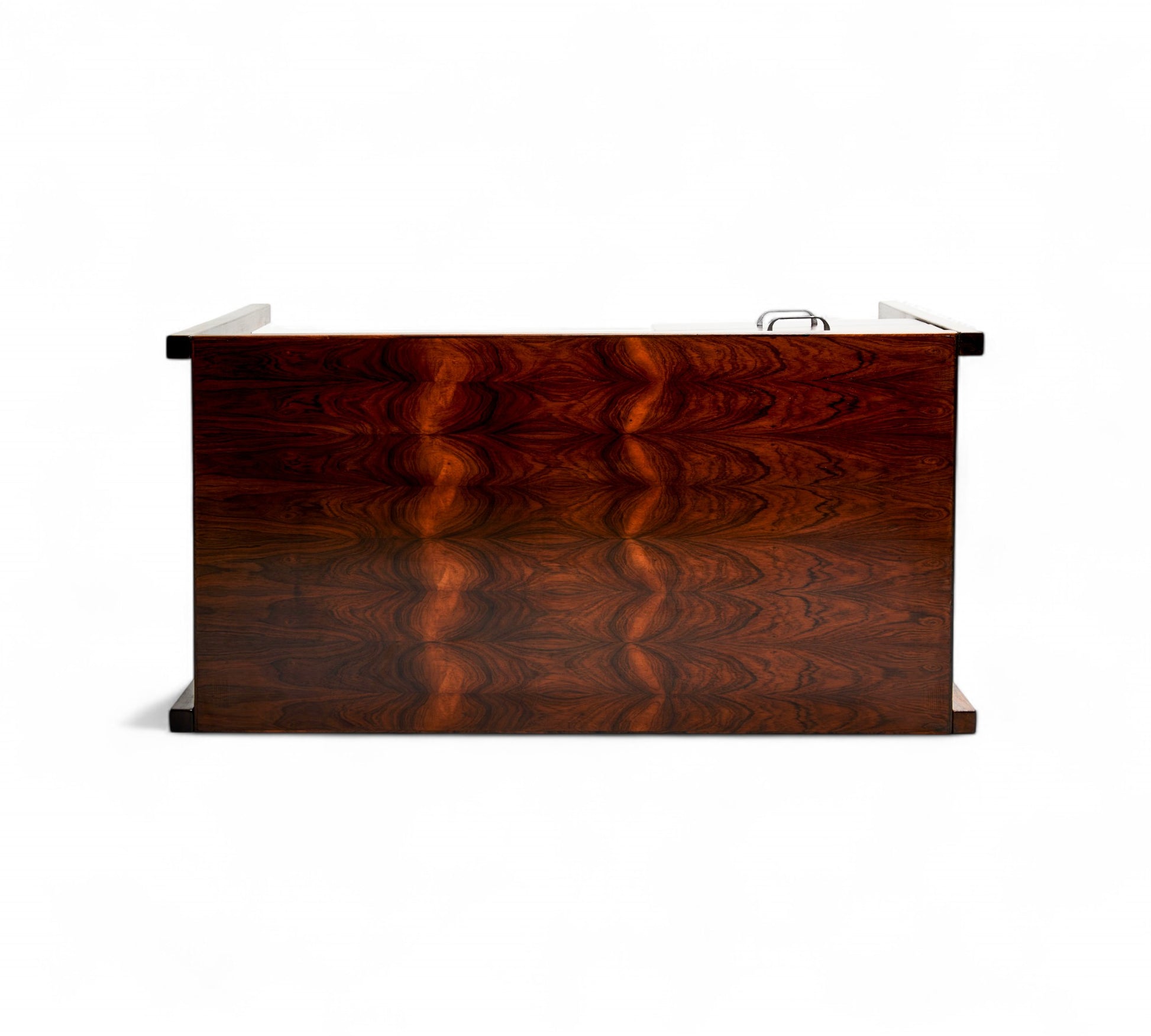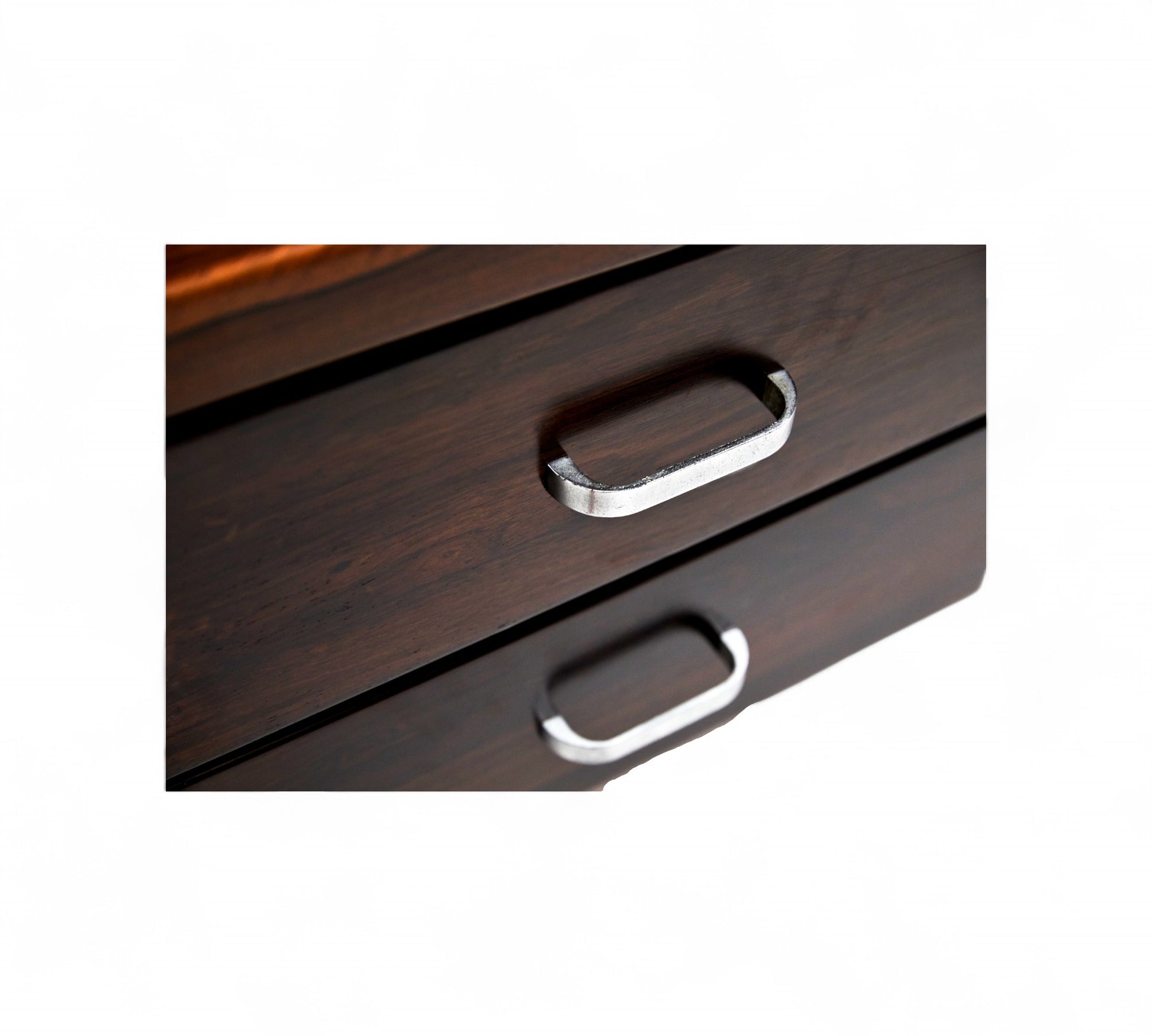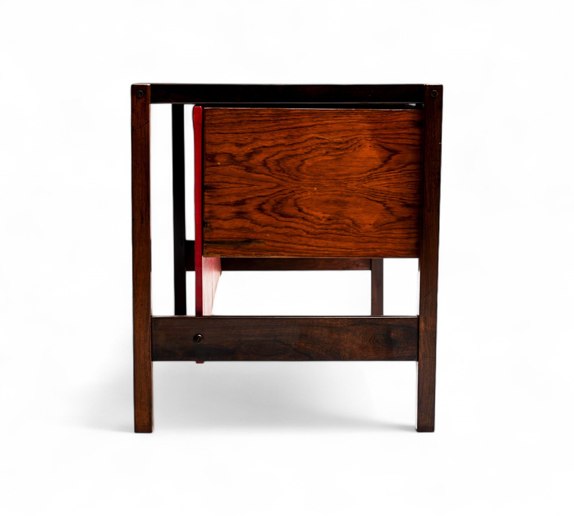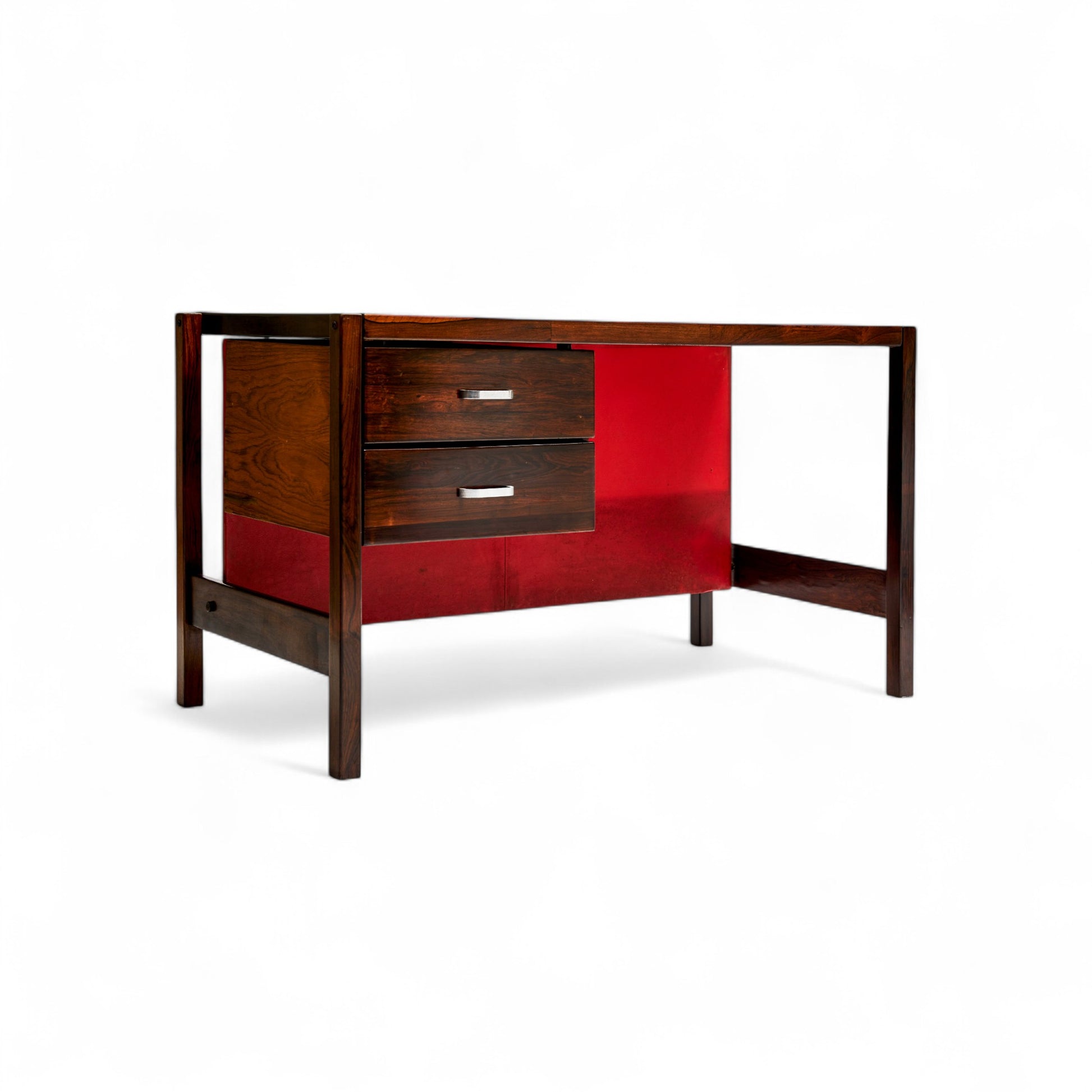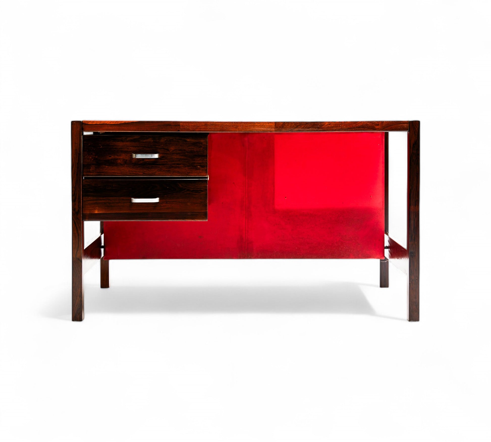 Explore the captivating beauty of this mid-century modern desk designed by Jorge Zalszupin for L'Atelier. Created in the 1960s, the desk highlights the timeless elegance of solid Brazilian rosewood, also known as jacaranda. It boasts two drawers with sleek metal handles and features a smooth wood top with "Acortinado" (curtain in Portuguese) patterns that resemble theater curtains. The deep, rich tone of the wood enhances the allure of this piece, making it versatile enough to complement any home decor style. Meticulously refinished, the desk is in excellent condition, showcasing fine craftsmanship and adding a touch of sophistication to any space.