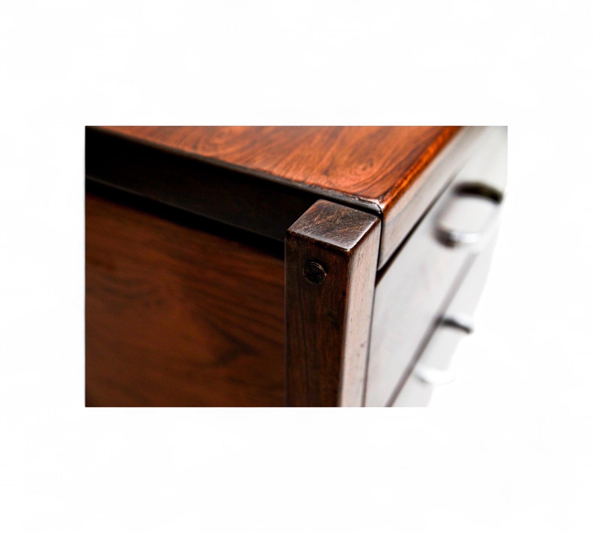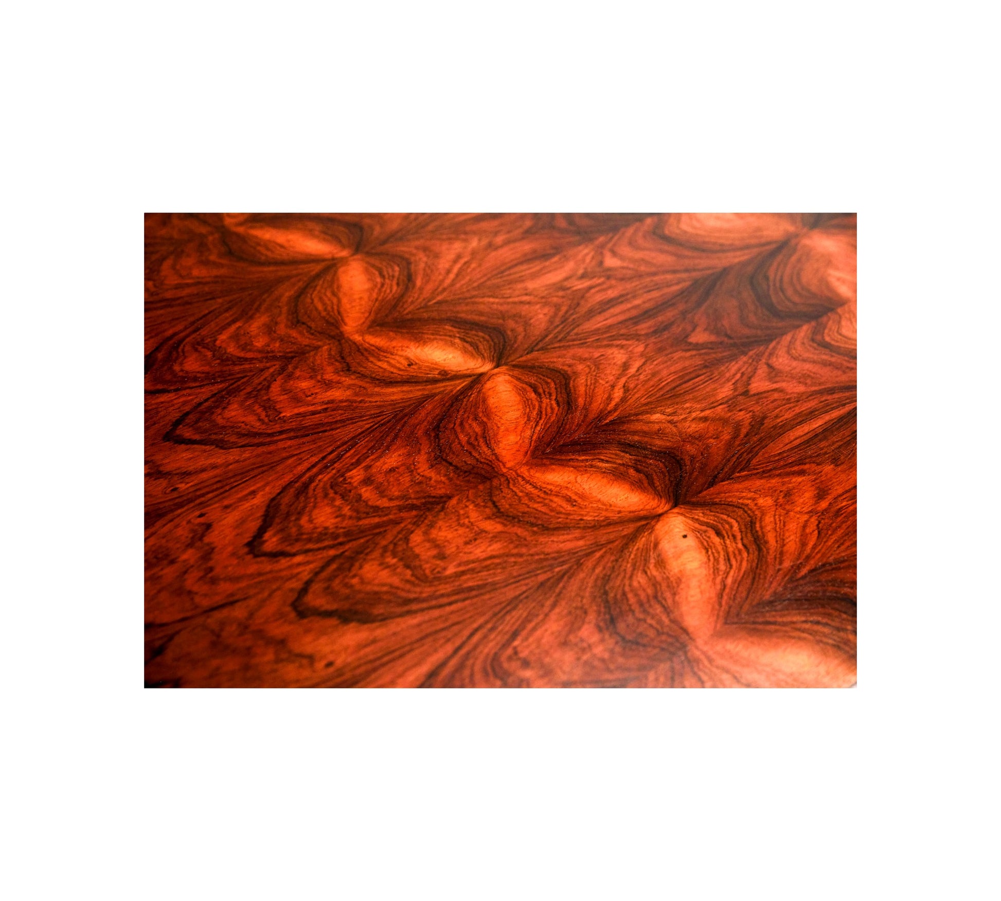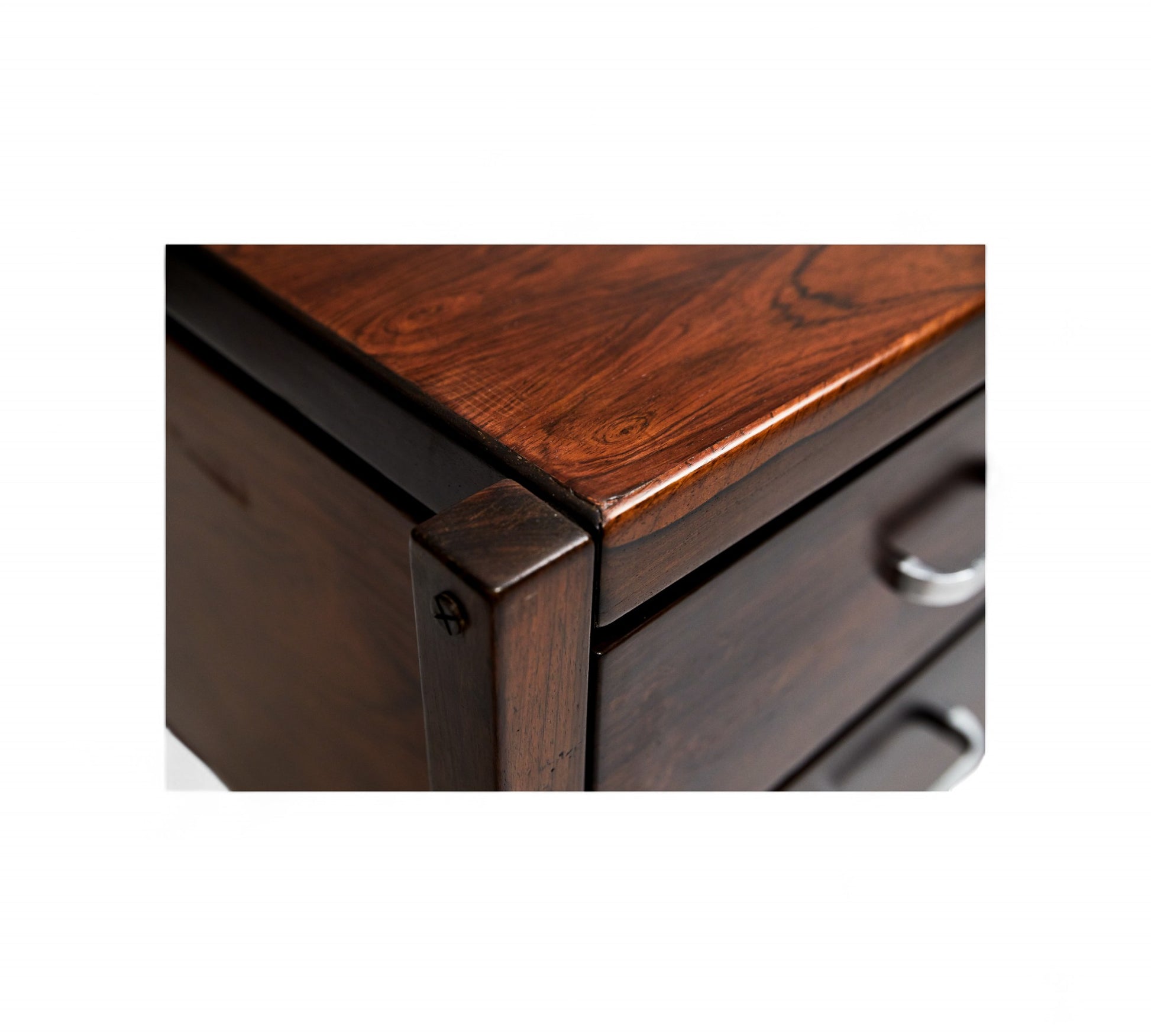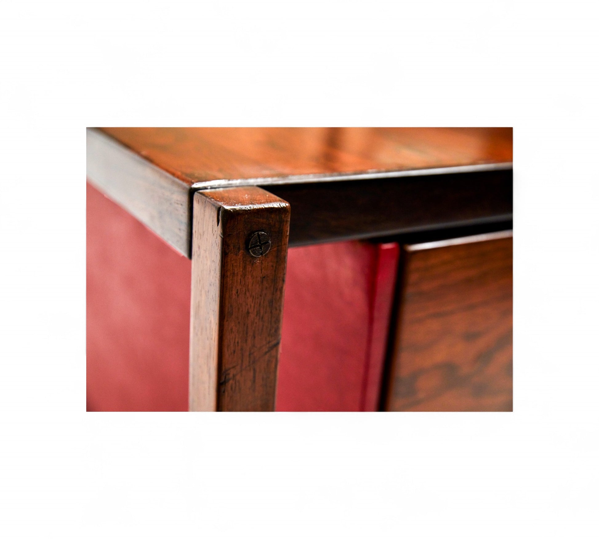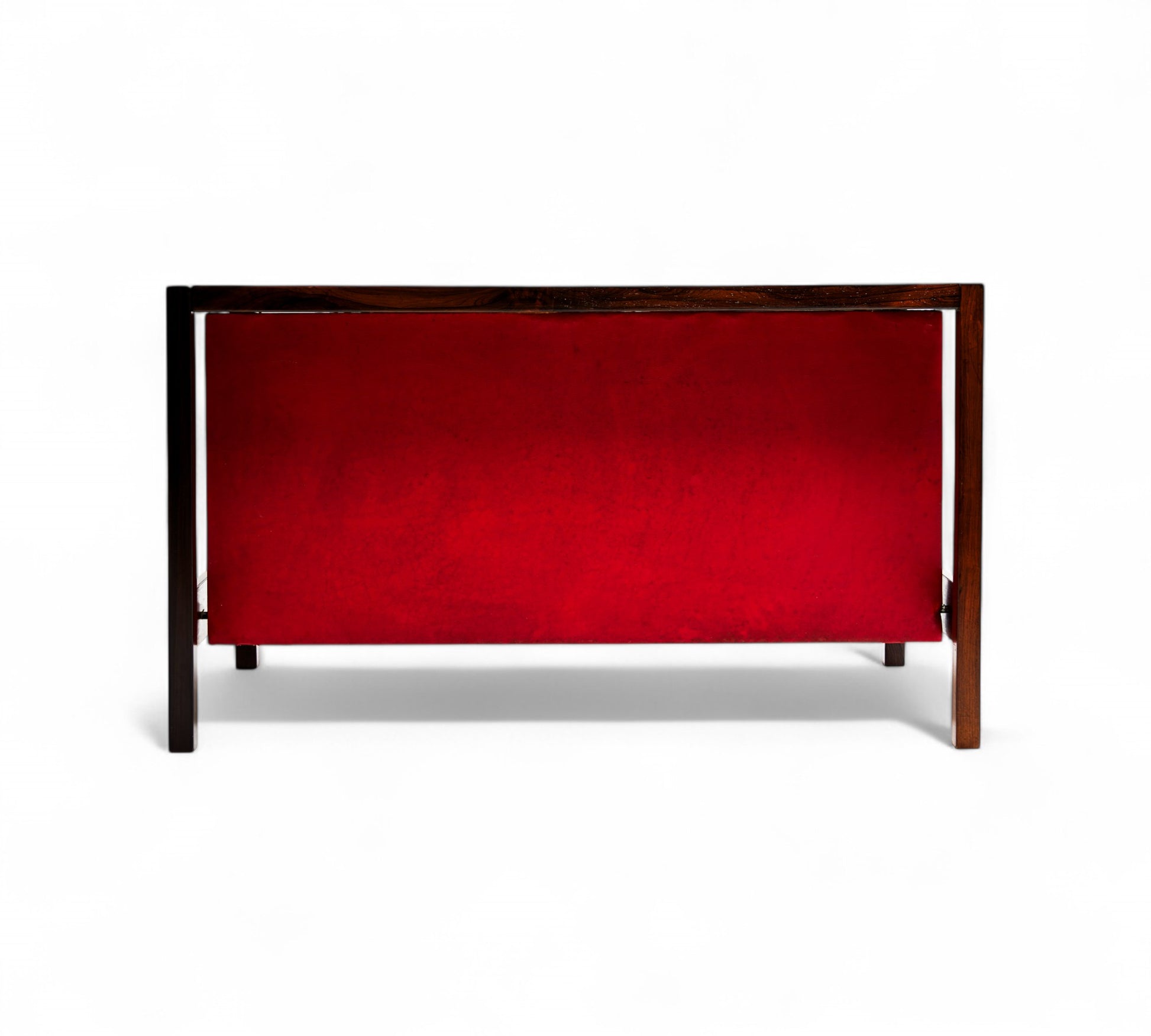 Explore the captivating beauty of this mid-century modern desk designed by Jorge Zalszupin for L'Atelier. Created in the 1960s, the desk highlights the timeless elegance of solid Brazilian rosewood, also known as jacaranda. It boasts two drawers with sleek metal handles and features a smooth wood top with "Acortinado" (curtain in Portuguese) patterns that resemble theater curtains. The deep, rich tone of the wood enhances the allure of this piece, making it versatile enough to complement any home decor style. Meticulously refinished, the desk is in excellent condition, showcasing fine craftsmanship and adding a touch of sophistication to any space.