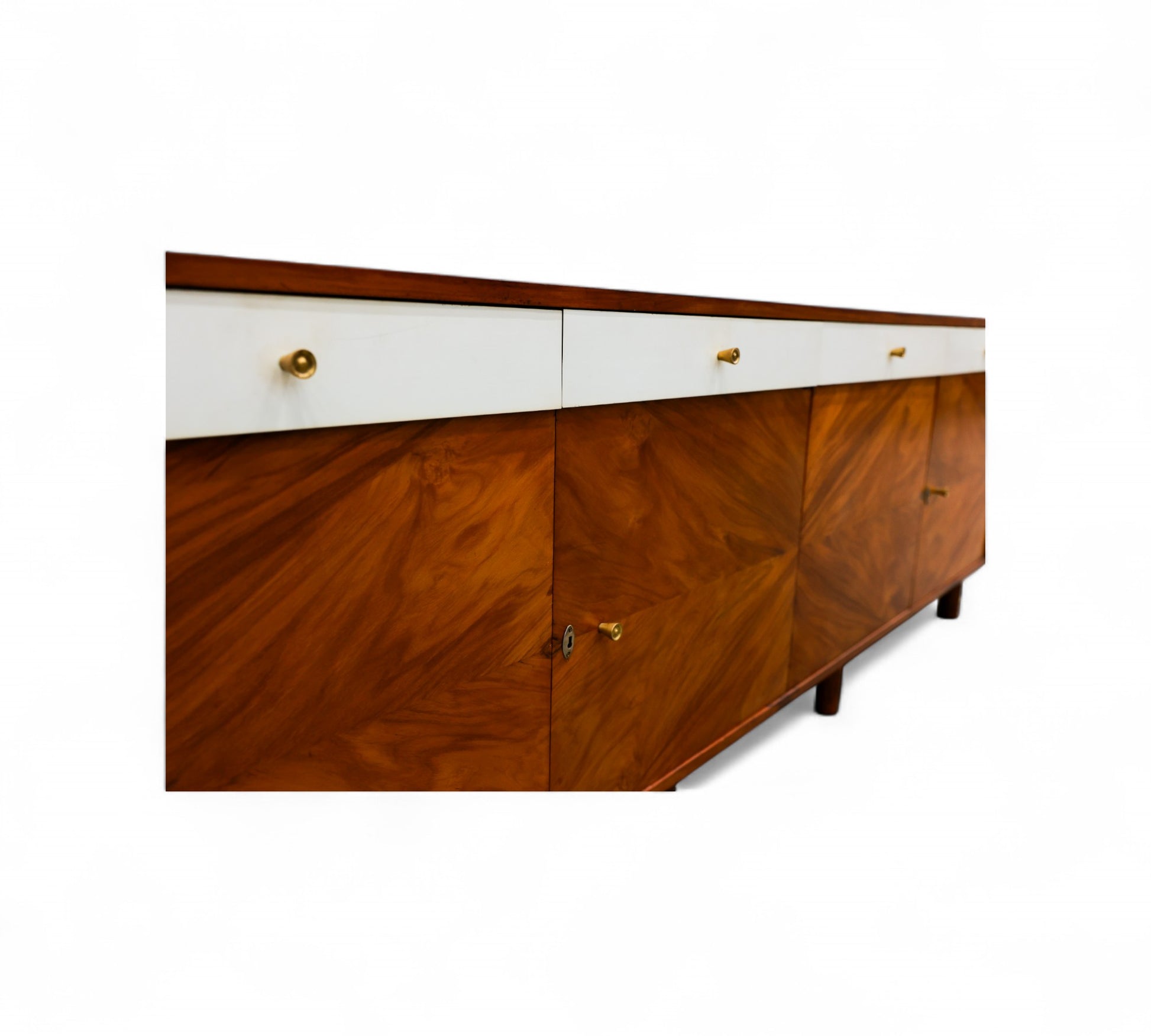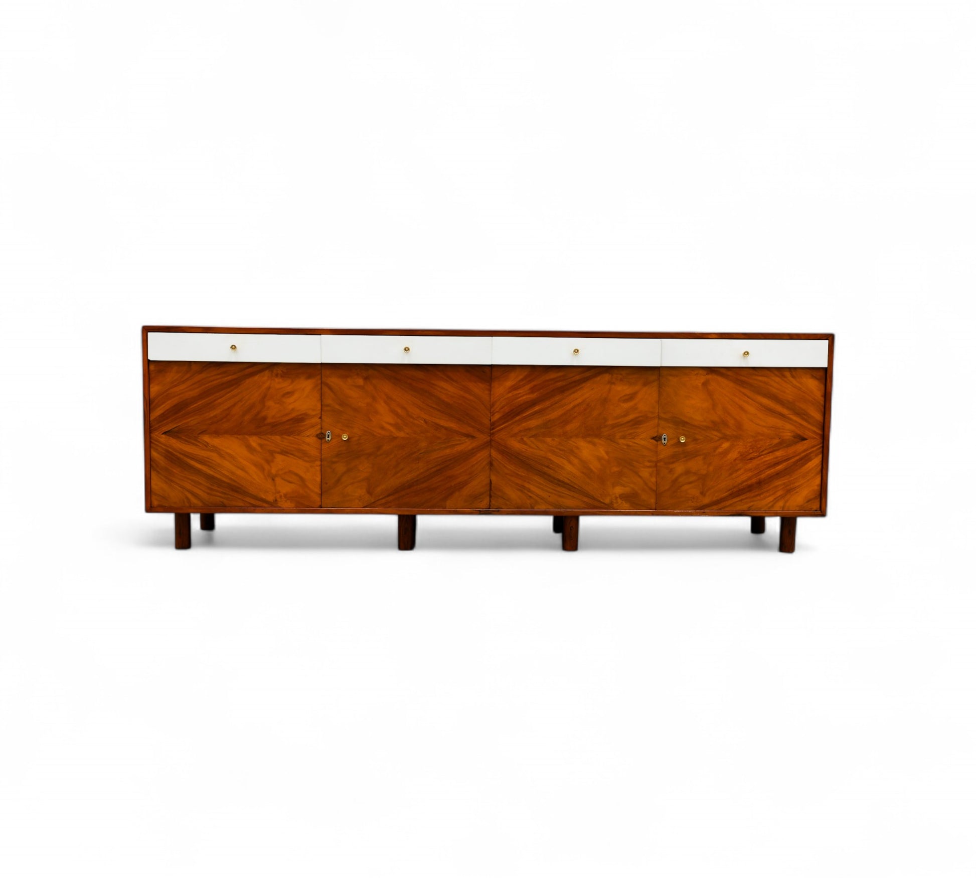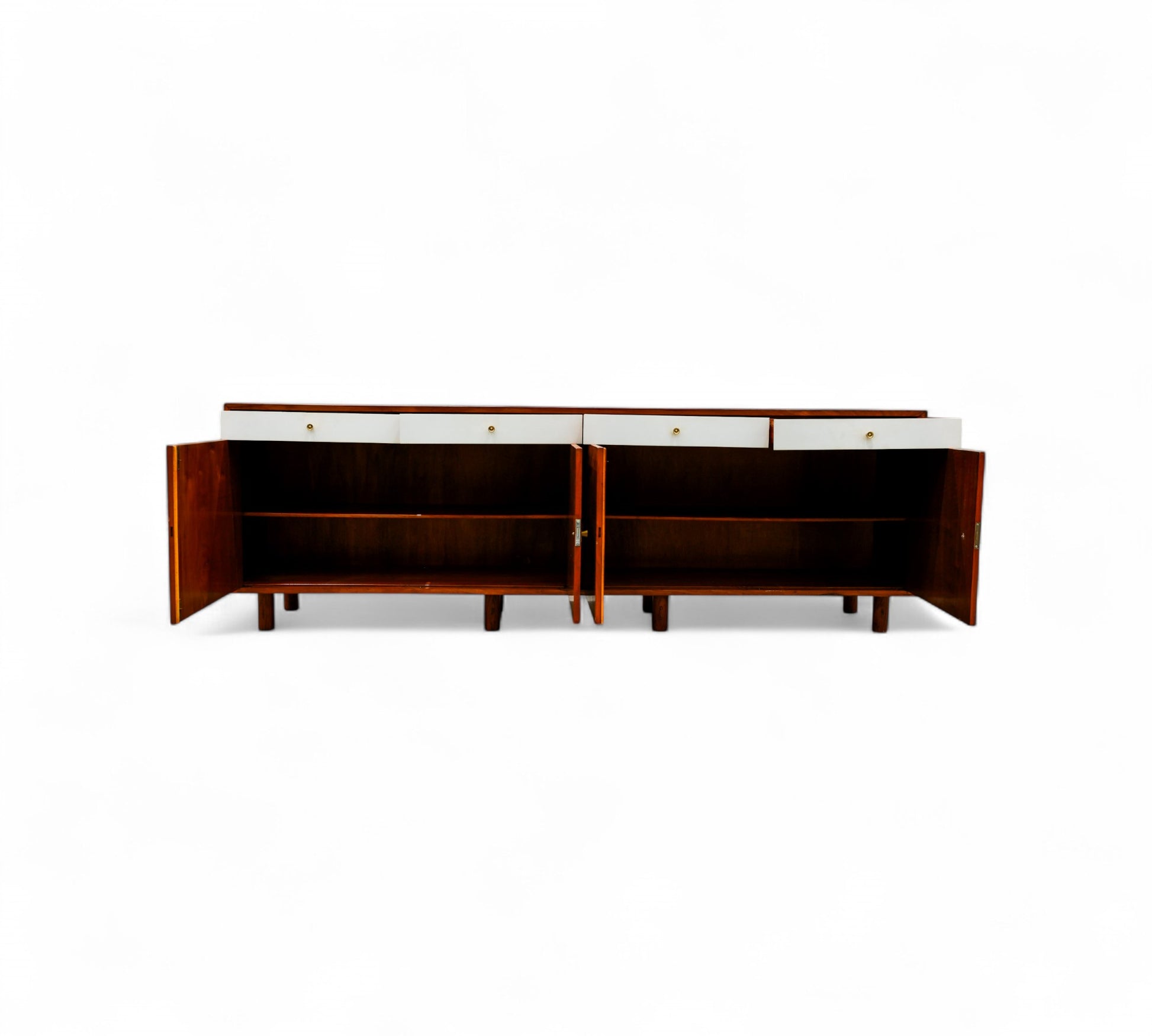 This spectacular mid-century modern credenza is crafted from the finest Caviuna wood and is composed of two identical modules attached to form one large piece. It features 4 doors, 4 drawers, and 4 shelves, with the drawers adorned with Italian beige leather. Each door showcases two Caviuna wood veneer panels, creating a striking pattern. The entire credenza is supported by a total of 8 cylindrical legs, with each module having 4 legs. Purchased at an estate sale in Rio de Janeiro, Brazil, this piece is in excellent condition despite some age marks.