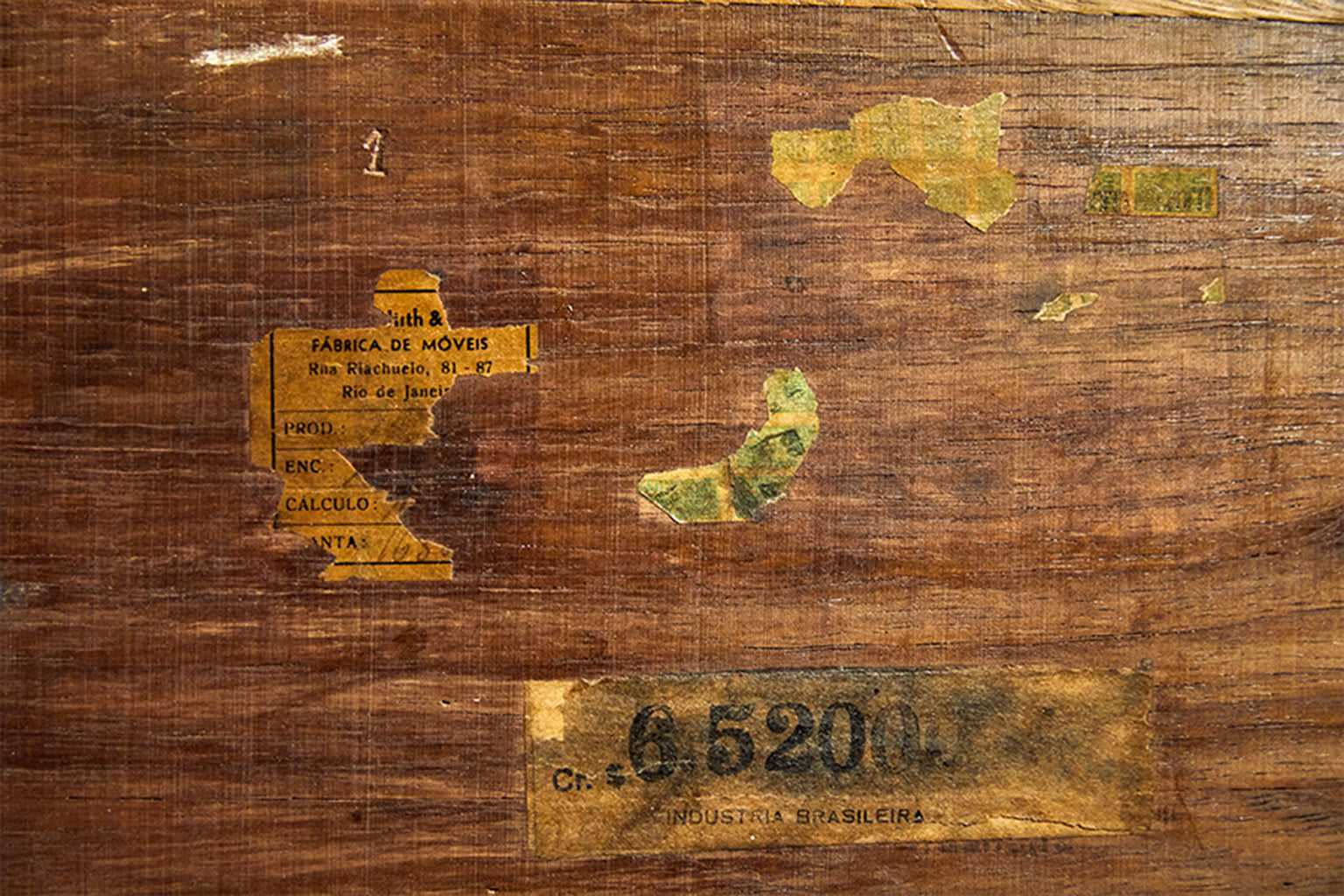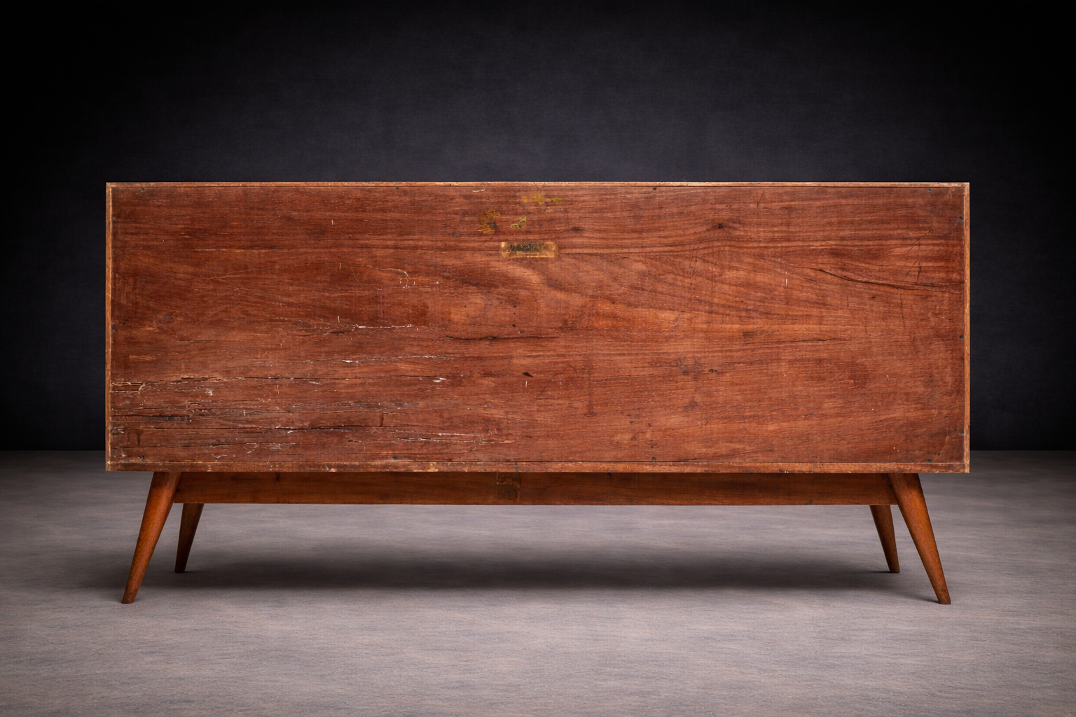 Originally from a private residence in Teresópolis, the piece retains the original Laubisch & Hirth manufacturer’s seal and dated stamp on the rear, confirming its production and period. The wood has been professionally refinished, restoring surface depth while preserving material integrity. Presented in excellent vintage condition, this credenza stands as an important early example of Tenreiro’s transition toward a distinctly modern Brazilian design vocabulary.