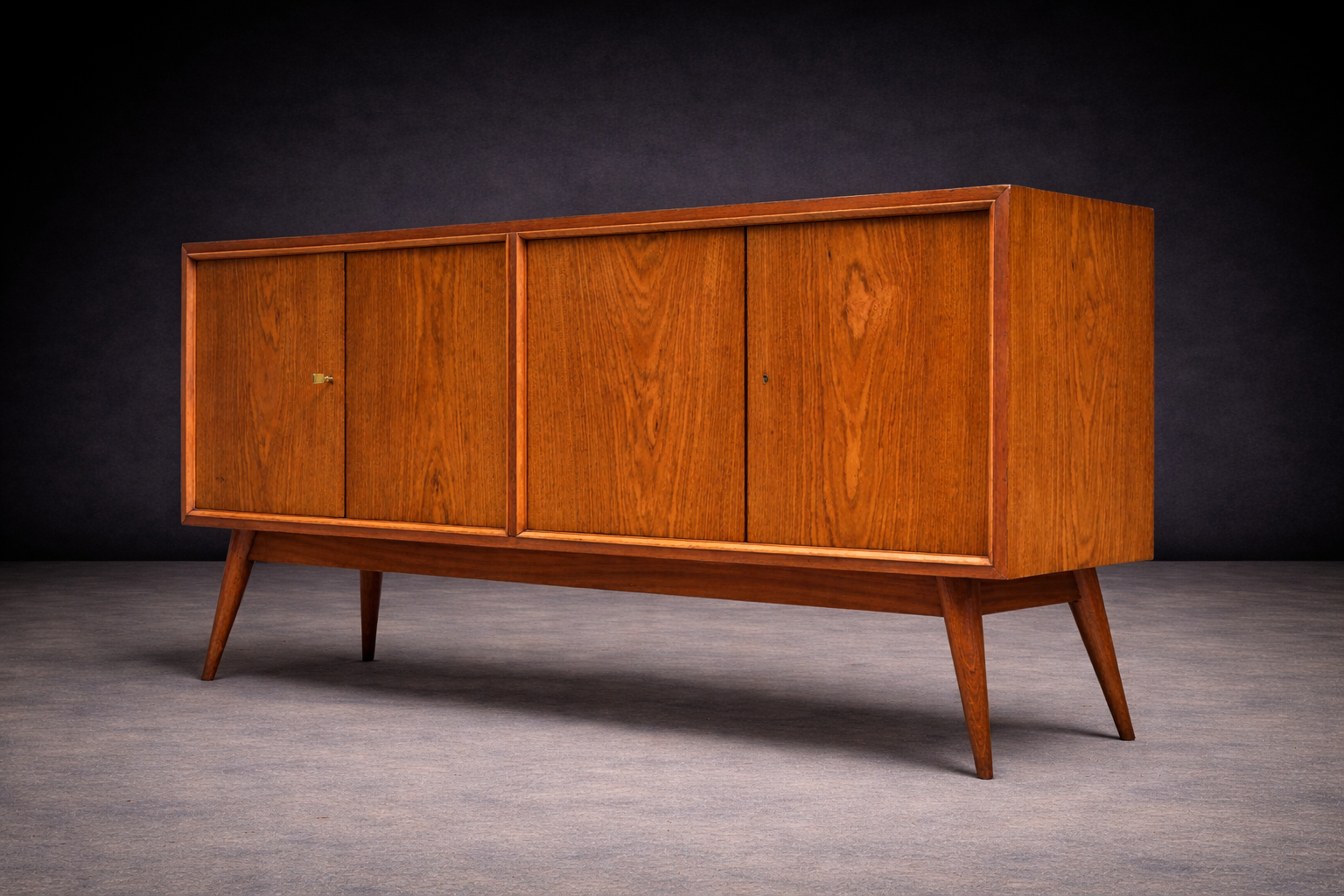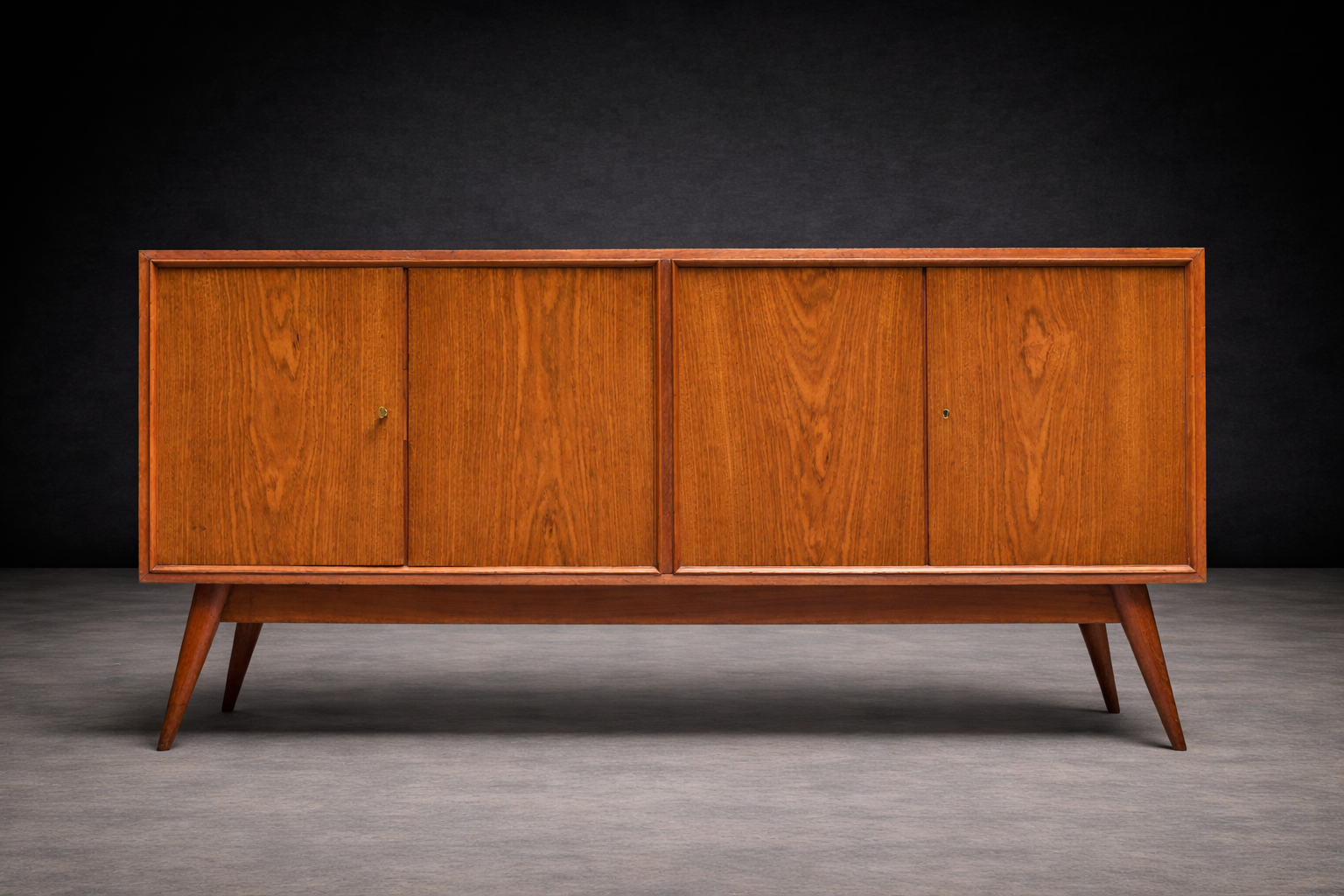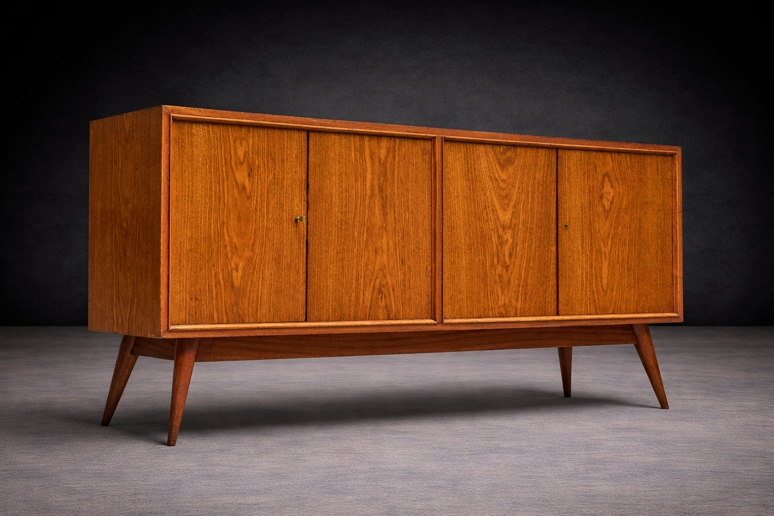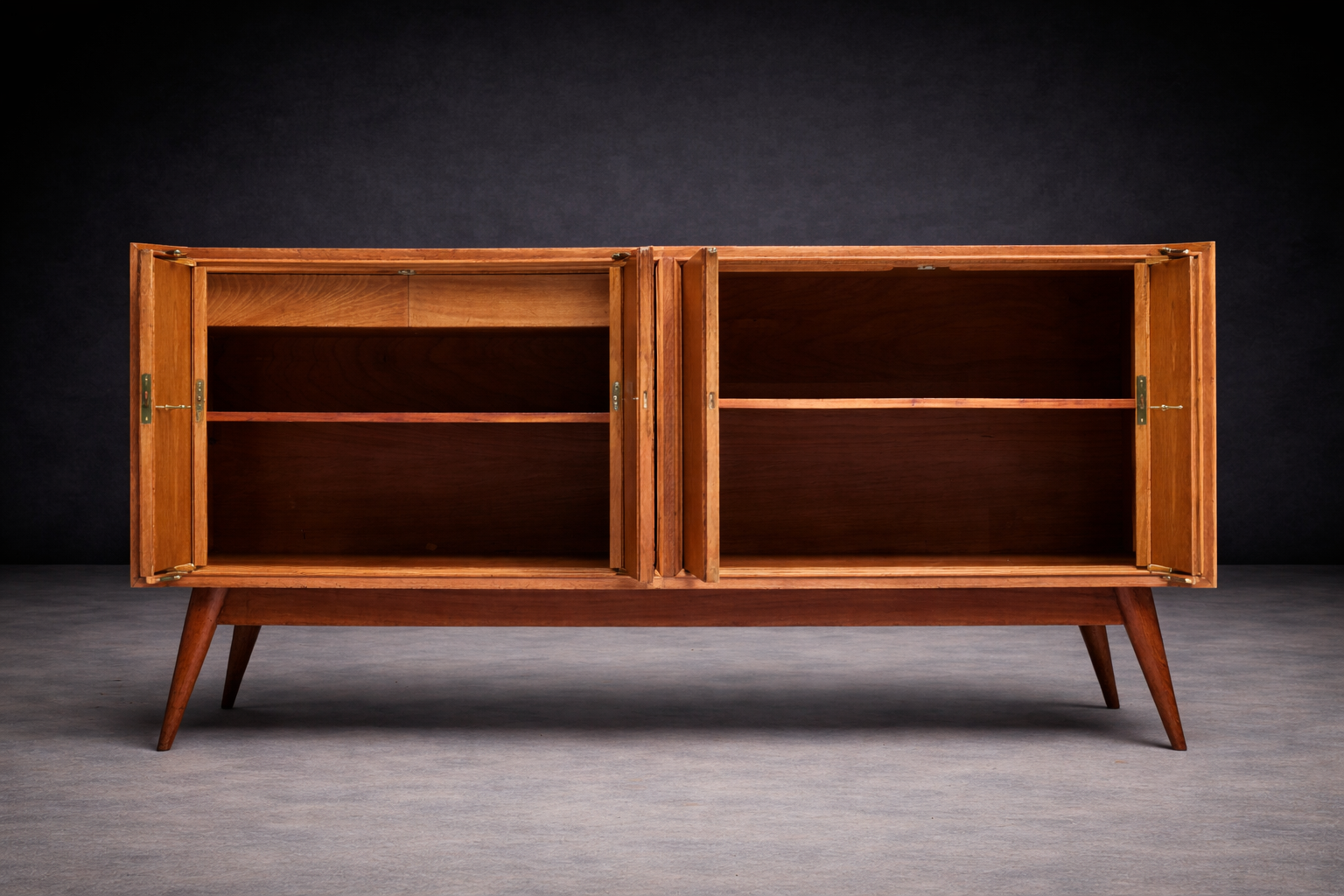 The credenza is crafted from cherry hardwood, it features four hinged doors opening to two interior shelves, along with two integrated drawers. The composition is elevated on four slender legs, lending visual lightness while maintaining architectural balance. The design reflects Tenreiro’s early exploration of proportion and functional clarity, elements that would later become central to Brazilian modern furniture.