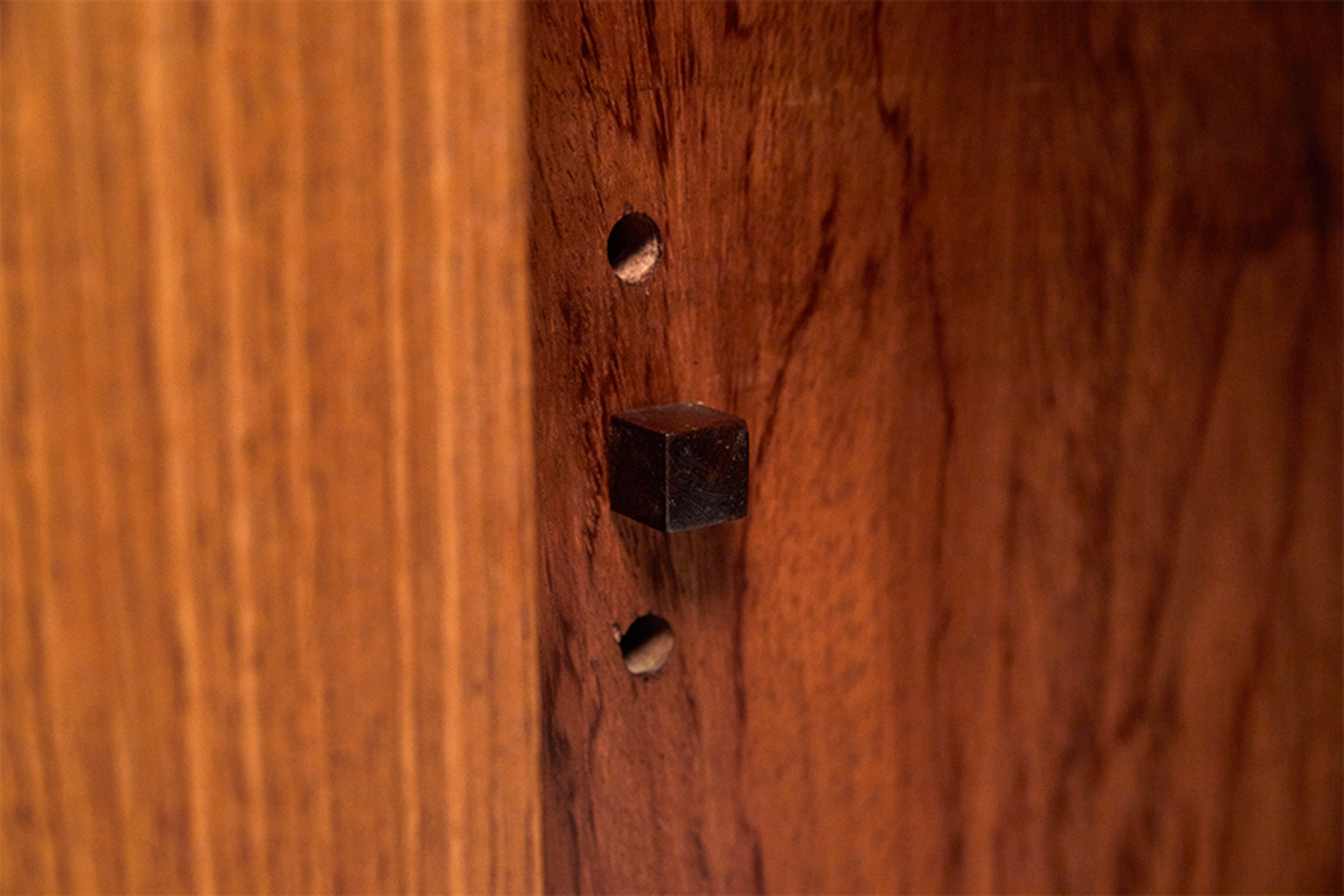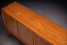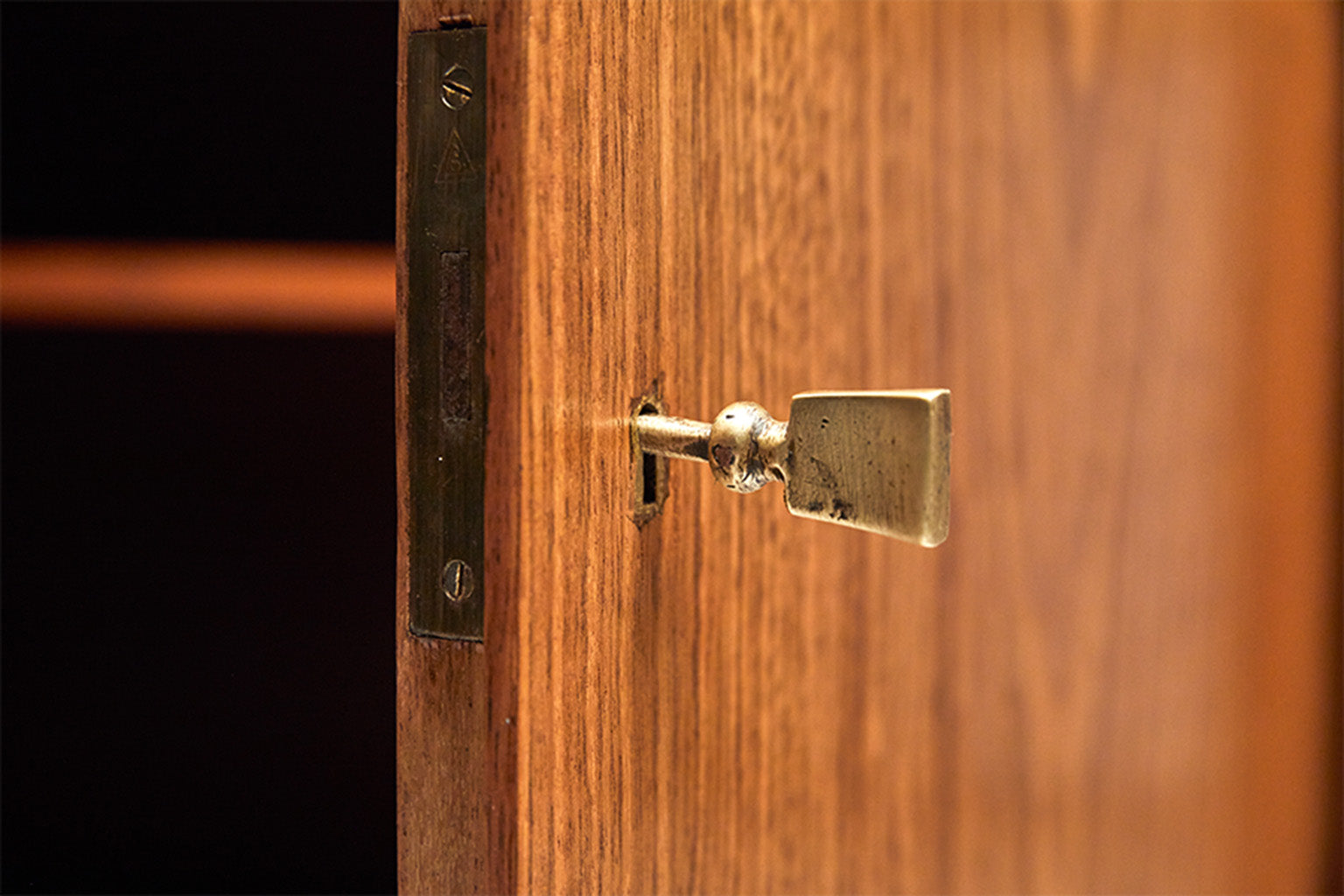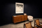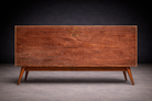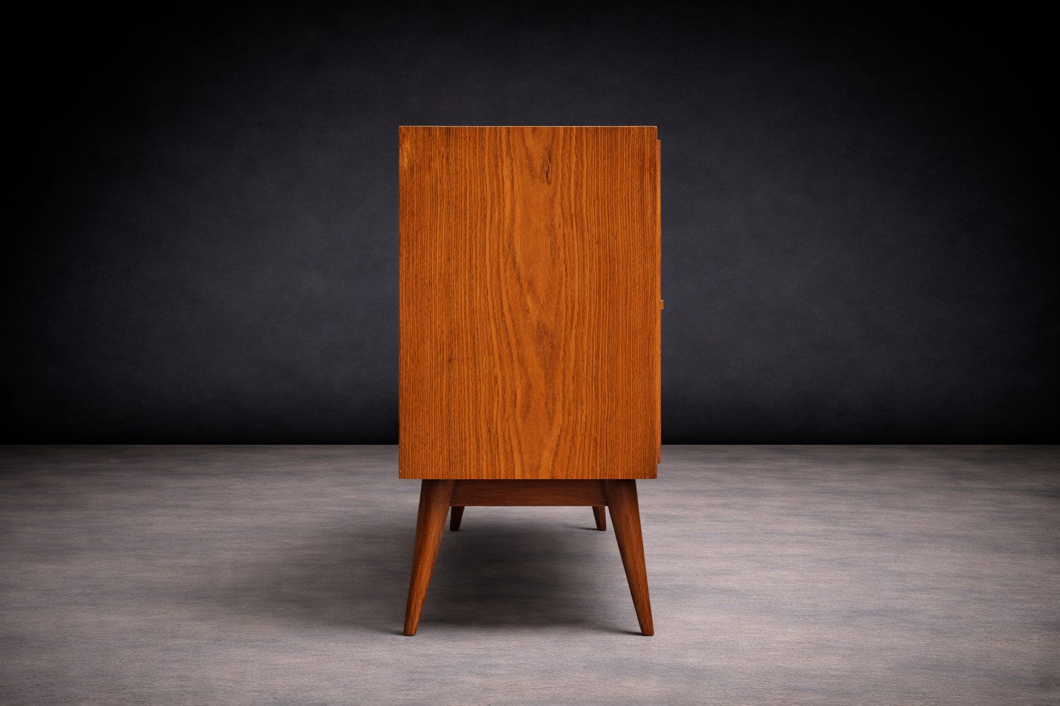 The credenza is crafted from cherry hardwood, it features four hinged doors opening to two interior shelves, along with two integrated drawers. The composition is elevated on four slender legs, lending visual lightness while maintaining architectural balance. The design reflects Tenreiro’s early exploration of proportion and functional clarity, elements that would later become central to Brazilian modern furniture.