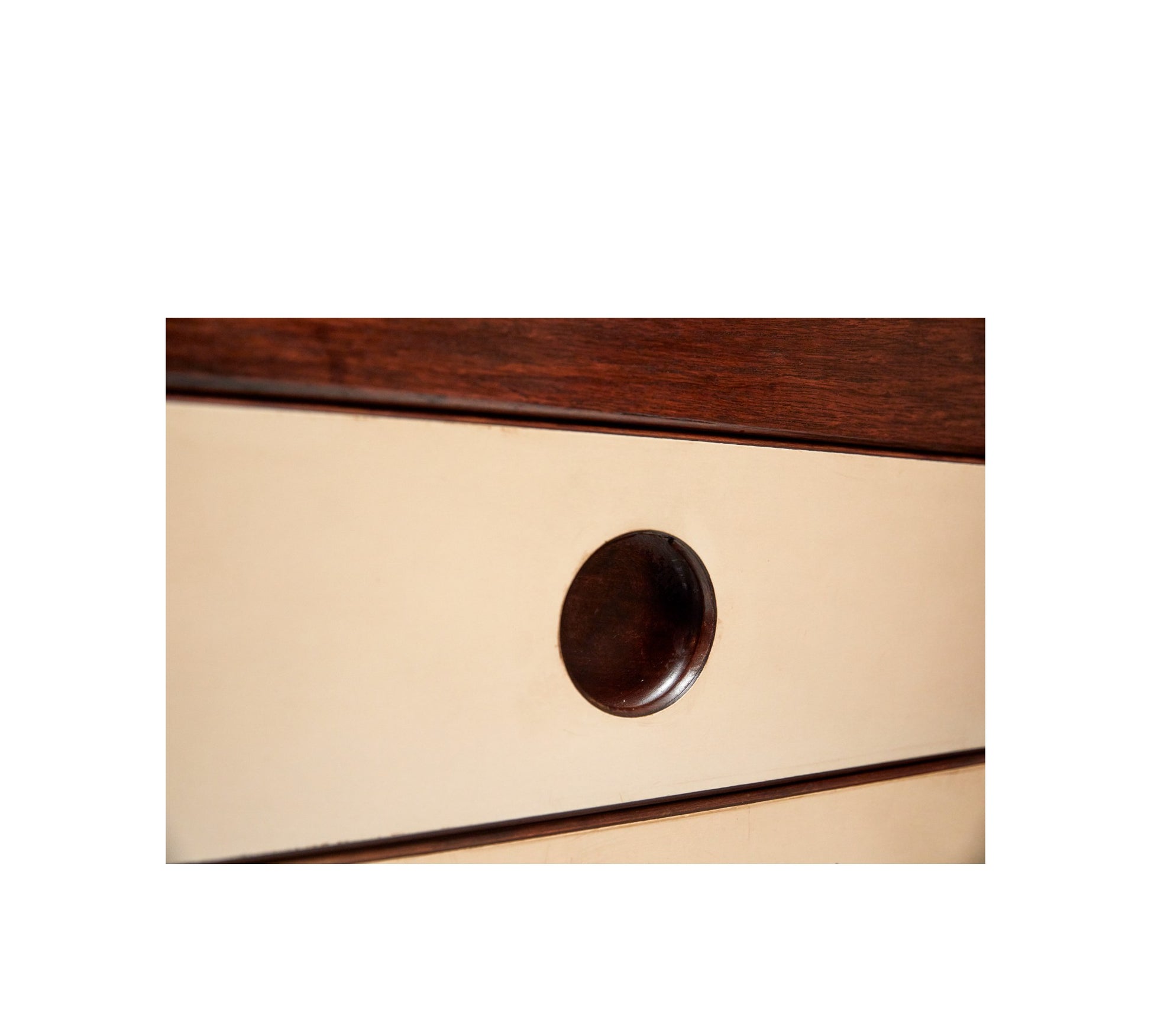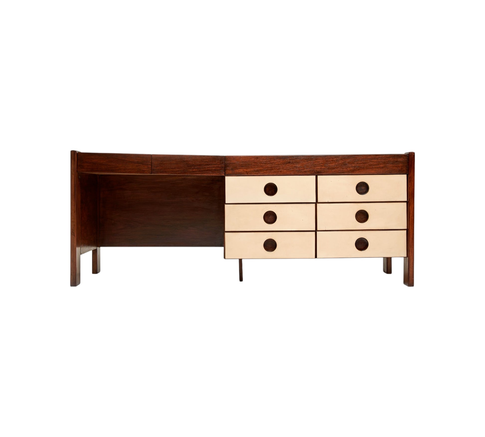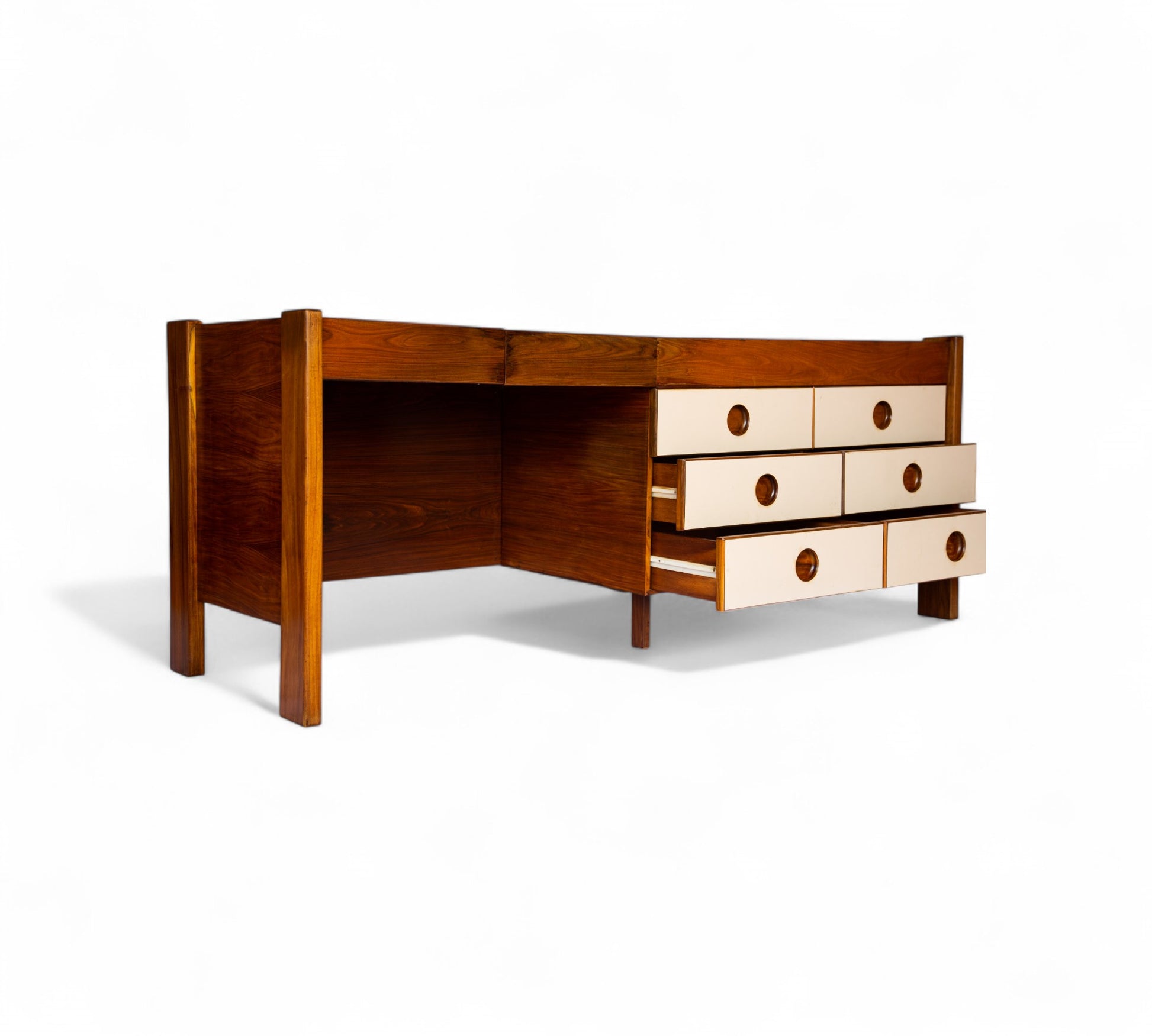 This desk, originally from the Hotel Nacional of São Conrado in Rio de Janeiro, designed by architect Oscar Niemeyer in 1970, retains its heritage plaque. Crafted by Jorge Zalszupin for L’Atelier, it is made from caviuna hardwood with white Formica finishes. Following this project, L’Atelier introduced the Hotel Line, featuring similar styles of coffee tables, benches, and chairs. The wood has been refinished, showing some signs of age while remaining in excellent condition. The desk features six beige drawers on the right side and two brown drawers on the left. Its elegant design makes it suitable for various interior design styles.