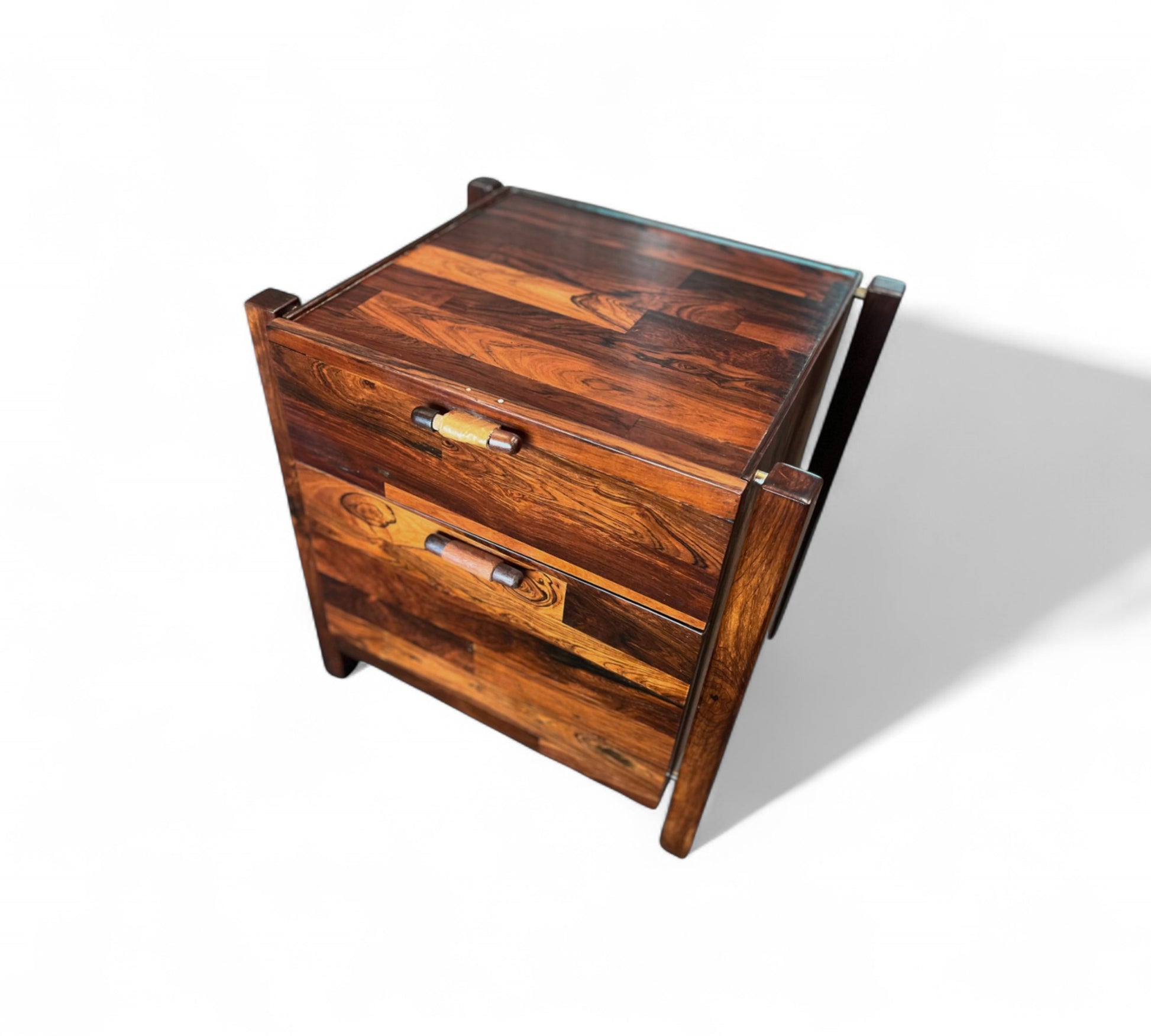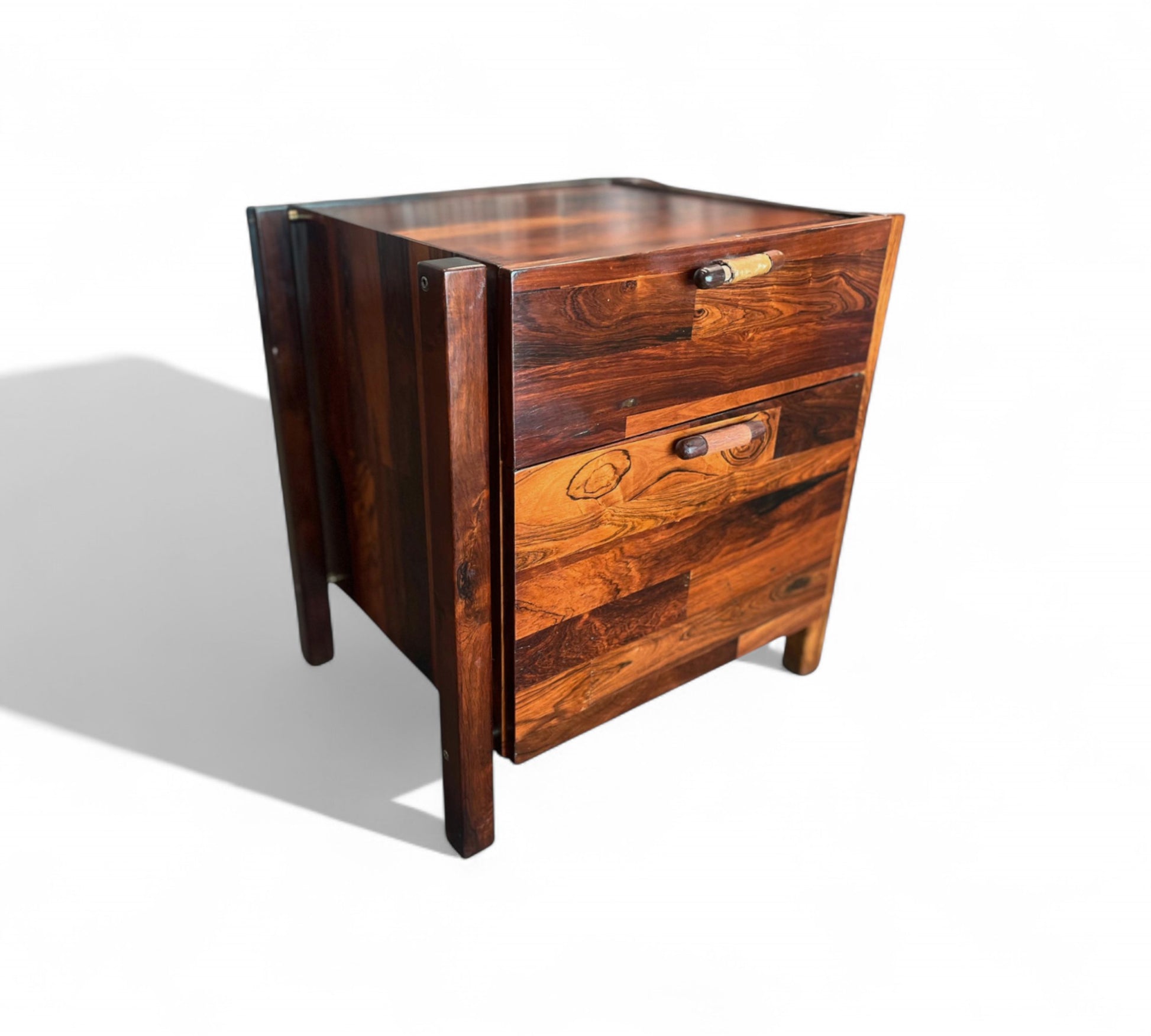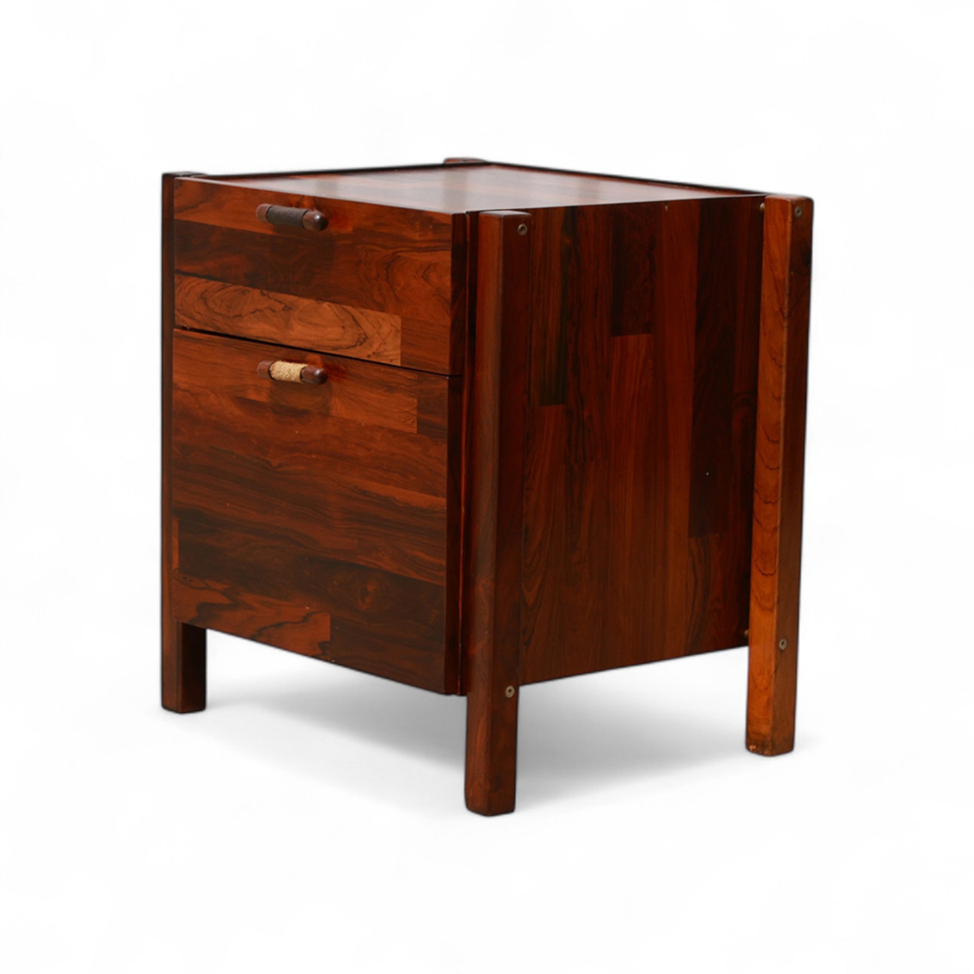 This filing cabinet was designed by Jorge Zalszupin in the 1960s and consists of two drawers with leather handles and four wooden legs in patchwork style. The rosewood patchwork (collage using several pieces of rosewood, with different tones) was one of Zalszupin’s most characteristic traits. This was an initiative for the rationalization and use of left-over scraps of wood available at the factory. This type of office furniture was meant to address the growing demand for office furniture in the new capital Brasilia.