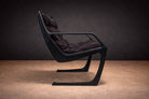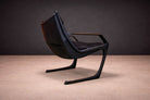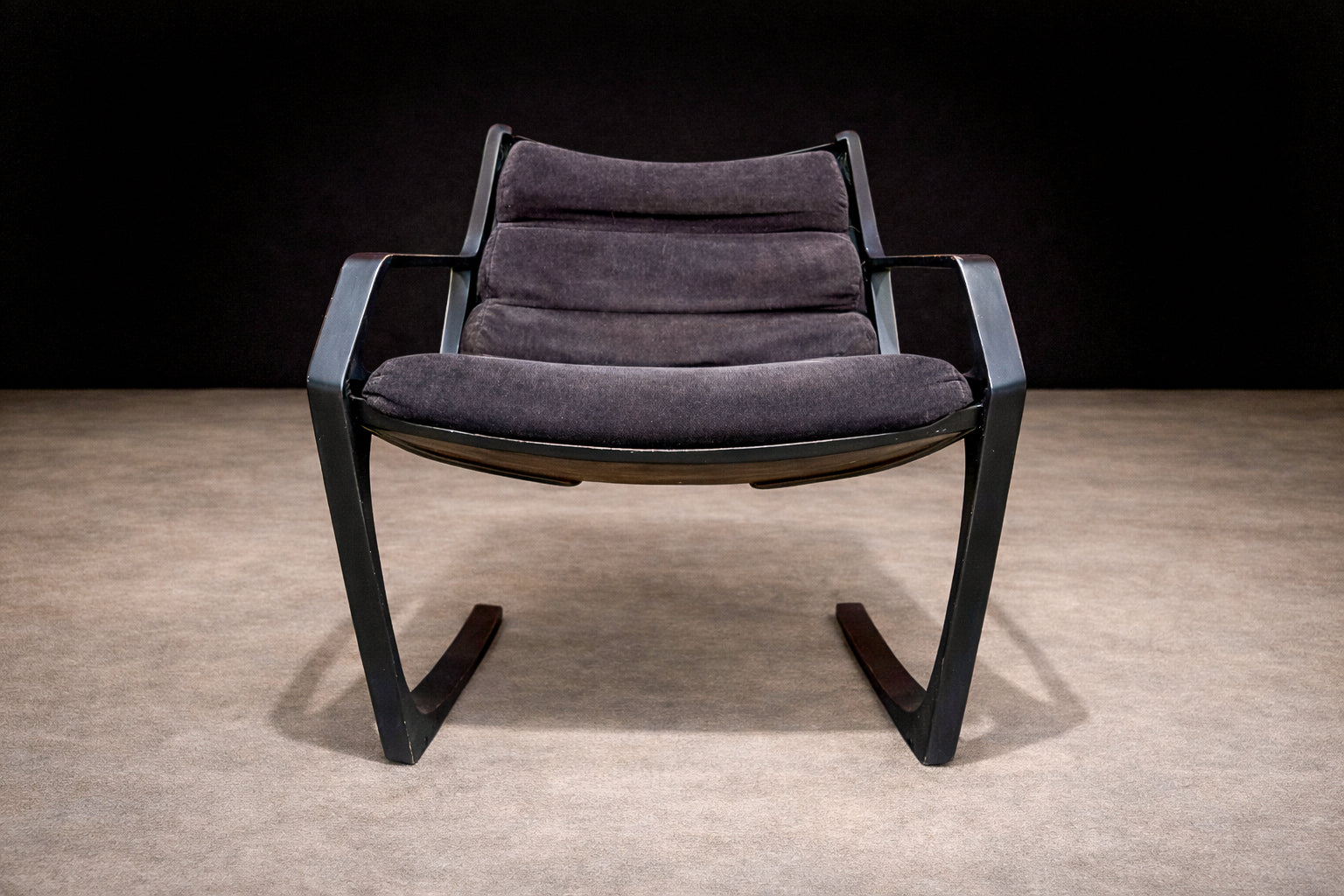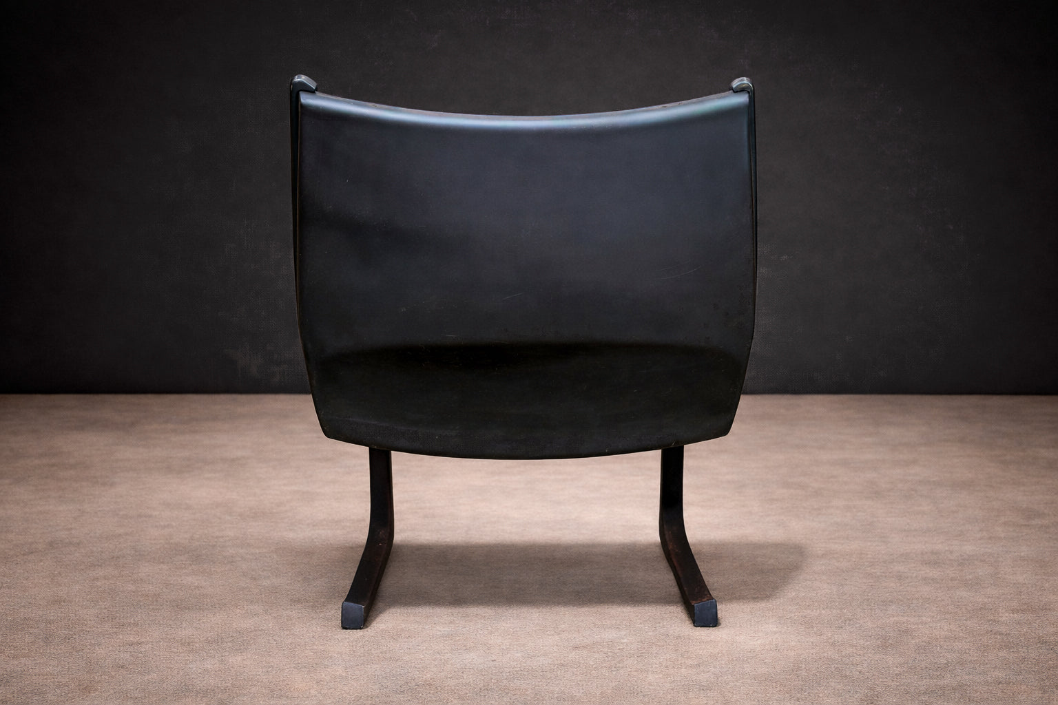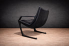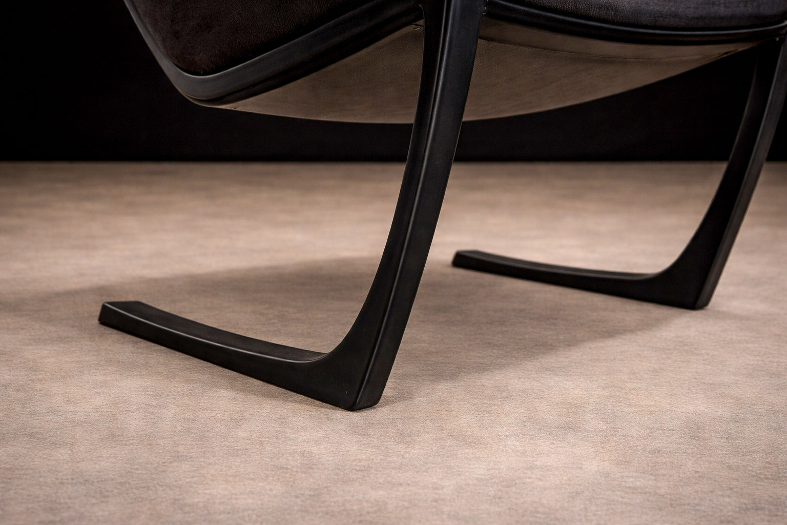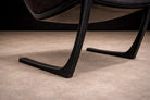 The chair is defined by a continuous, sculptural frame whose cantilevered profile establishes both movement and balance. The arms extend in a single, fluid gesture, tapering toward the back before descending into sled-style supports that anchor the composition with architectural precision. This open geometry creates a dynamic interplay between negative space and mass, giving the piece its characteristic lightness despite its robust construction.