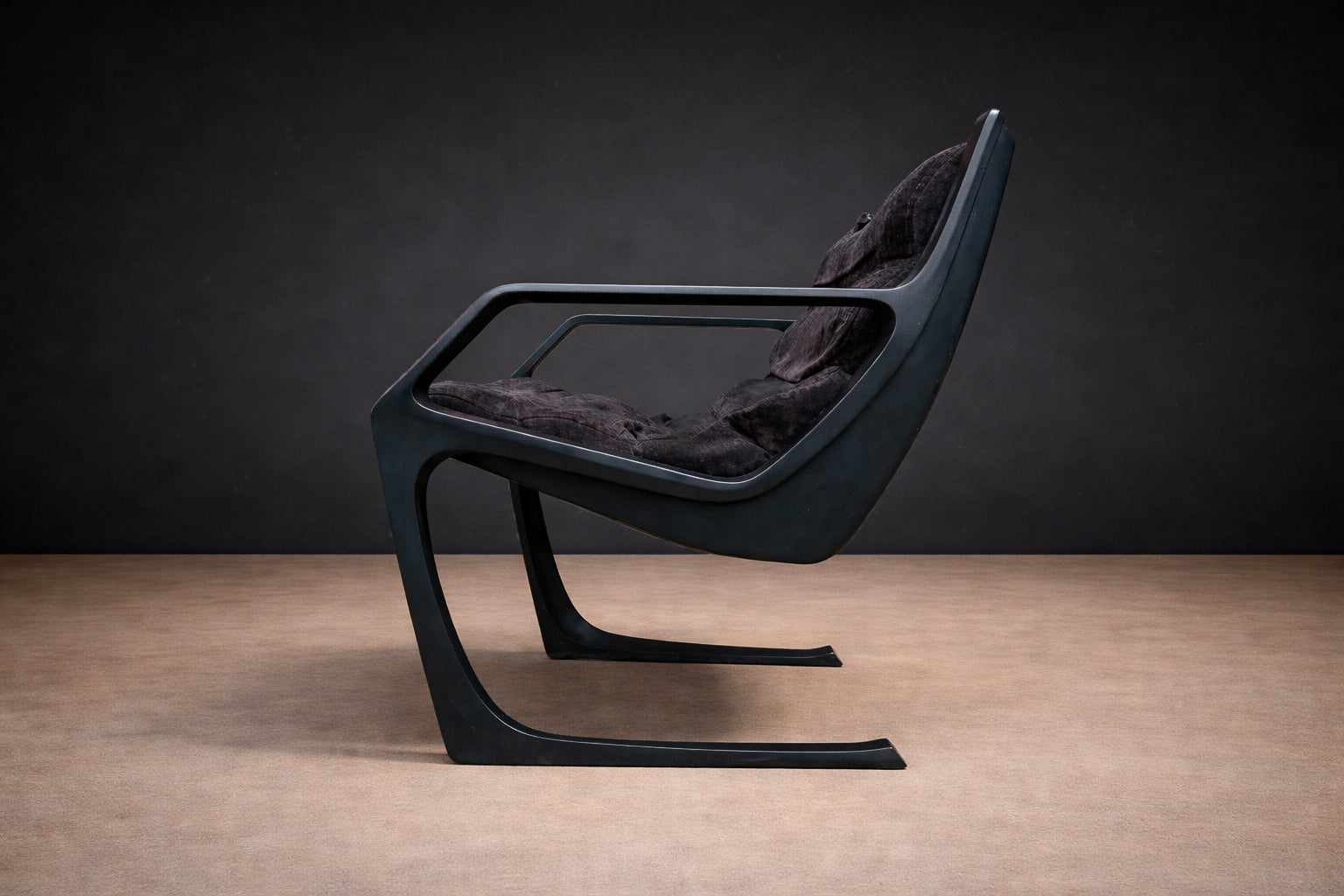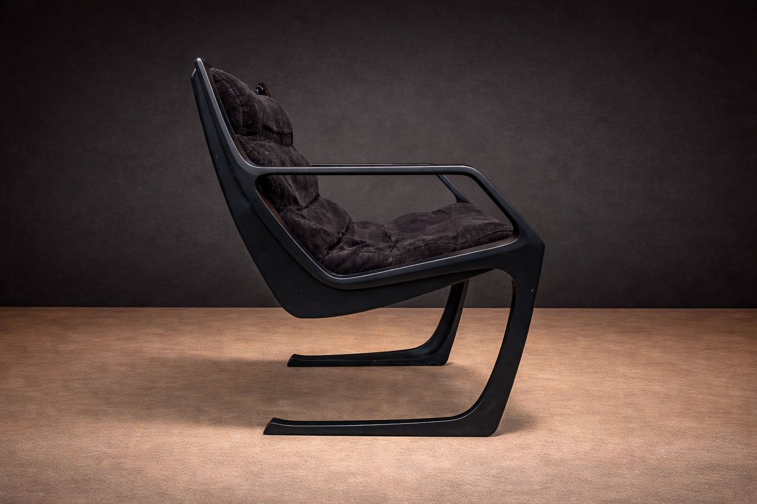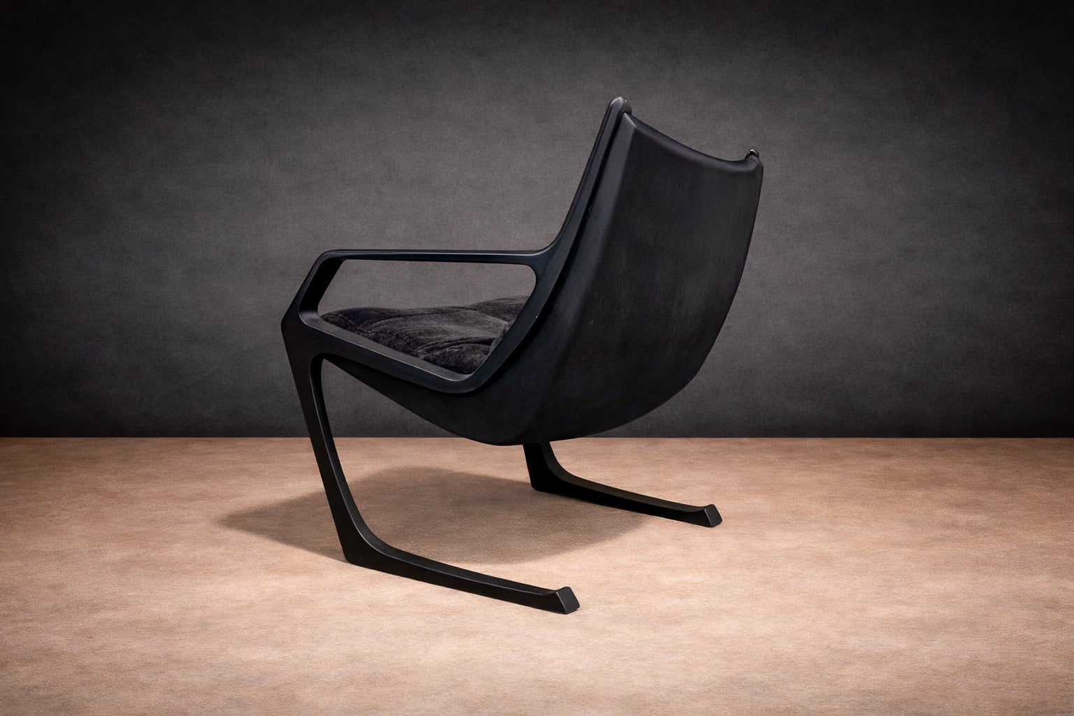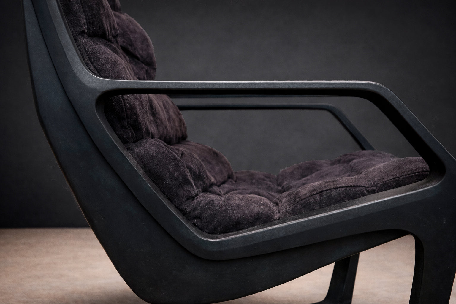 Deeply cushioned seat and back elements are suspended within the frame, allowing comfort to be integrated seamlessly into the structural logic. The upholstery—rendered in a dark, richly textured fabric—absorbs light and enhances the contrast between soft volume and rigid line. The result is a composition defined by tension: angular yet relaxed, architectural yet inviting.