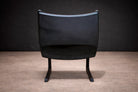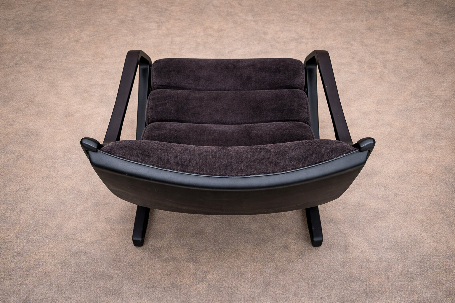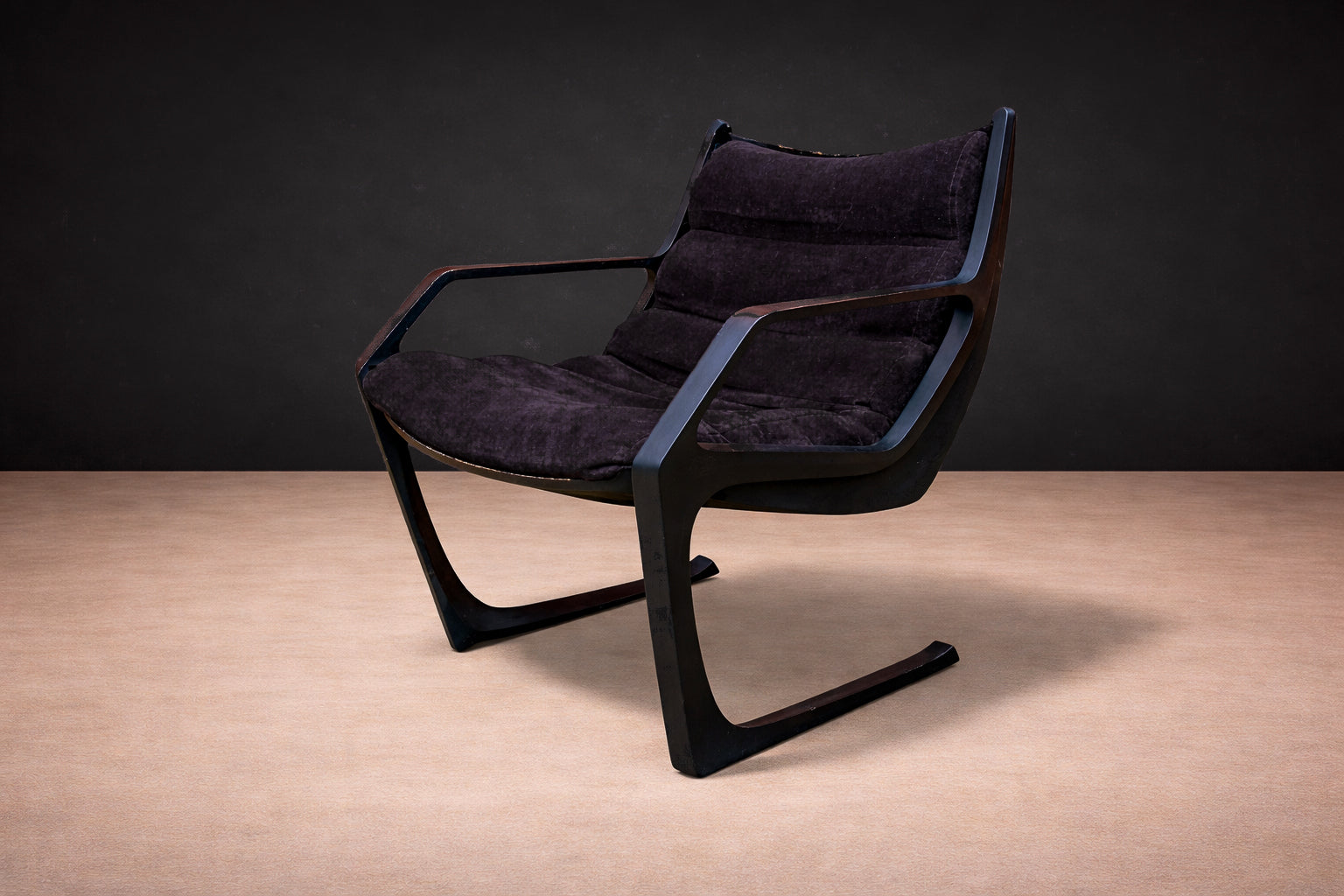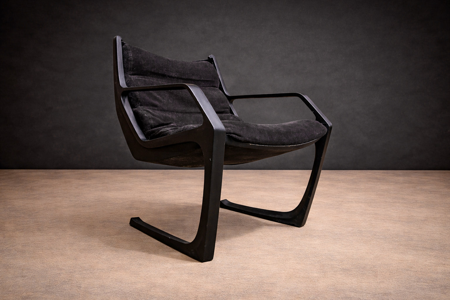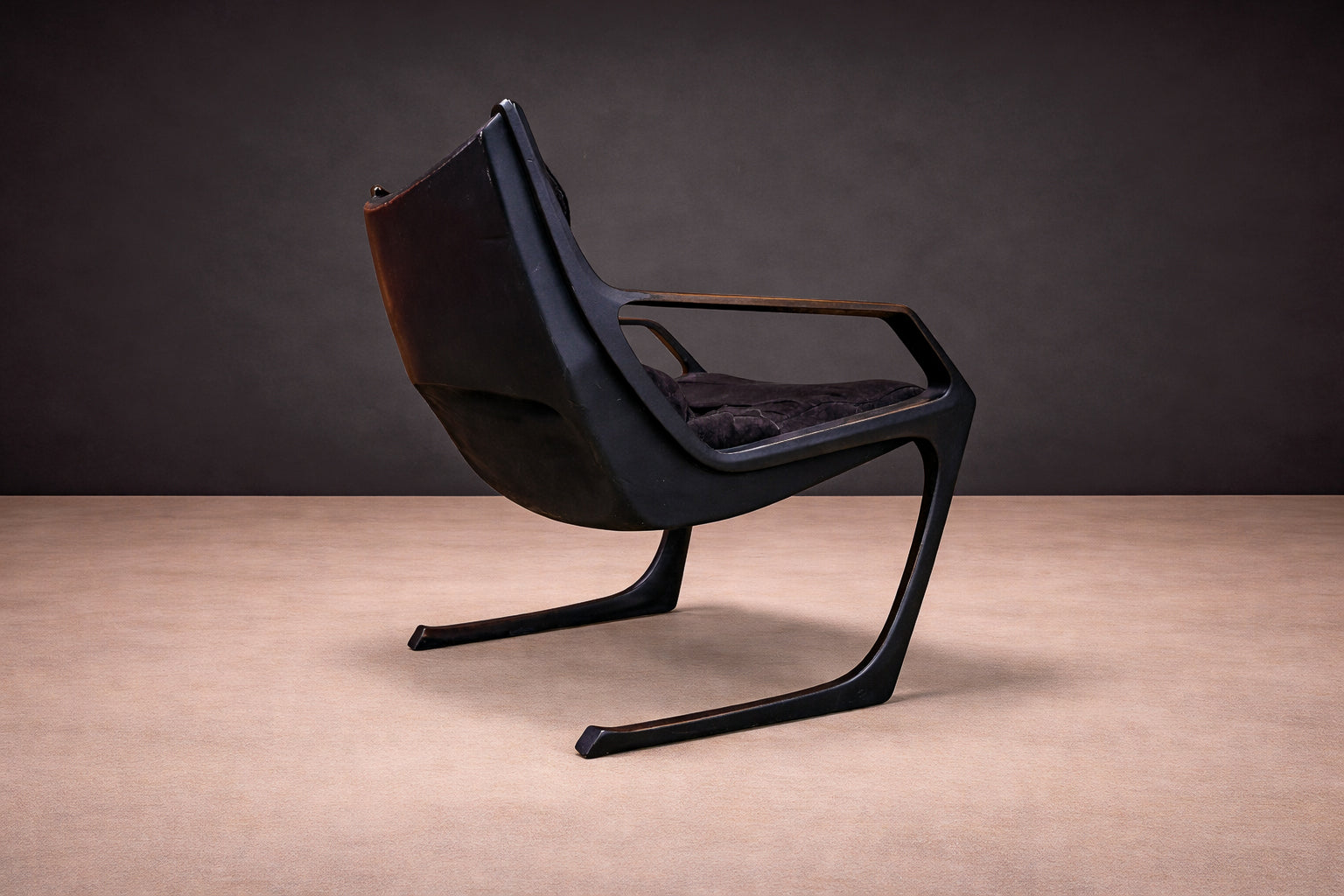 Deeply cushioned seat and back elements are suspended within the frame, allowing comfort to be integrated seamlessly into the structural logic. The upholstery—rendered in a dark, richly textured fabric—absorbs light and enhances the contrast between soft volume and rigid line. The result is a composition defined by tension: angular yet relaxed, architectural yet inviting.