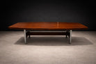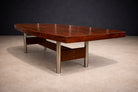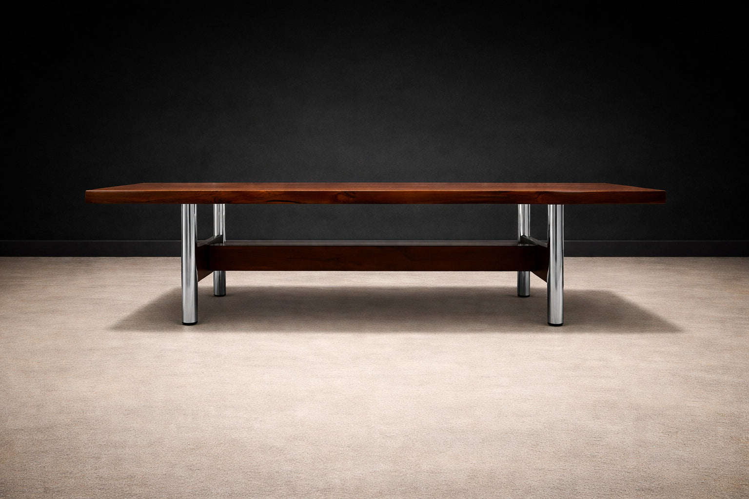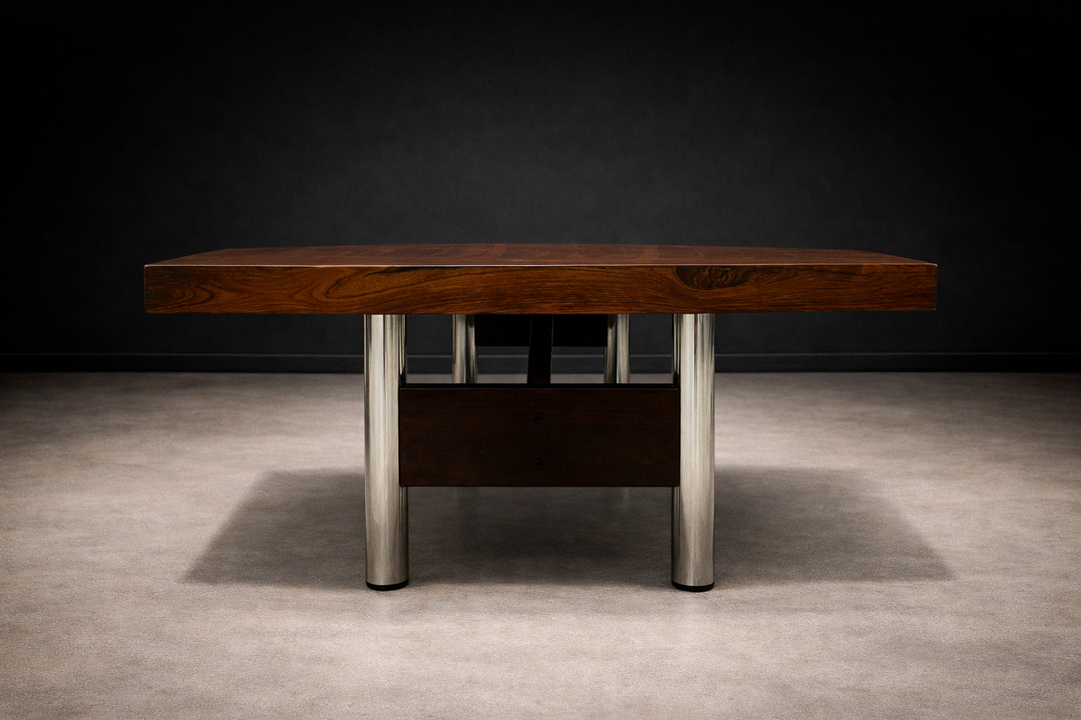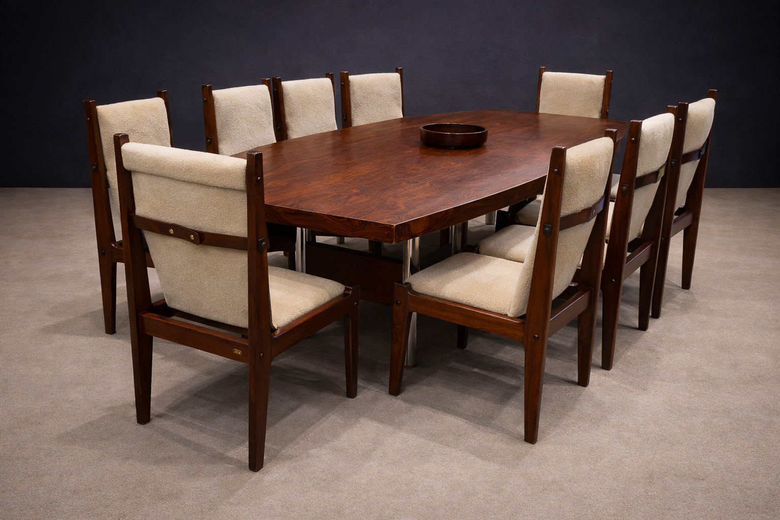 Originally used at the Central Bank of Brazil, the table exemplifies how Rodrigues translated the principles of Brazilian Modern design—material honesty, structural clarity, and human scale—into large-format furniture. The structure is crafted from Imbuia wood with a Brazilian rosewood (Jacaranda) veneer, recently applied to restore material continuity and visual coherence. The metal legs, newly re-plated, introduce rhythm and stability without overwhelming the composition.