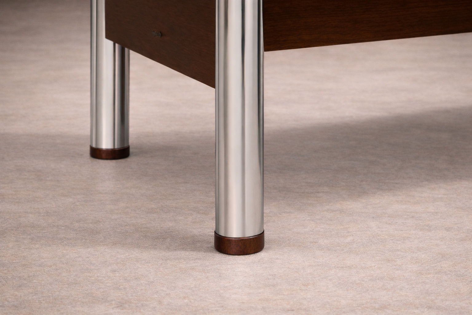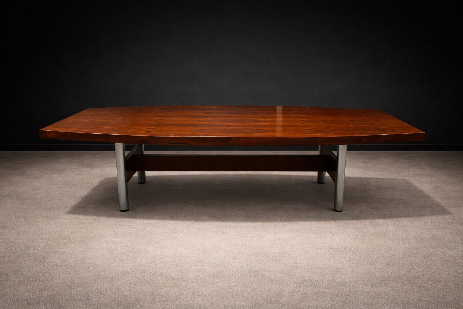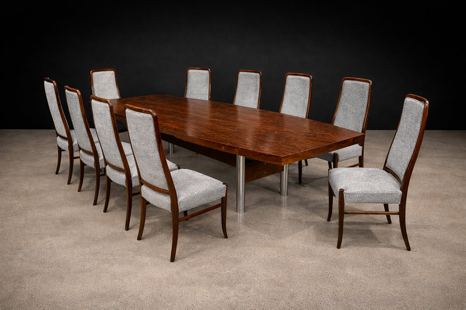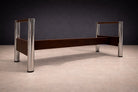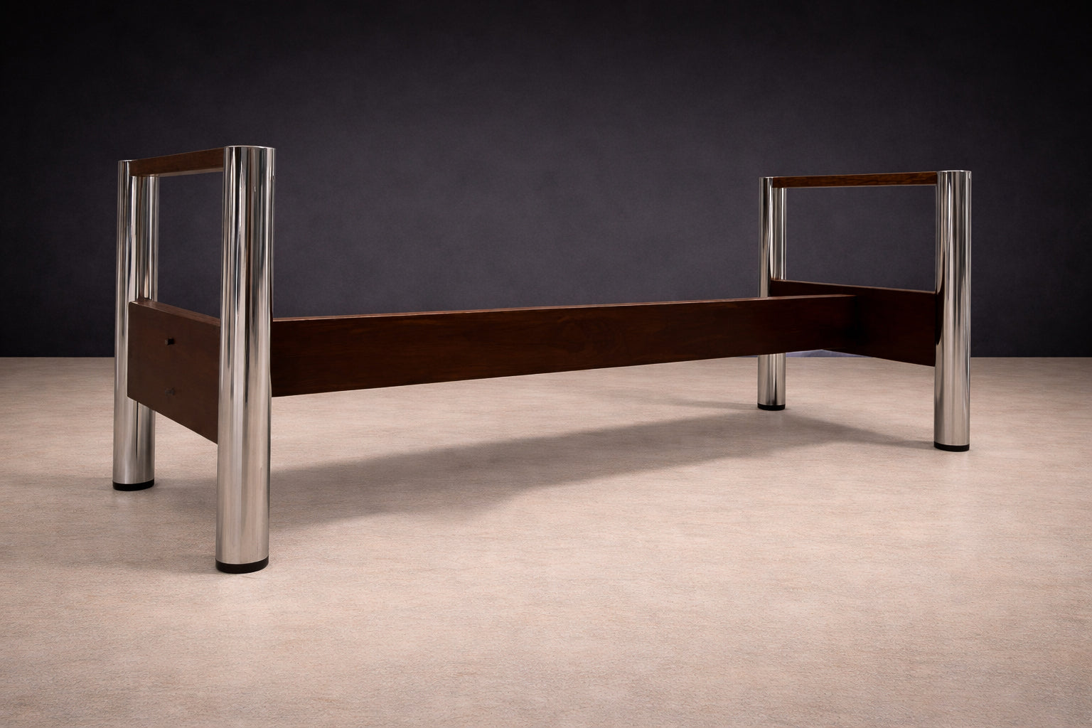 Originally used at the Central Bank of Brazil, the table exemplifies how Rodrigues translated the principles of Brazilian Modern design—material honesty, structural clarity, and human scale—into large-format furniture. The structure is crafted from Imbuia wood with a Brazilian rosewood (Jacaranda) veneer, recently applied to restore material continuity and visual coherence. The metal legs, newly re-plated, introduce rhythm and stability without overwhelming the composition.