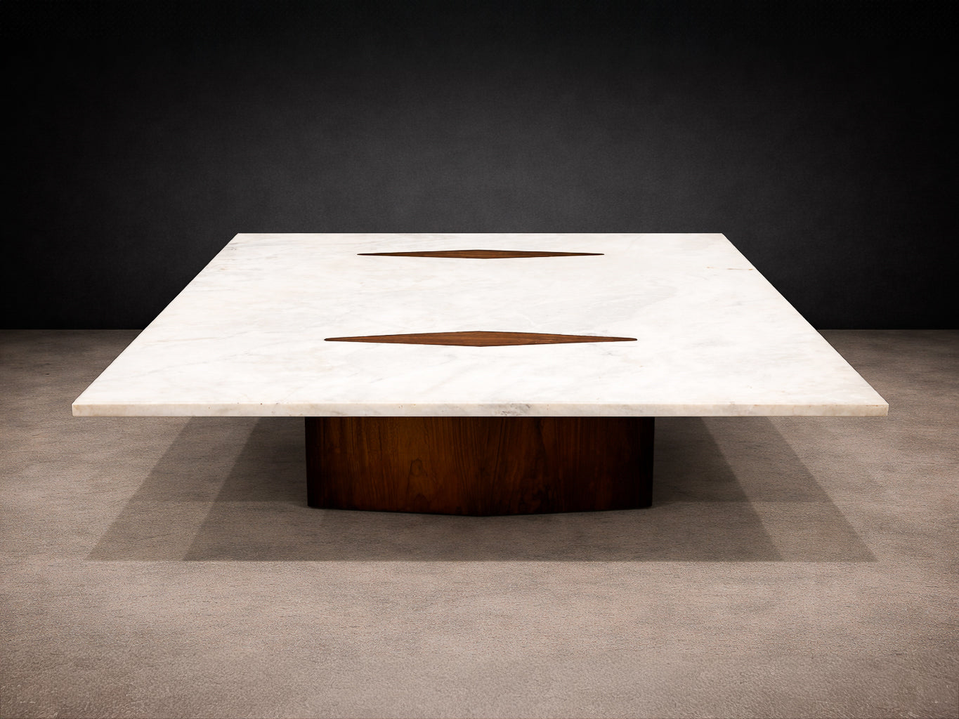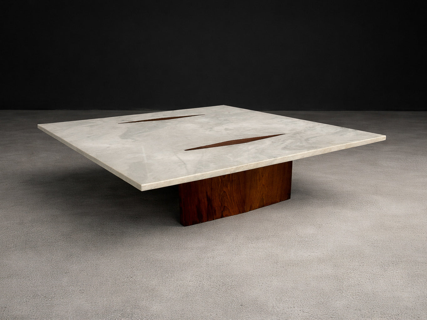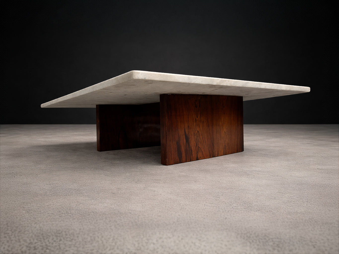 Zalszupin’s ingenious construction creates the illusion that the heavy stone surface floats effortlessly above its base, challenging conventional expectations of weight and balance. The precision with which the rosewood elements are embedded into the marble reflects the advanced craftsmanship and technical ambition characteristic of L’Atelier, Zalszupin’s São Paulo workshop, where modernist ideals were paired with meticulous execution.